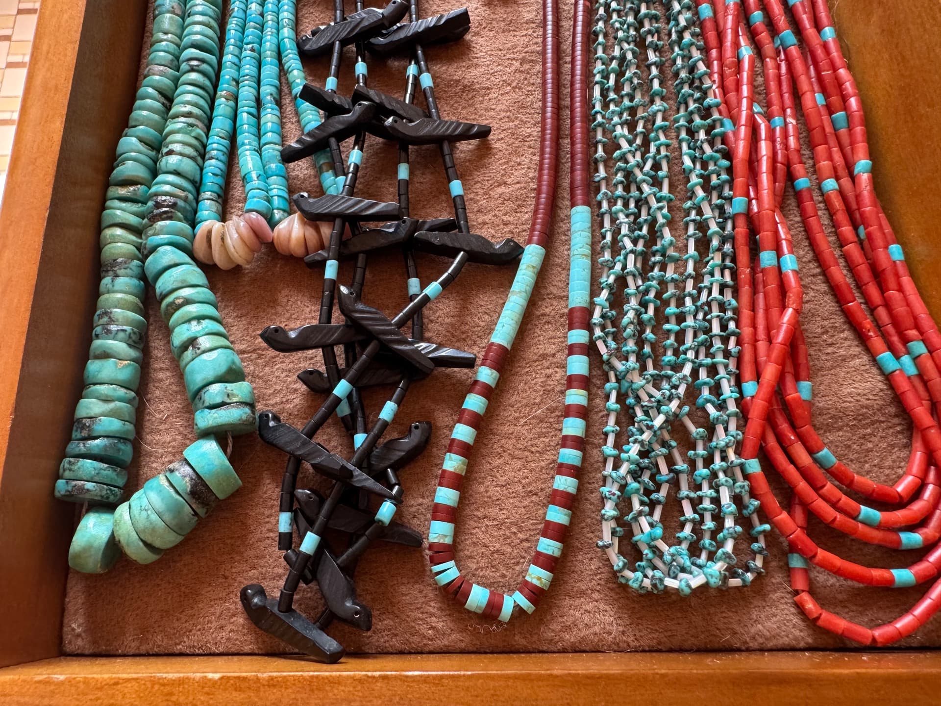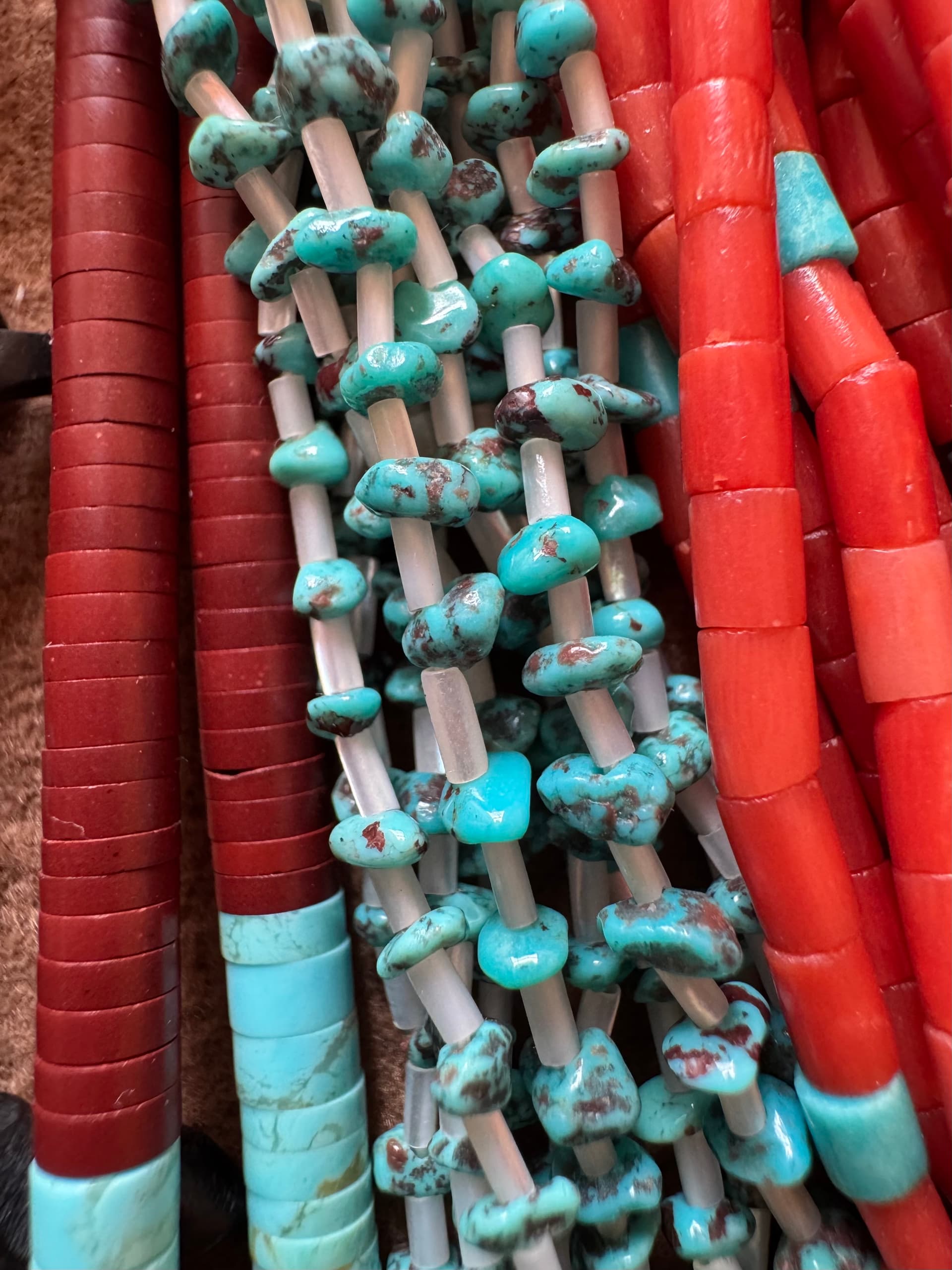 - The necklace on the furthest right is Pueblo made, coral and turquoise finished with Navajo silver beads.