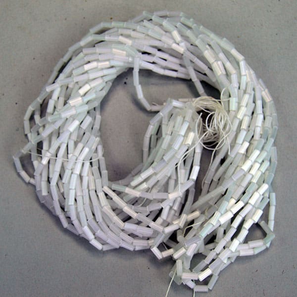 Thanks! When I first got the MOP necklace, I thought that they were actually iridescent bugle seed beads (see photo) because it never occurred to me that they could be shell and my eyesight has tanked the last 2 years. Even the seller had thought they were seed beads.