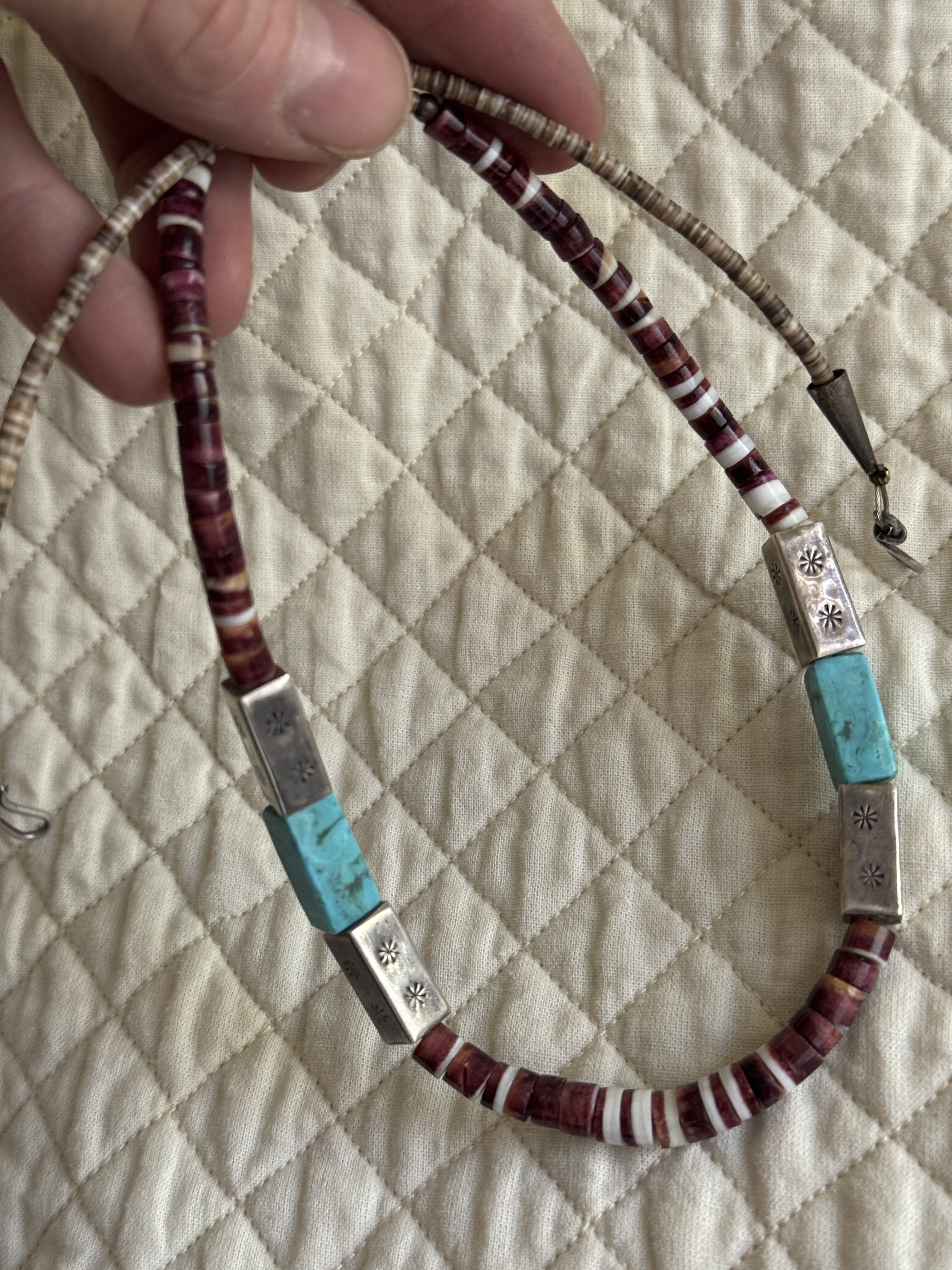 I popped in to the shop today and they had a turquoise chip and Heishi necklace on string similar to ones you have shared. I didn’t take a picture of it, but the necklaces in this photo are very similar to it. It has a hook and eye. At least one piece or turquoise had a crack, and they were asking $85….it was too long for me and not my style, but maybe I shouldn’t have passed it up.