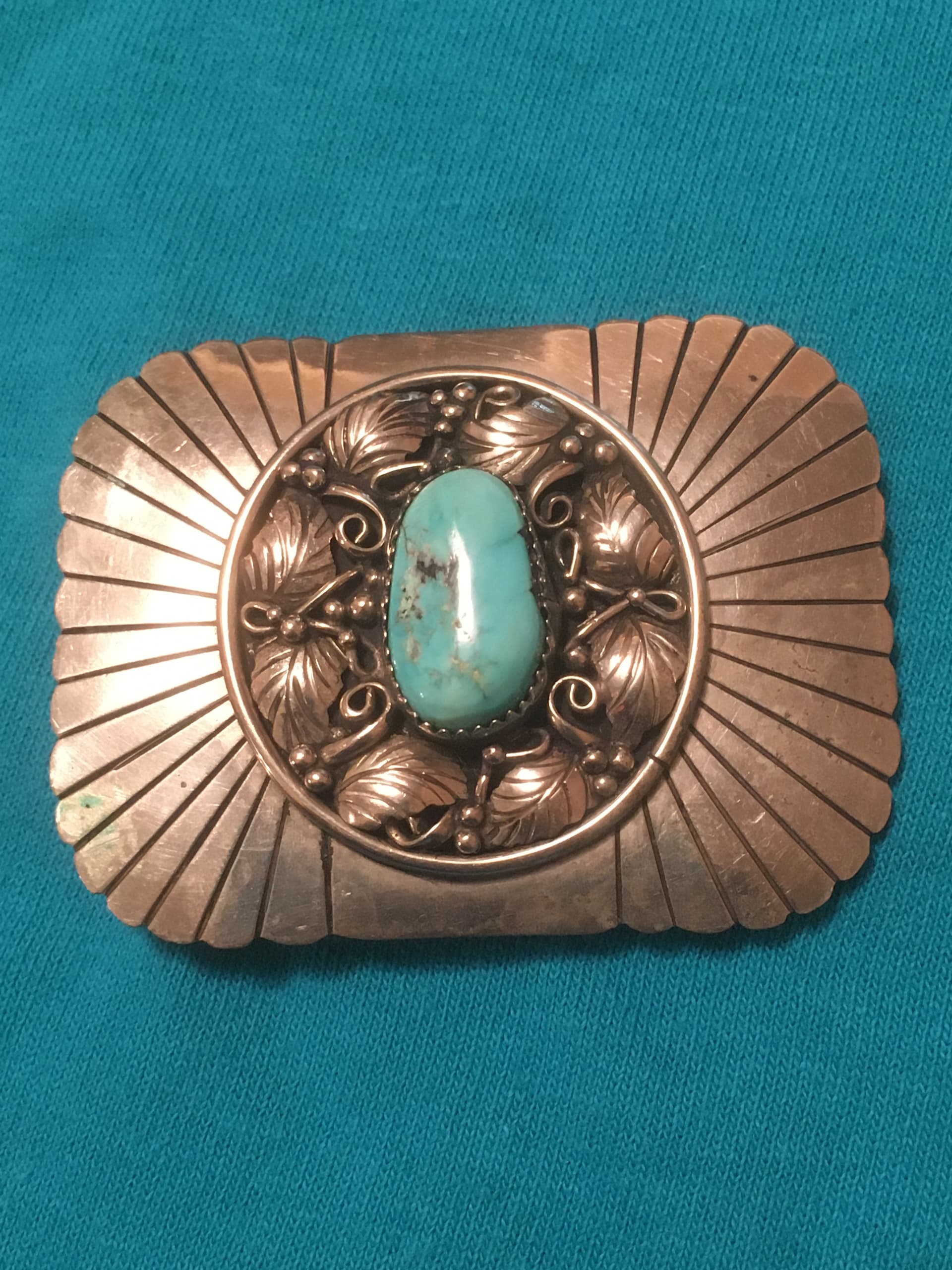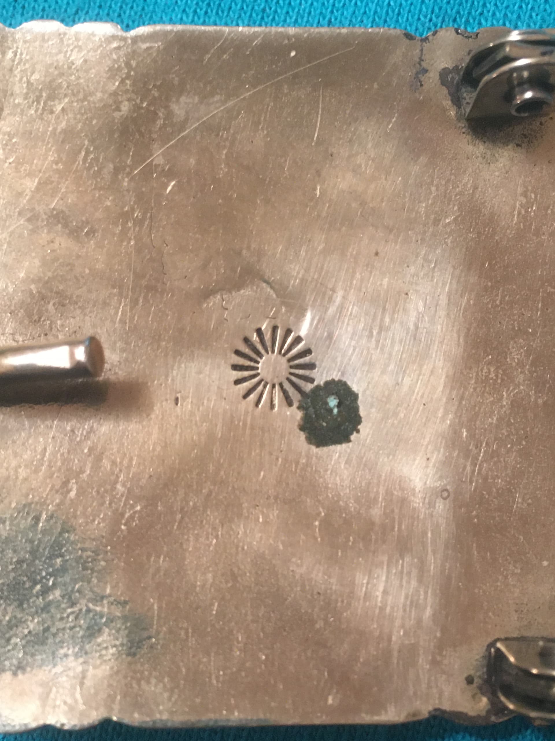 Any info on this belt buckle would be appreciated. Silver and turquoise. Sun hallmark. Also wondering if anyone can give an idea on the turquoise, which mine or what type…Thanks in advance:)