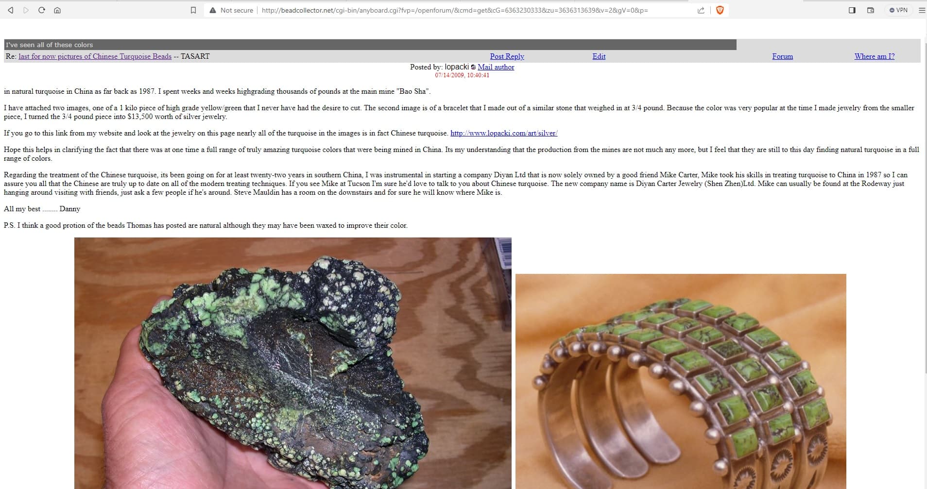 Ron Alexander, he was over there looking to open up a cutting factory and was the first guy to start importing turquoise from China into the US. GL Miller, Dan Lopacki and a few others were a part of that group of first to import group ![]()