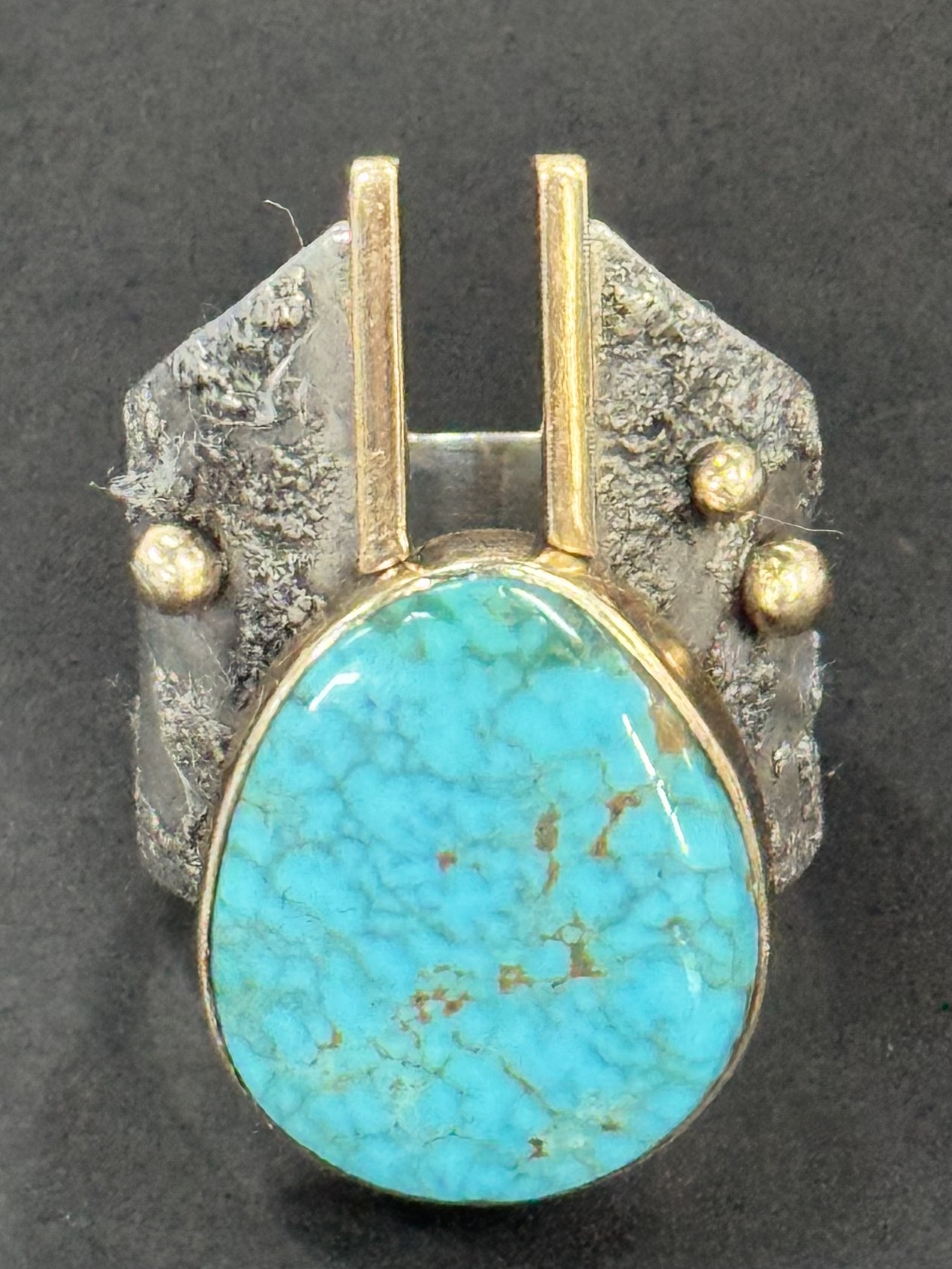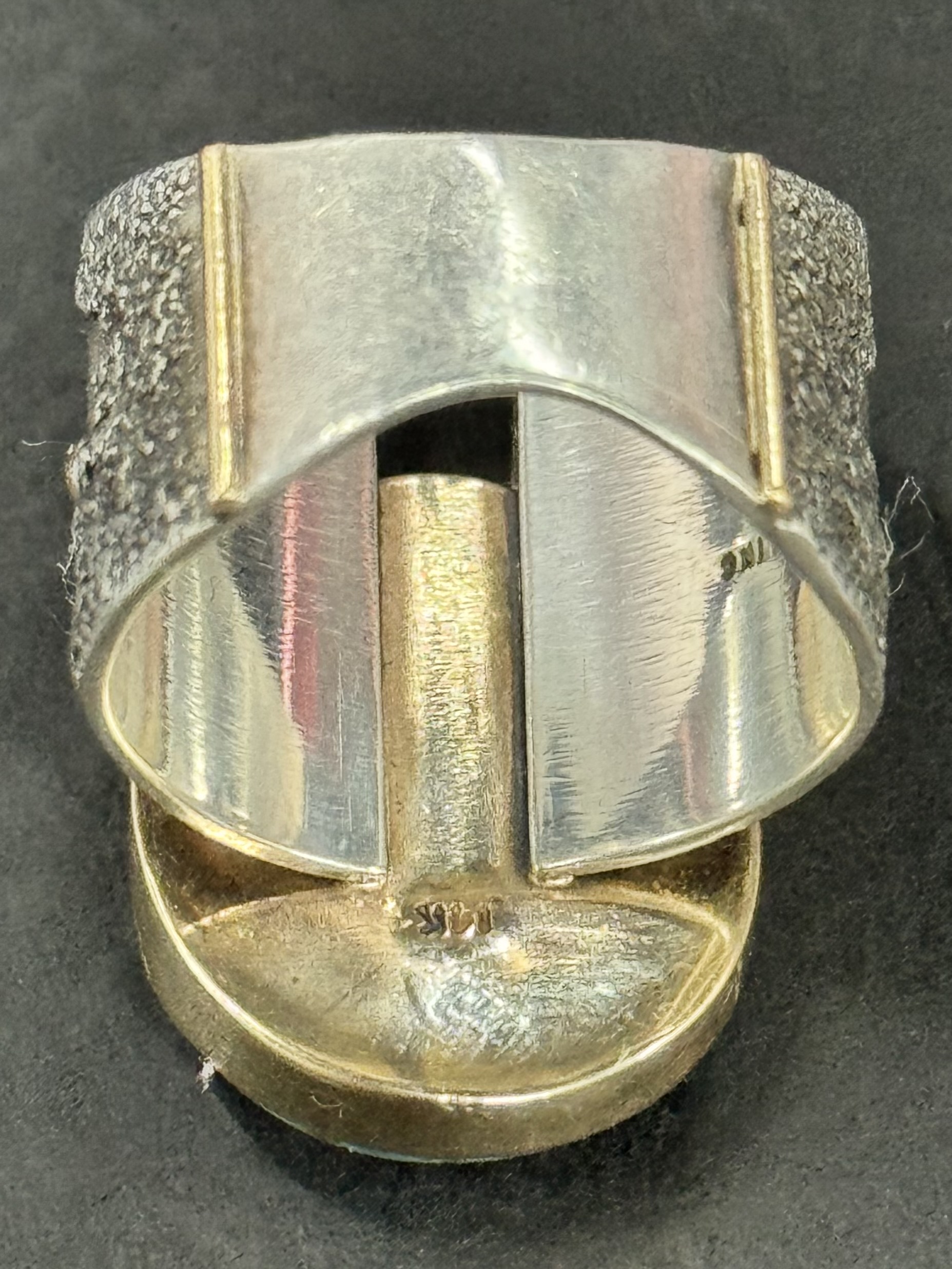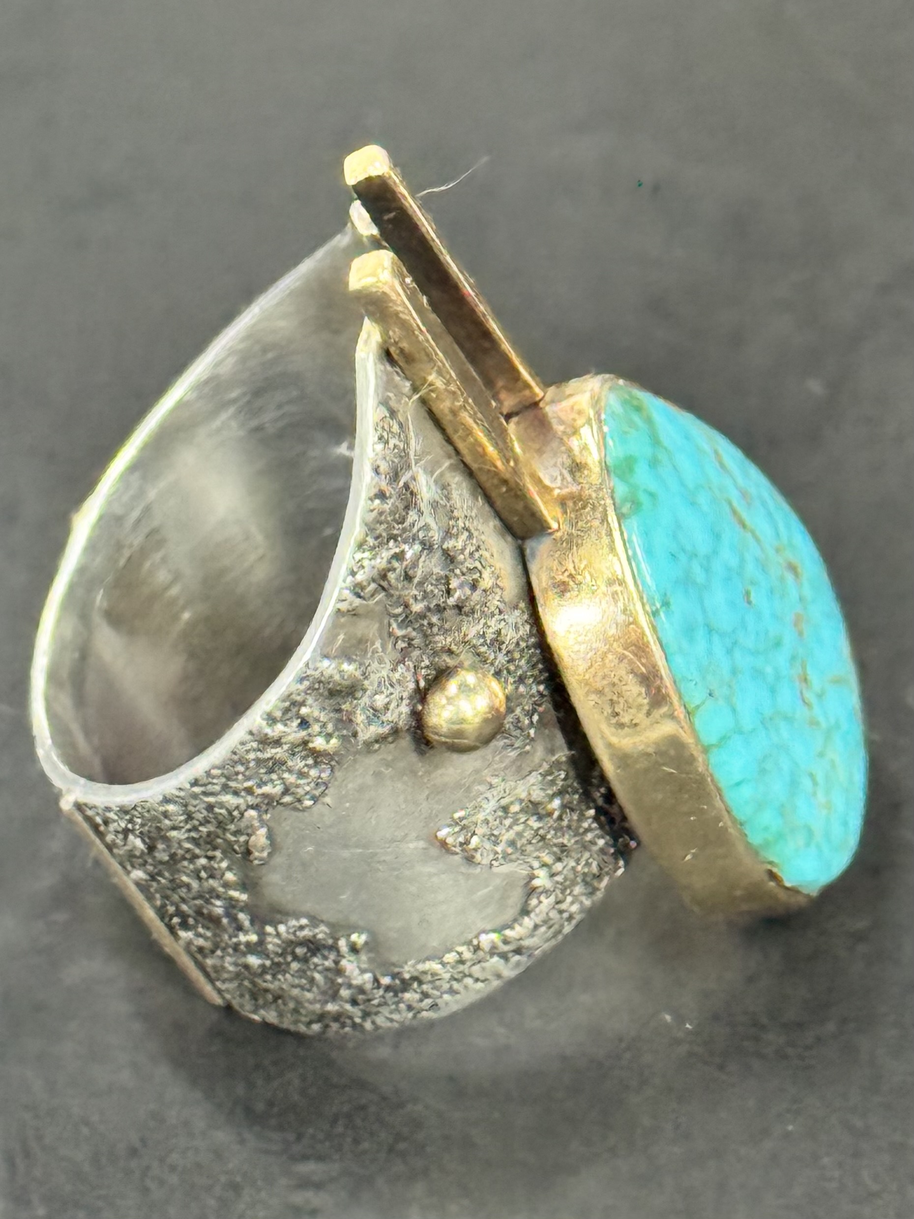 I have collected an interesting ring, but I’m facing the old problem again. I can’t recognize the handwritten English signature. This ring is very interesting. The materials and workmanship are both excellent, and the design is also very interesting. However, the turquoise is not even installed flat.