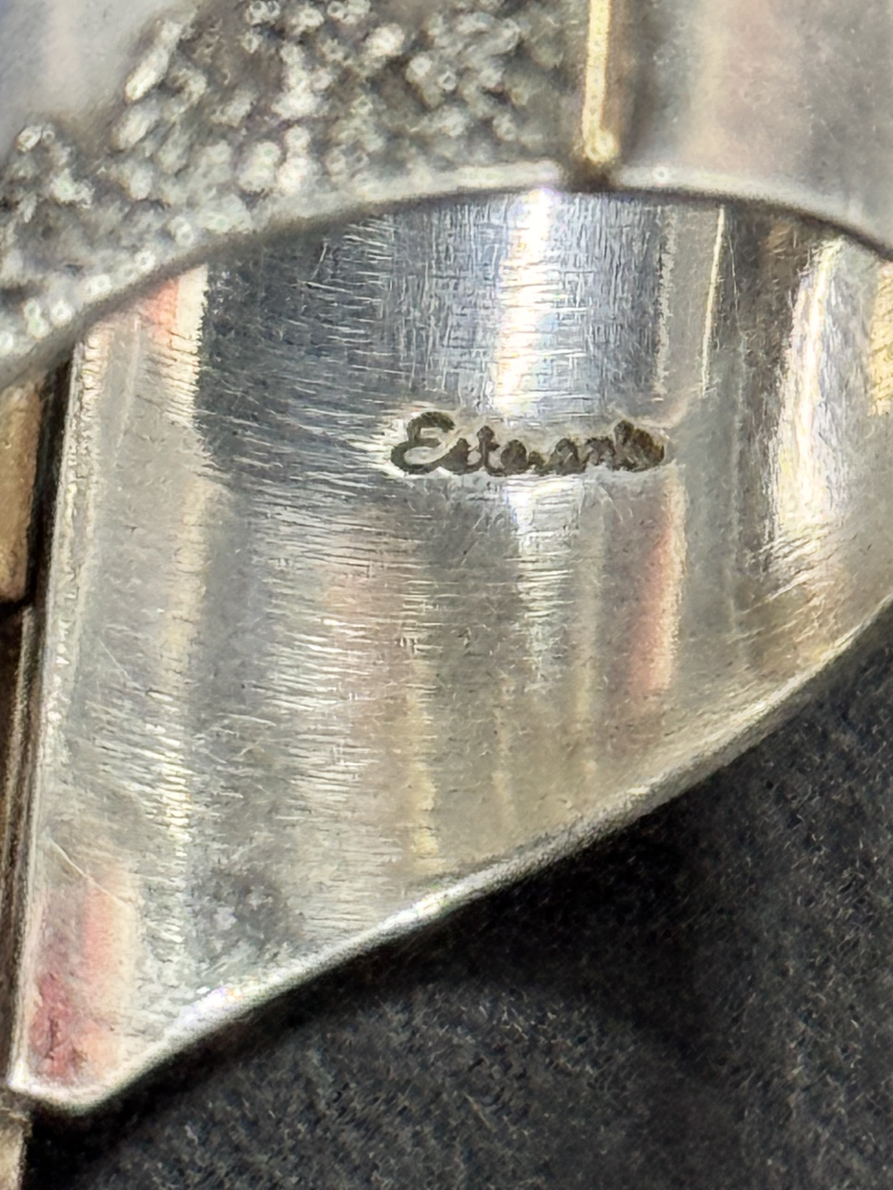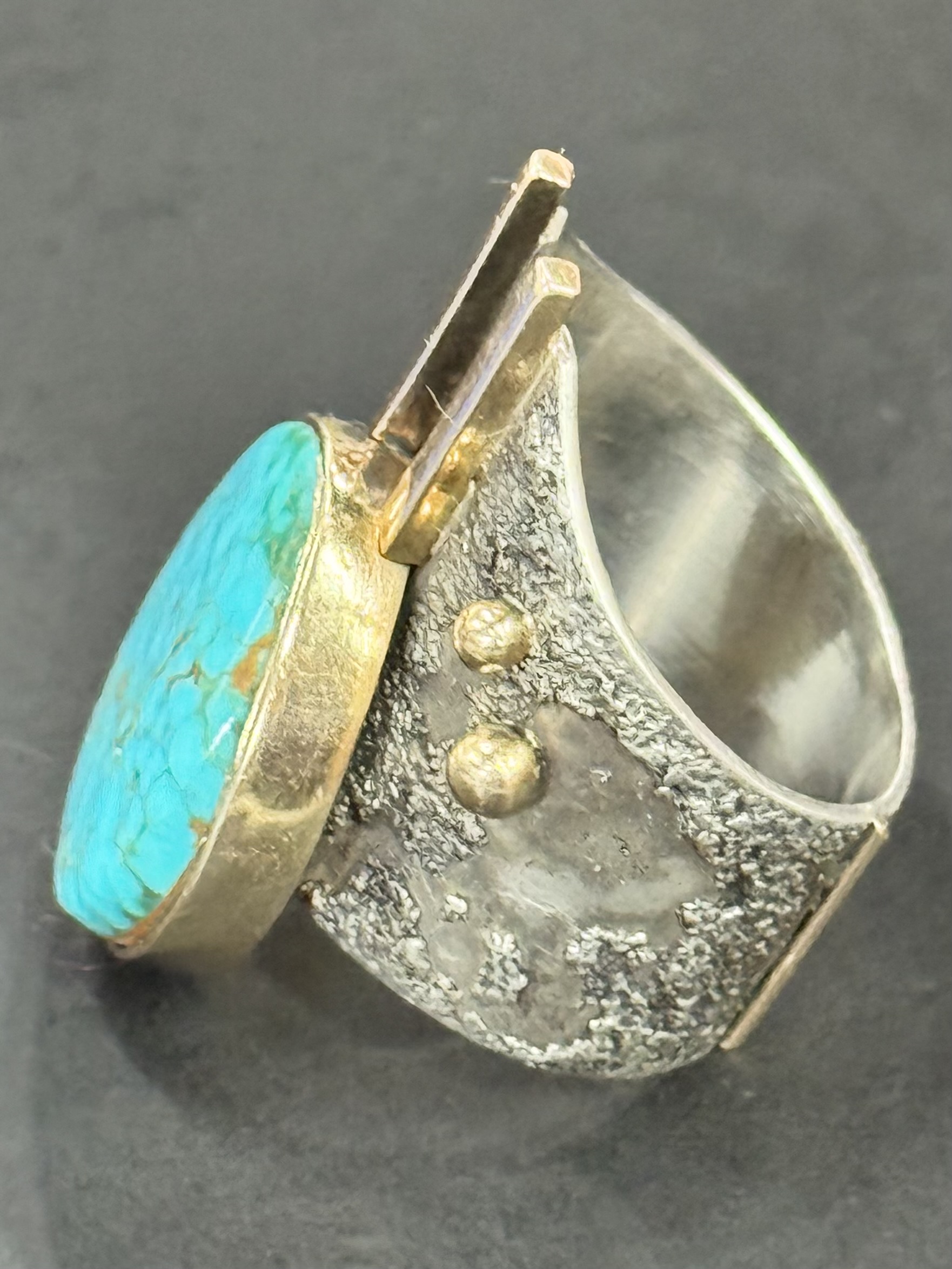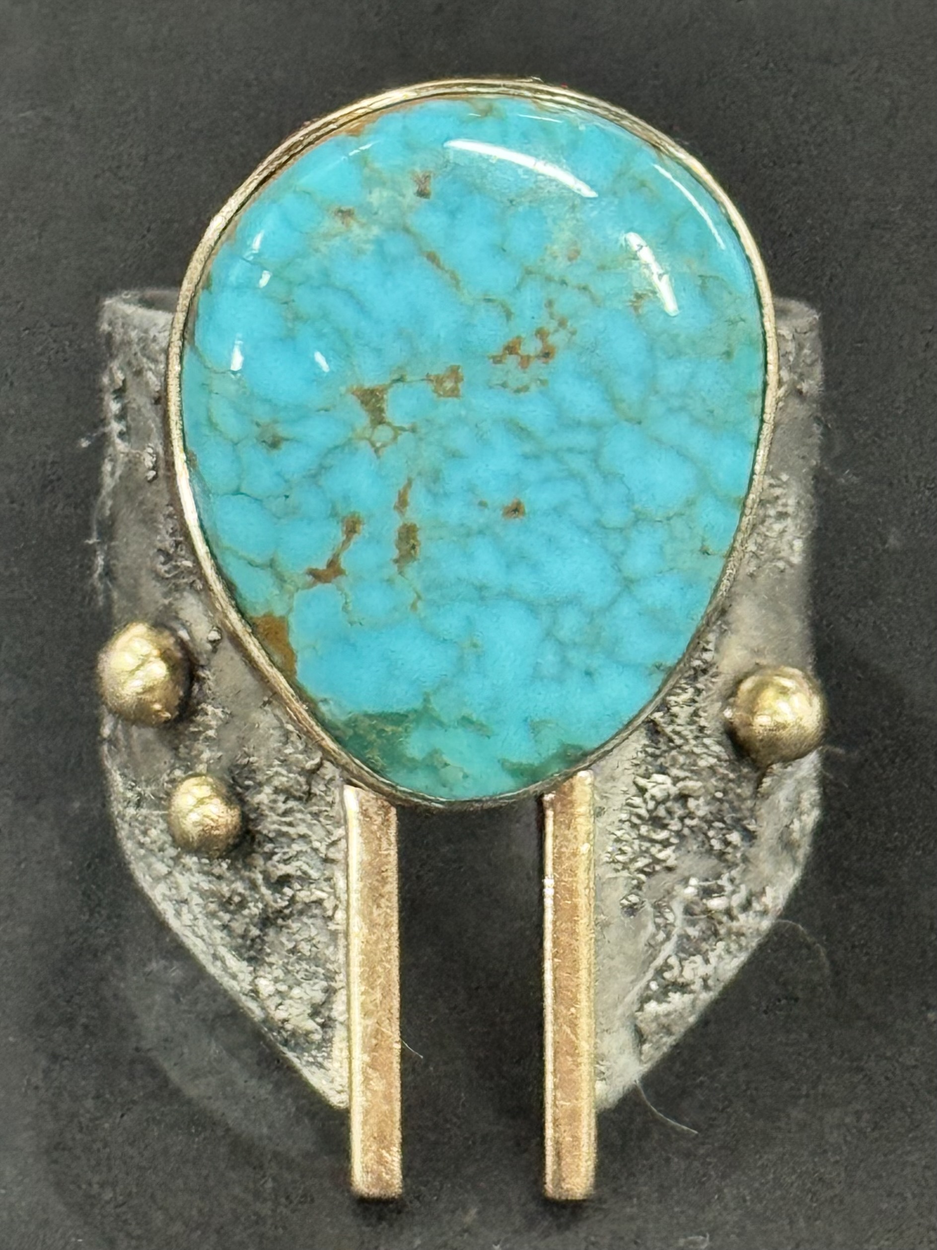 I have collected an interesting ring, but I’m facing the old problem again. I can’t recognize the handwritten English signature. This ring is very interesting. The materials and workmanship are both excellent, and the design is also very interesting. However, the turquoise is not even installed flat.