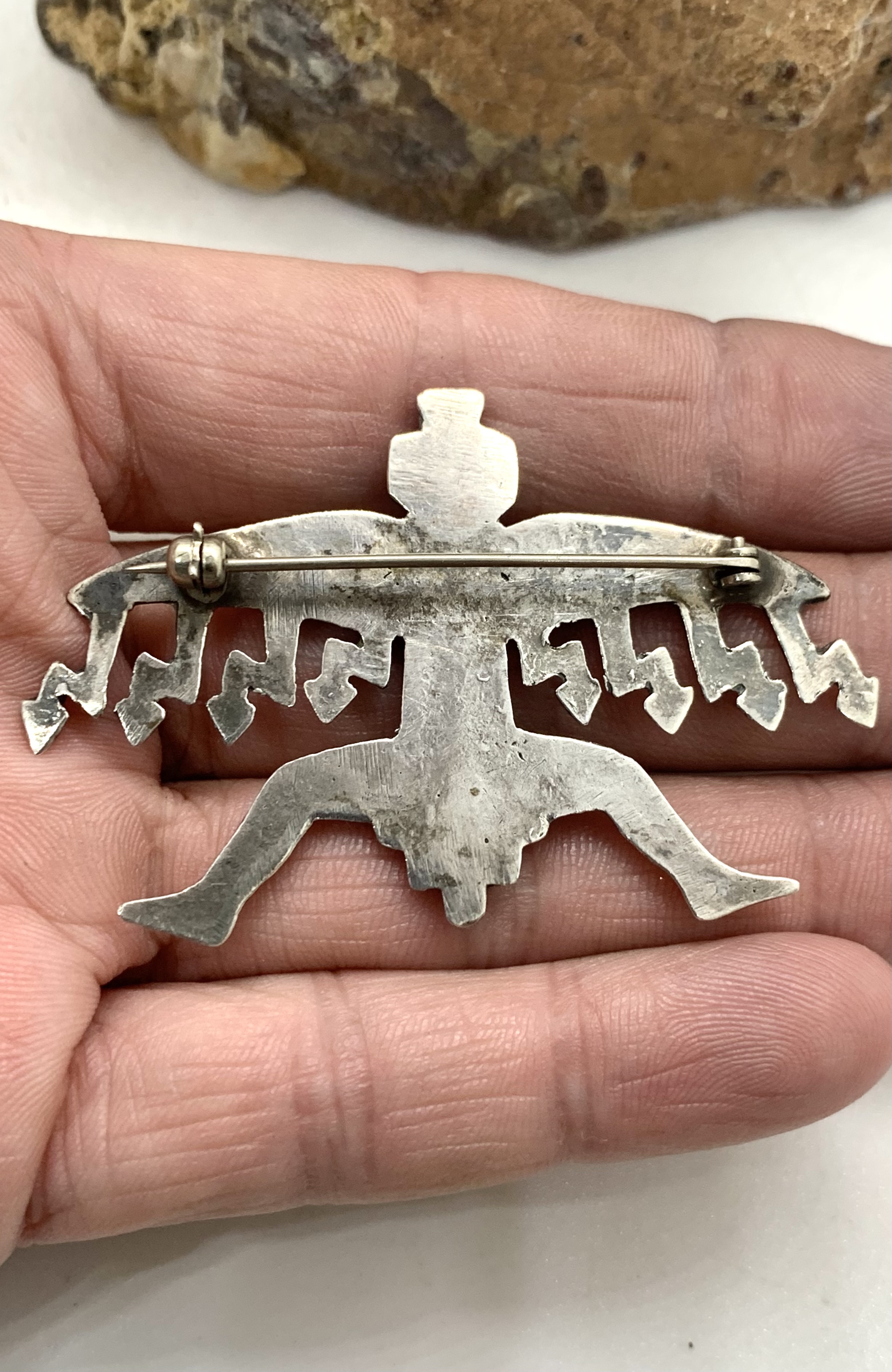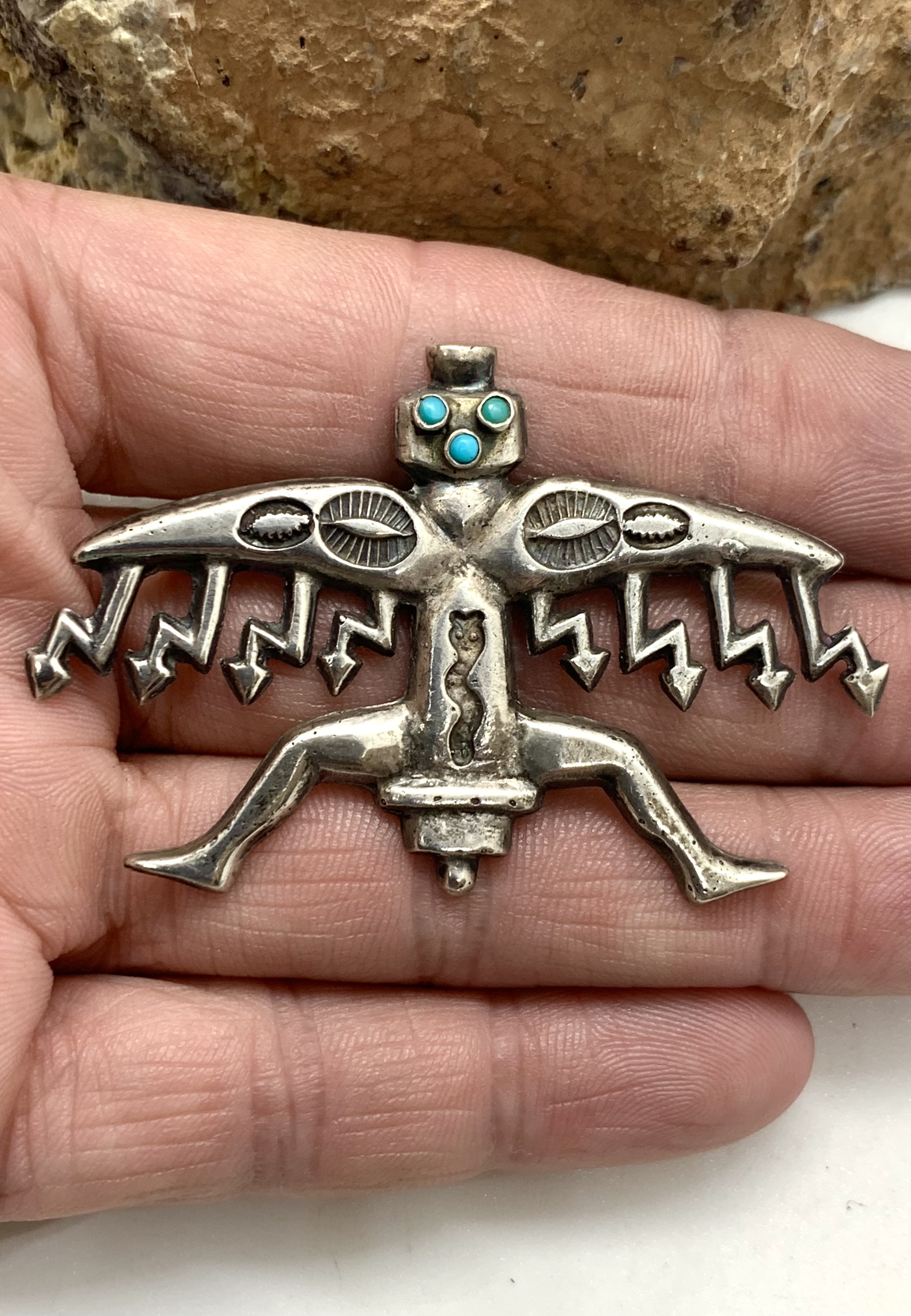 This won’t help with identifying the make of the brooch/pin but I think this could be a Snake Dancer kachina rather than a Knifewing. It has the snake on the front and I am wondering if the “wings” are really to represent rainclouds. I also think if it was a Knifewing it would have a flared tail. I think it is a supercool piece. I hope you can find out more.