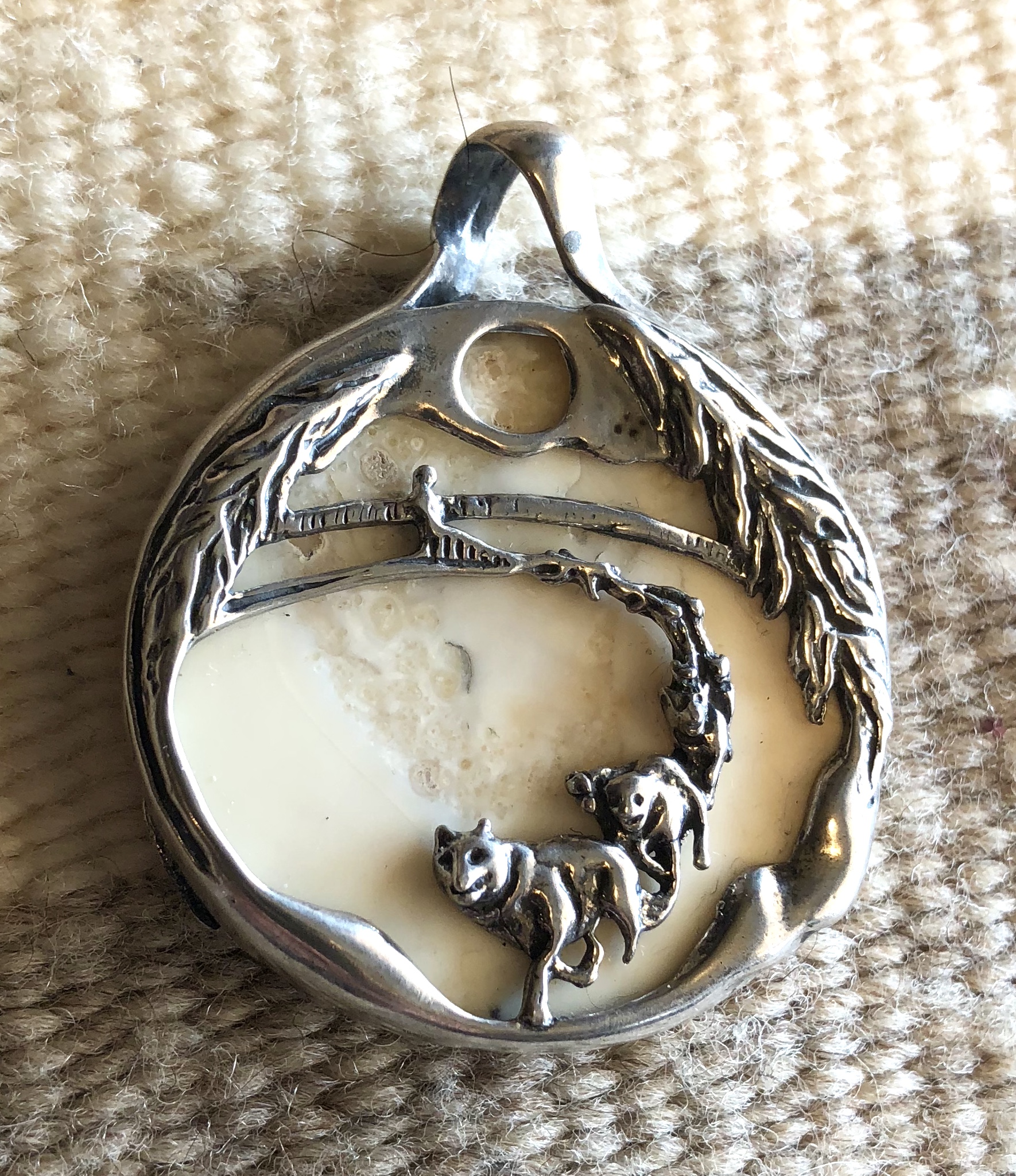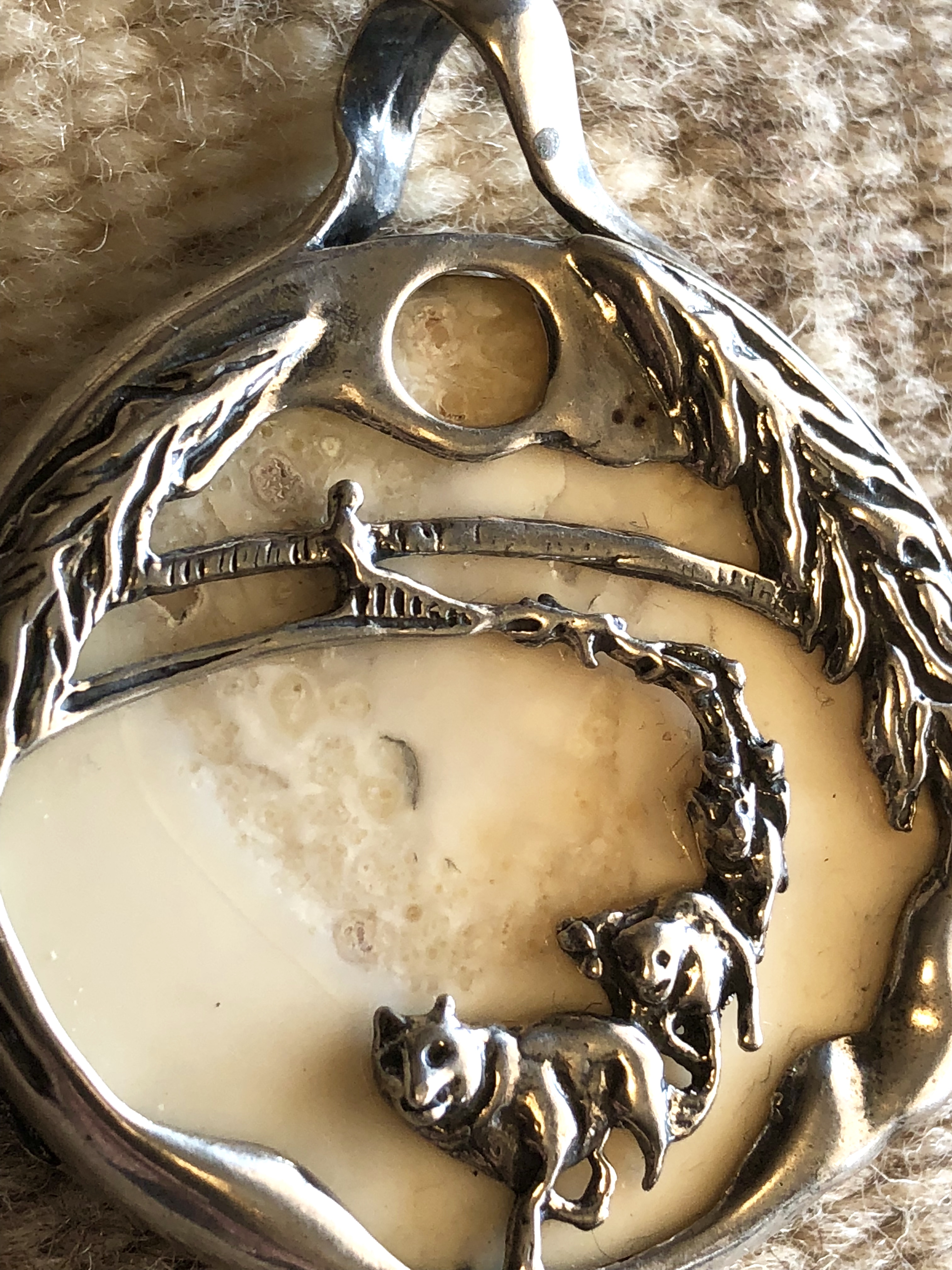 I didn’t want to be the first to say it, but I also believe this is a mineral, not animal bone or ivory. The back side looks like small Quartz pools… so my guess is a natural agate. I think it’s really cool how the artist picked a stone that mimics the moon. I’m not sure if it’s Native American or not… but it’s still really cool.