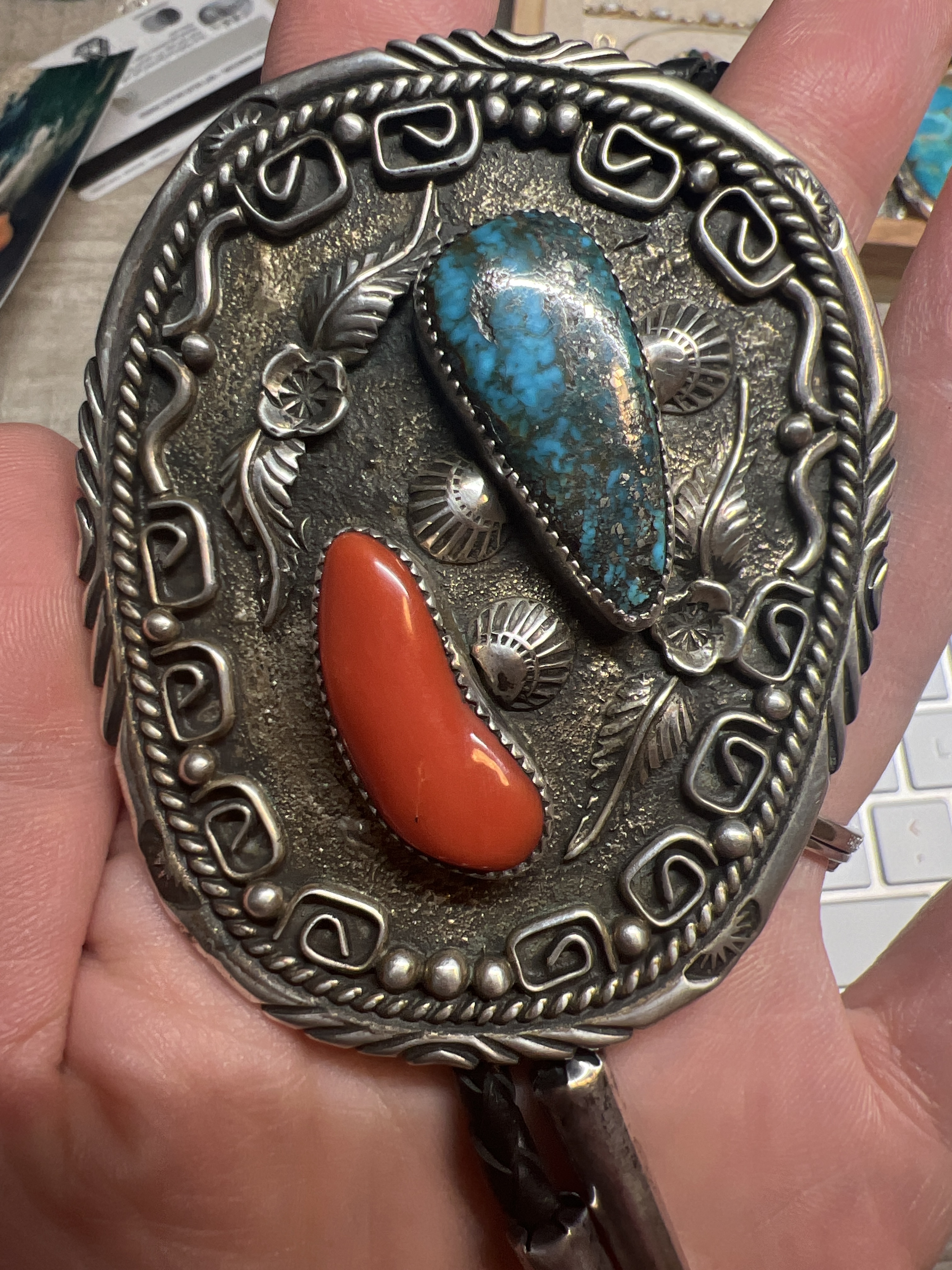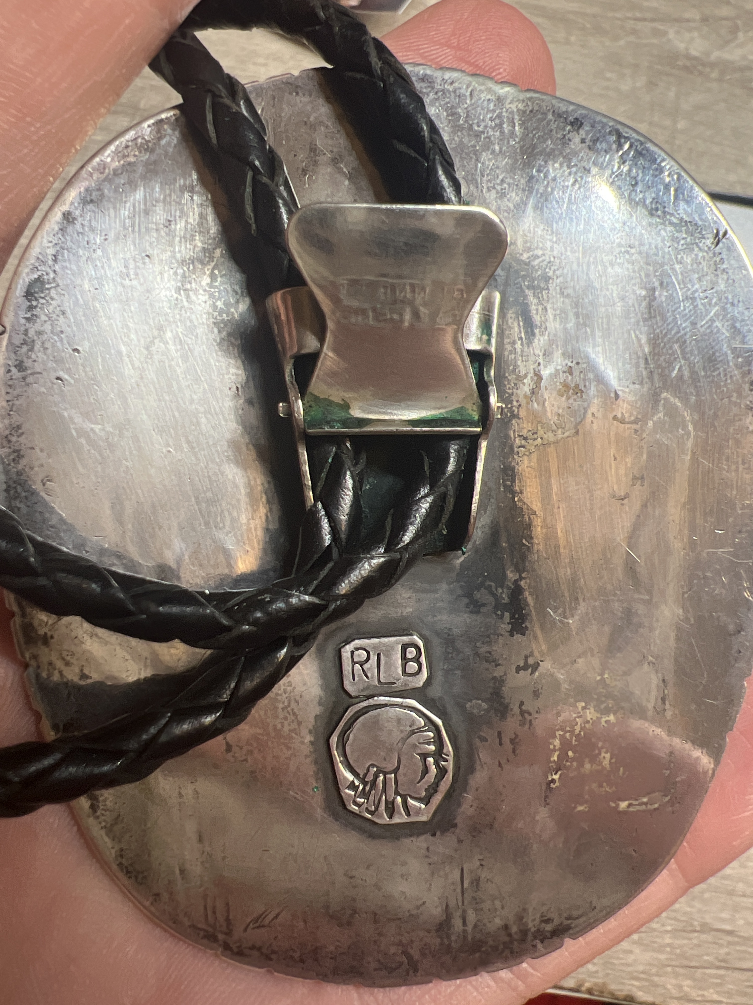 I recently purchased this sterling/turquoise/coral bolo tie. It was described as a piece by Robert Leekity/RLB. However, I just can’t find any info on that artist. The other RLB stamp I find is for Robert/Bernice Leekya. But then there’s also the picto underneath?! Hoping someone knows SOMEthing! Thanks a bunch!
