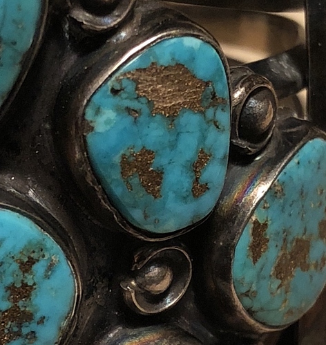 Thanks so much Pete! That is really interesting. I never realized that gemstones had magnetic properties. I did acid test the front of the bracelet and it is sterling silver which means the reaction to the magnet is coming from the turquoise. Even though the flecks look like gold I’m guessing it is Copper. Still trying to figure out what the turquoise might by. I’m wondering if it’s Morenci since the only info I can find about turquoise with heavy amounts of copper is Morenci. If there are any rock hounds out there or experts in turquoise please help!