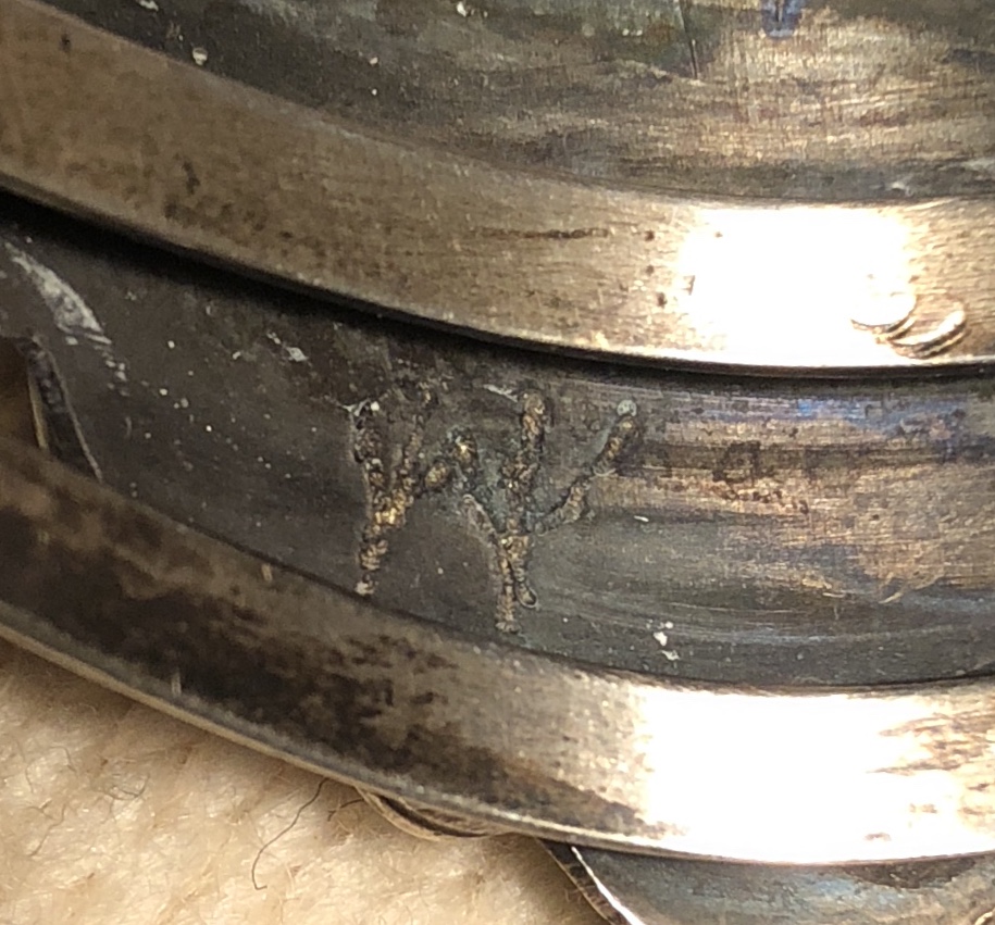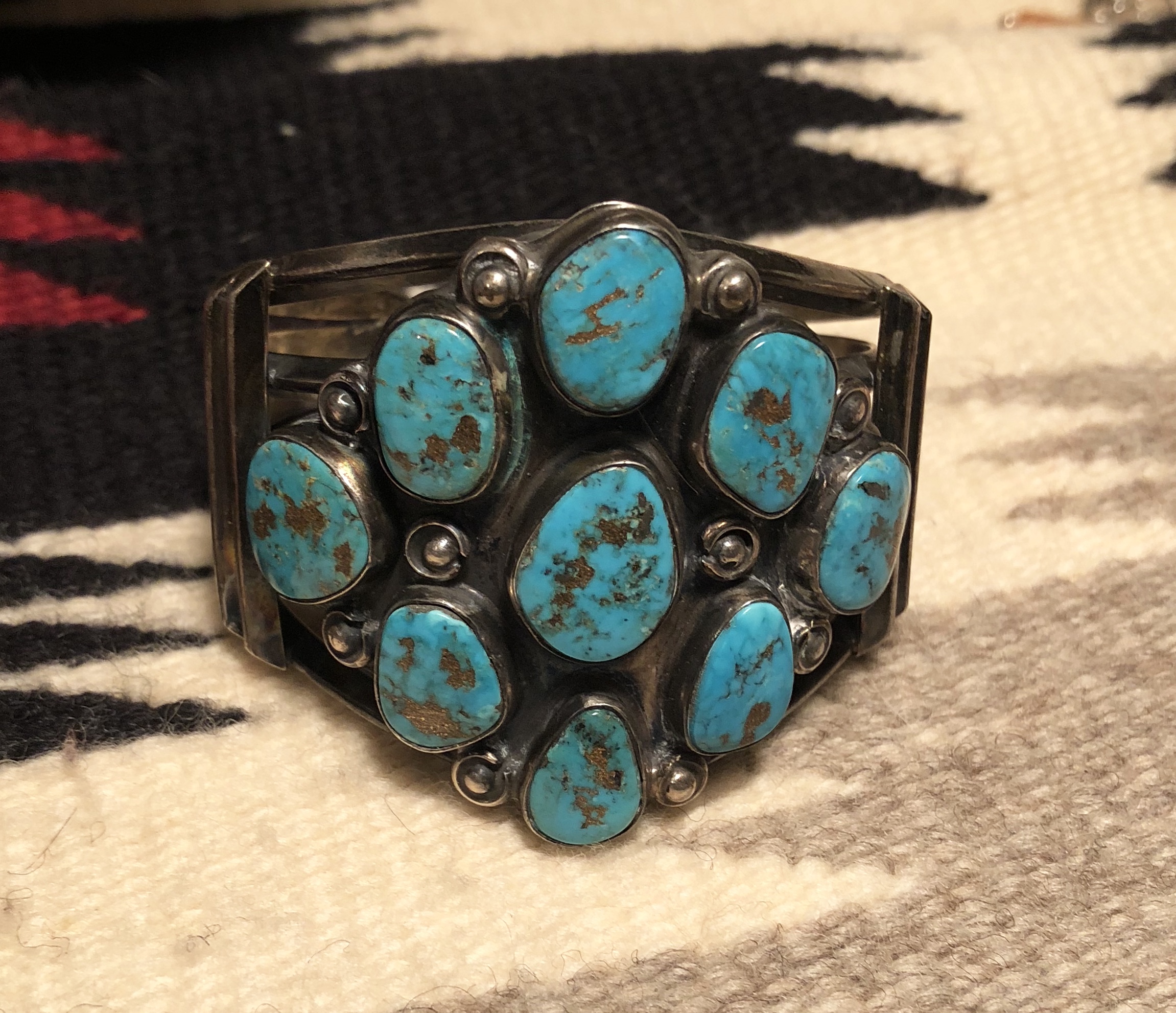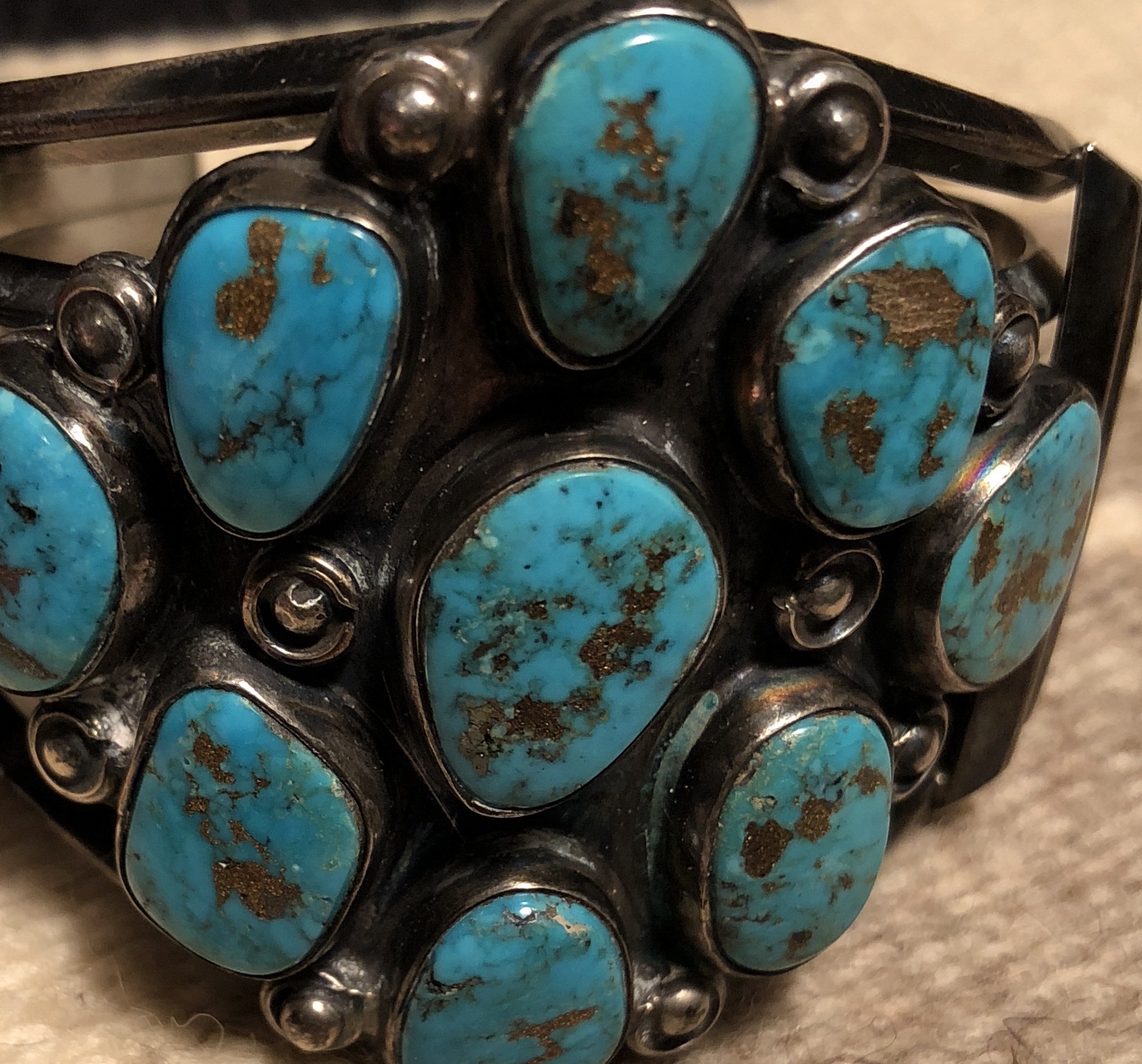 I have an amazing bracelet with some unusual turquoise. It looks as though there are sections of gold in it. In other places it looks more like copper. It’s an older piece and is made of sterling but the section with the stones react to a magnet so I’m thinking that part is nickel silver? The signature is not legible and is scratched into the metal deeply. Here’s pics. Any help would be appreciated!
