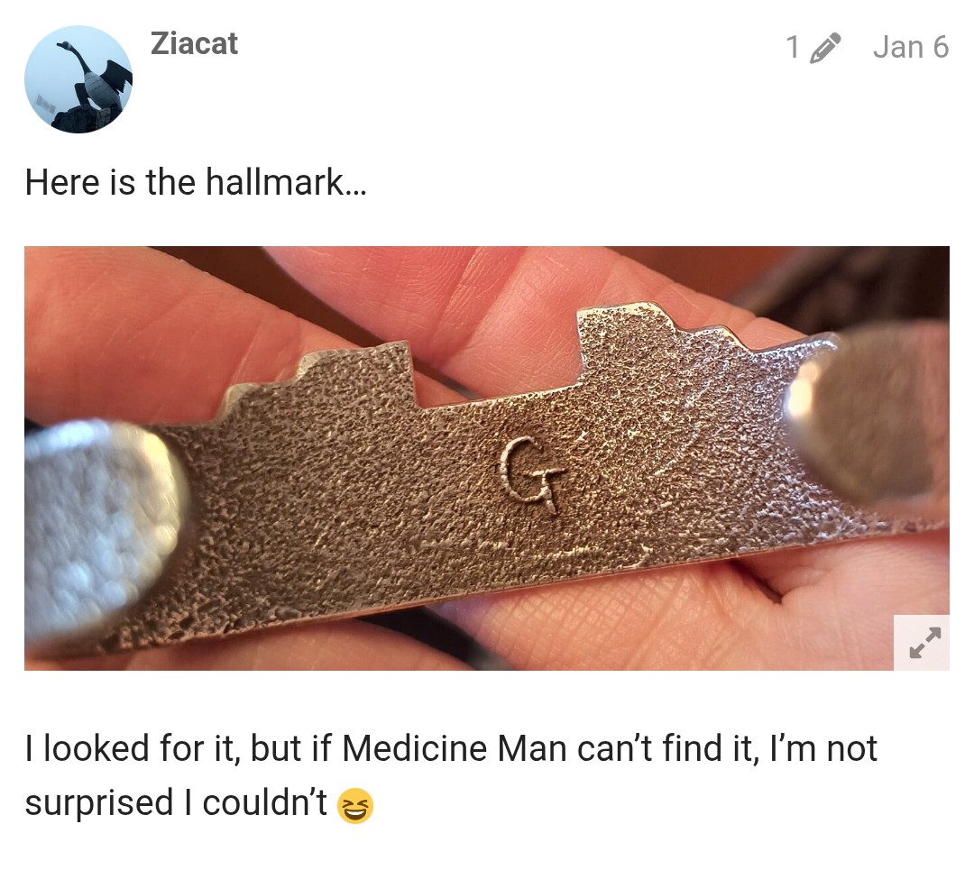 I agree with Zia that it’s anybody’s guess. Also, considering it’s a relatively common practice to conjoin letters in this manner for a hallmark, (bear with me here, guys) it may not even be the same artist that crafted Zia’s beautiful, drop dead gorgeous cuff. At the very least, it’s a possibility that shouldn’t be discounted, I feel.