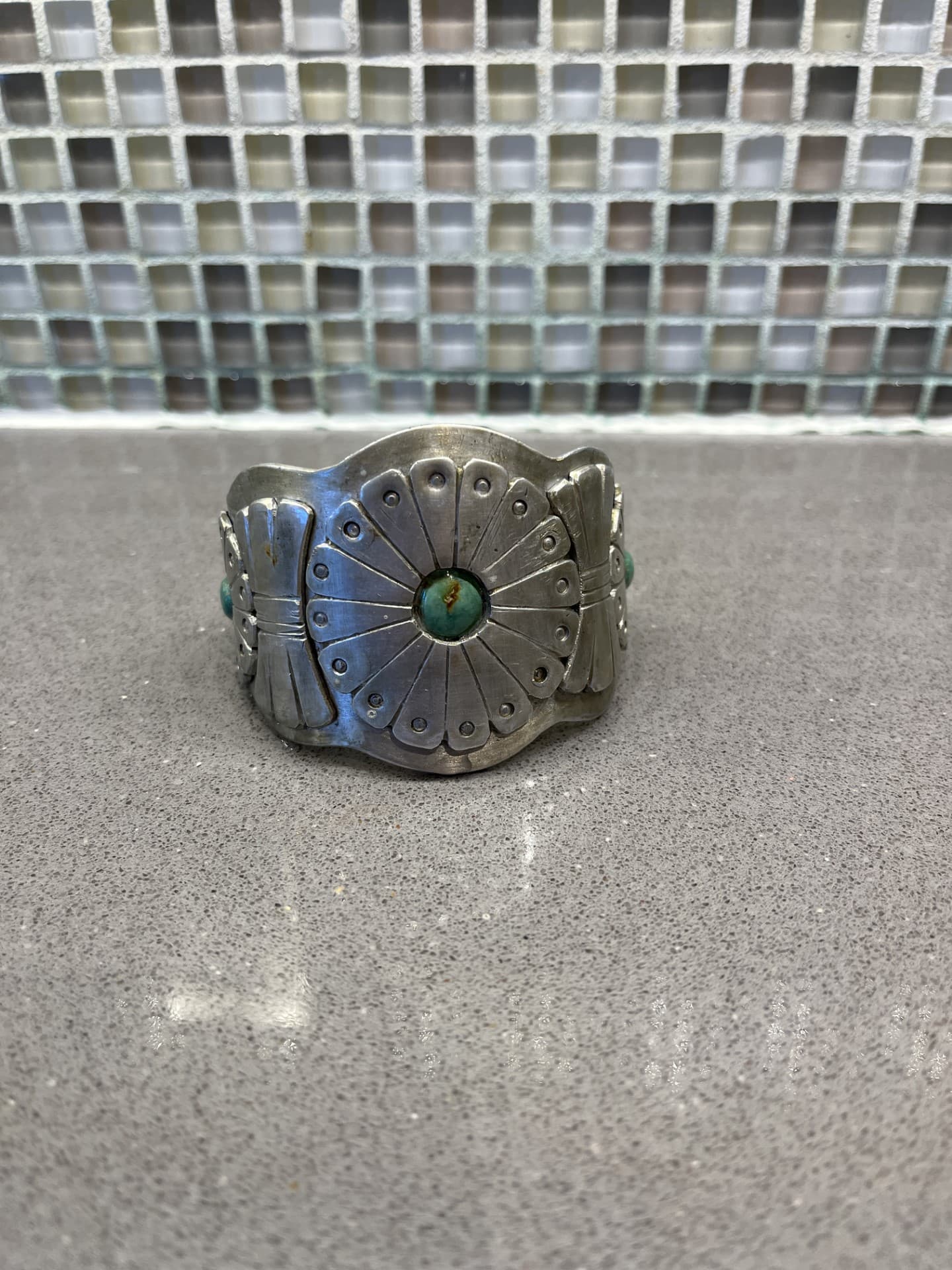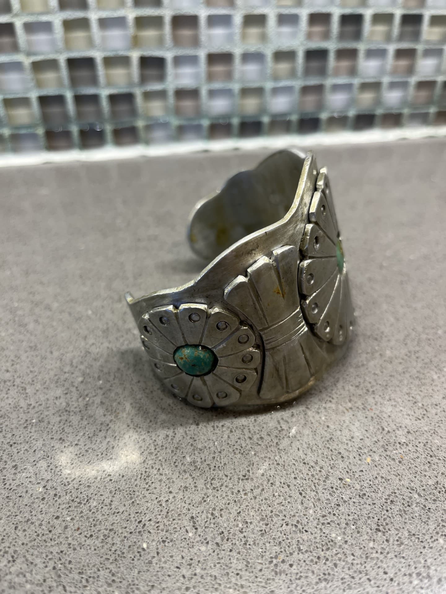 Trying to figure out what this is all about. Appears to have three small turquoise pieces. Metal is heavy.