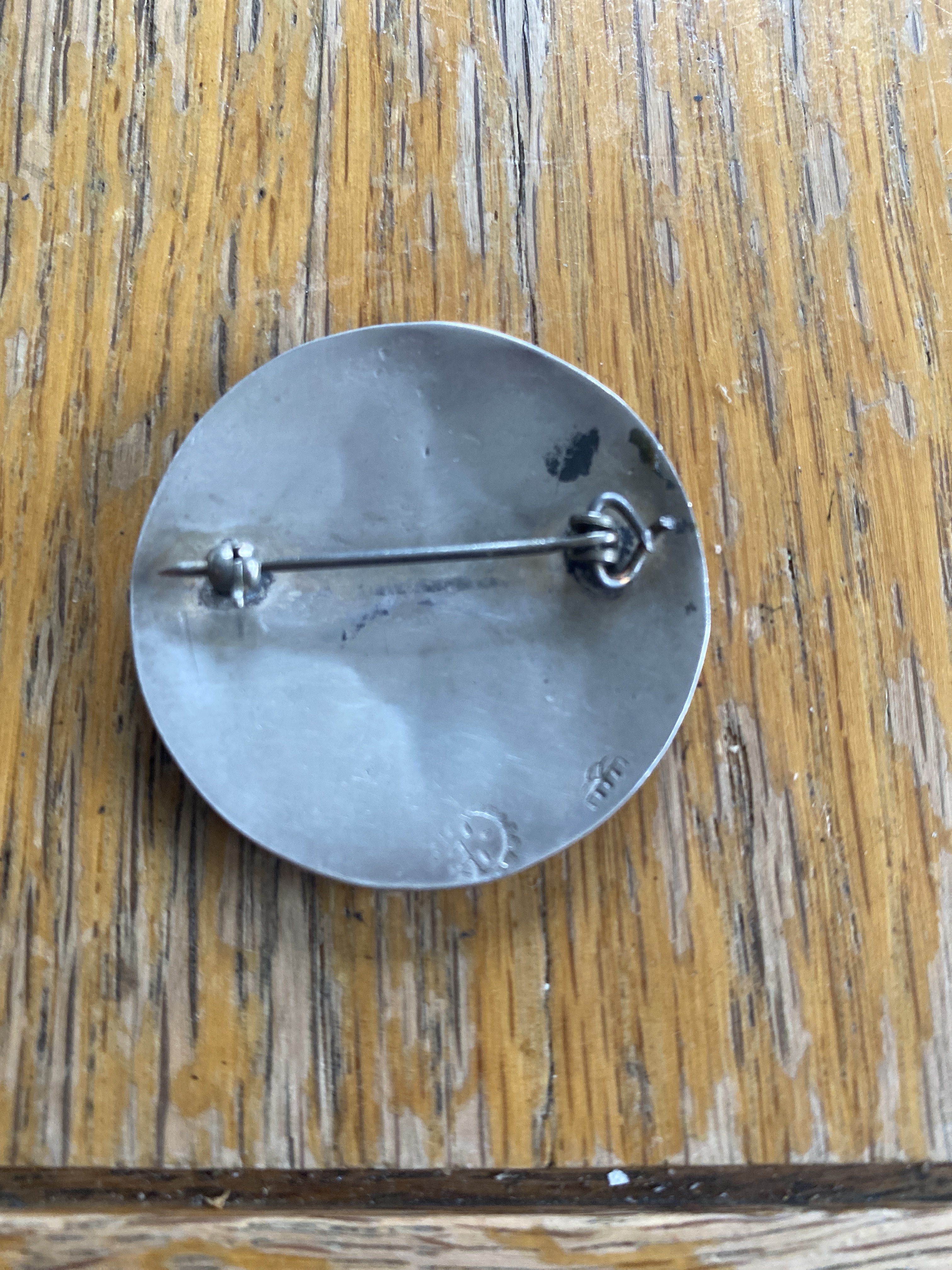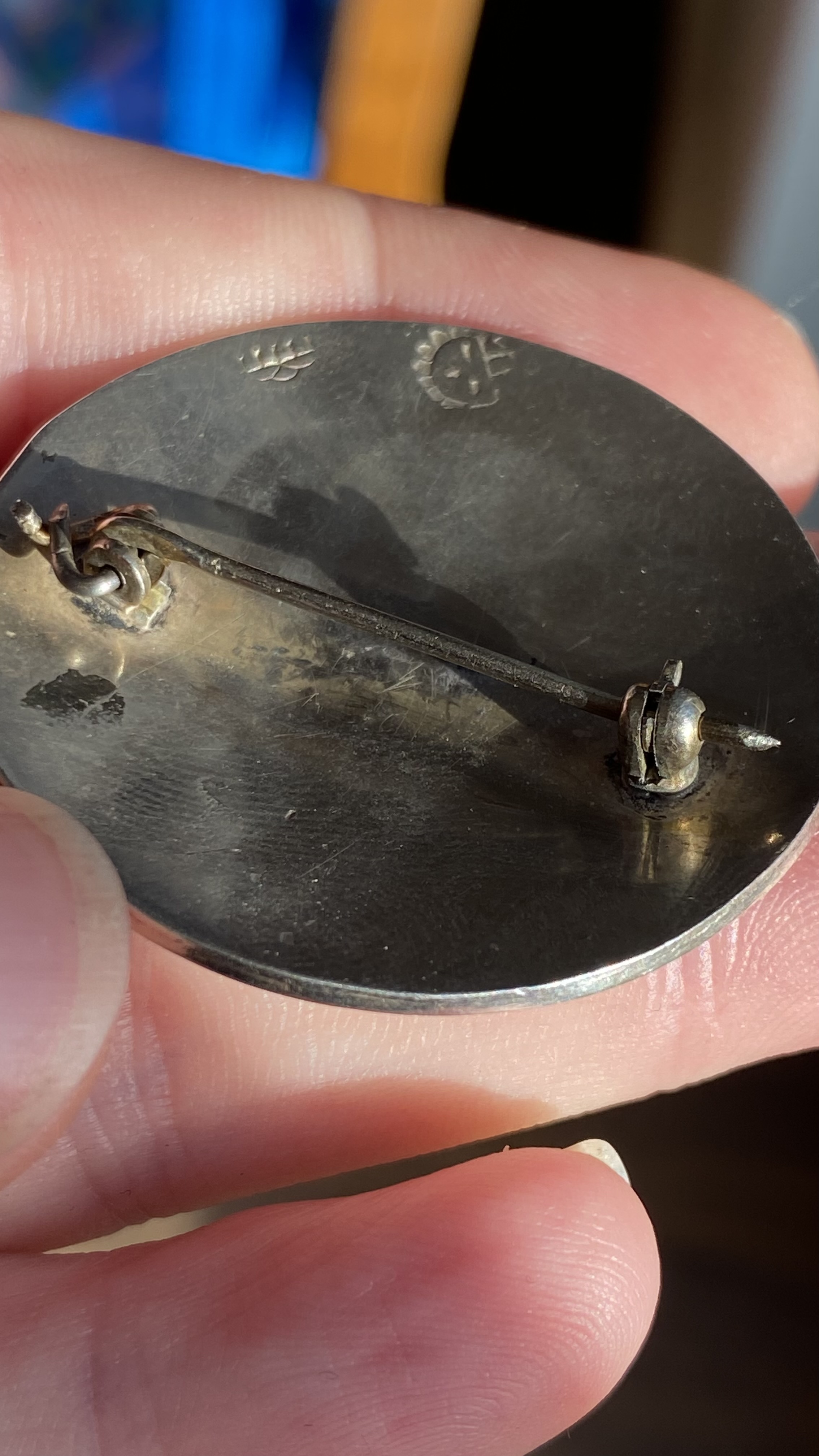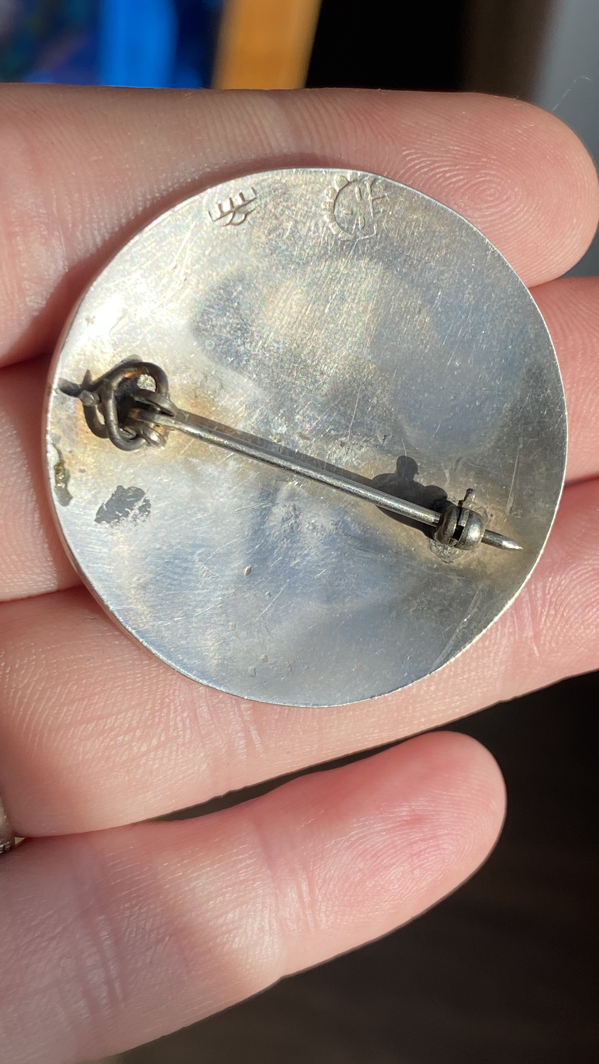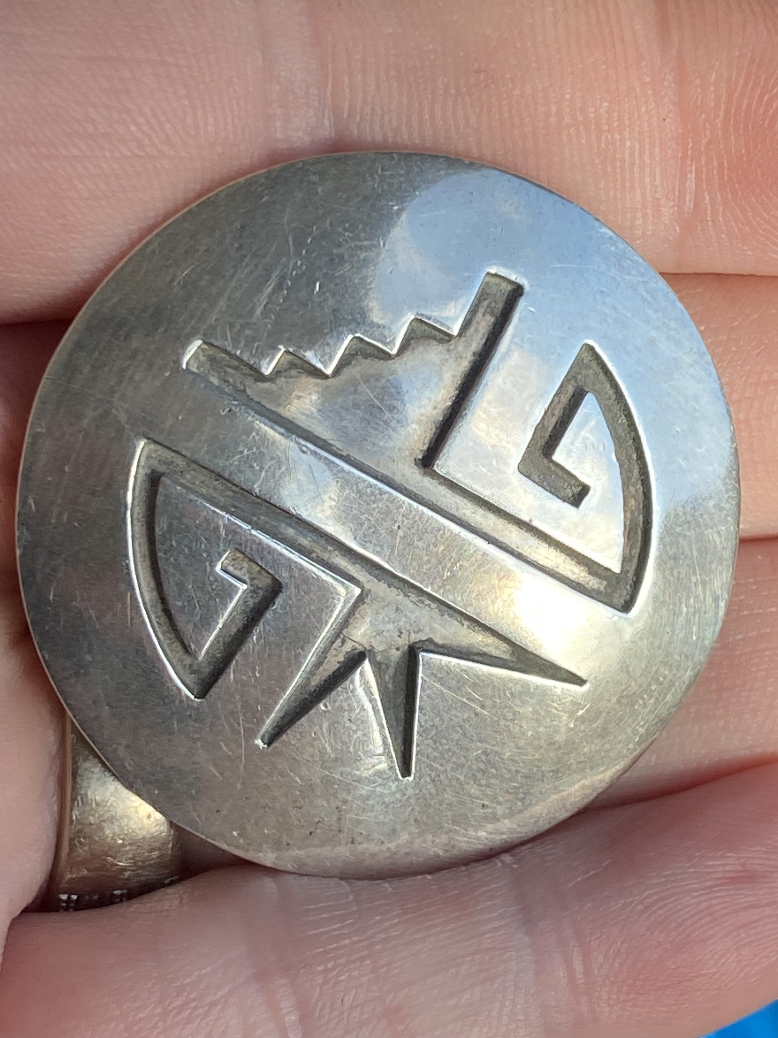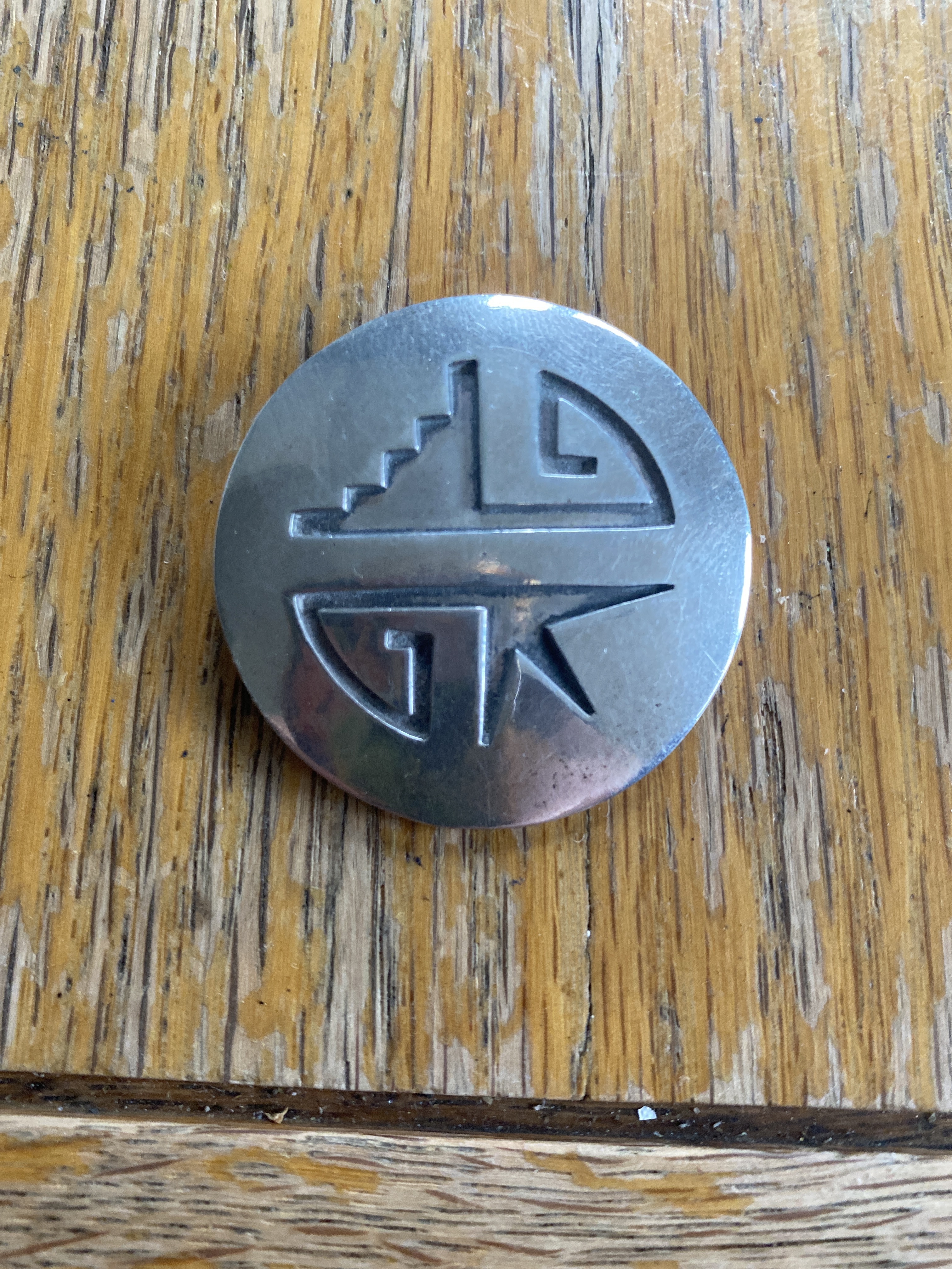 The pin is by Victor Coochwytewa at the Hopi Silvercraft Guild (the cloud is his mark, the sun is the guild):