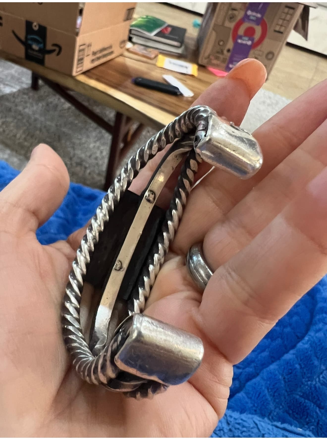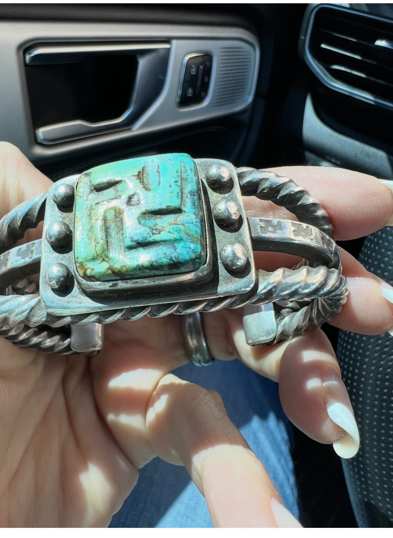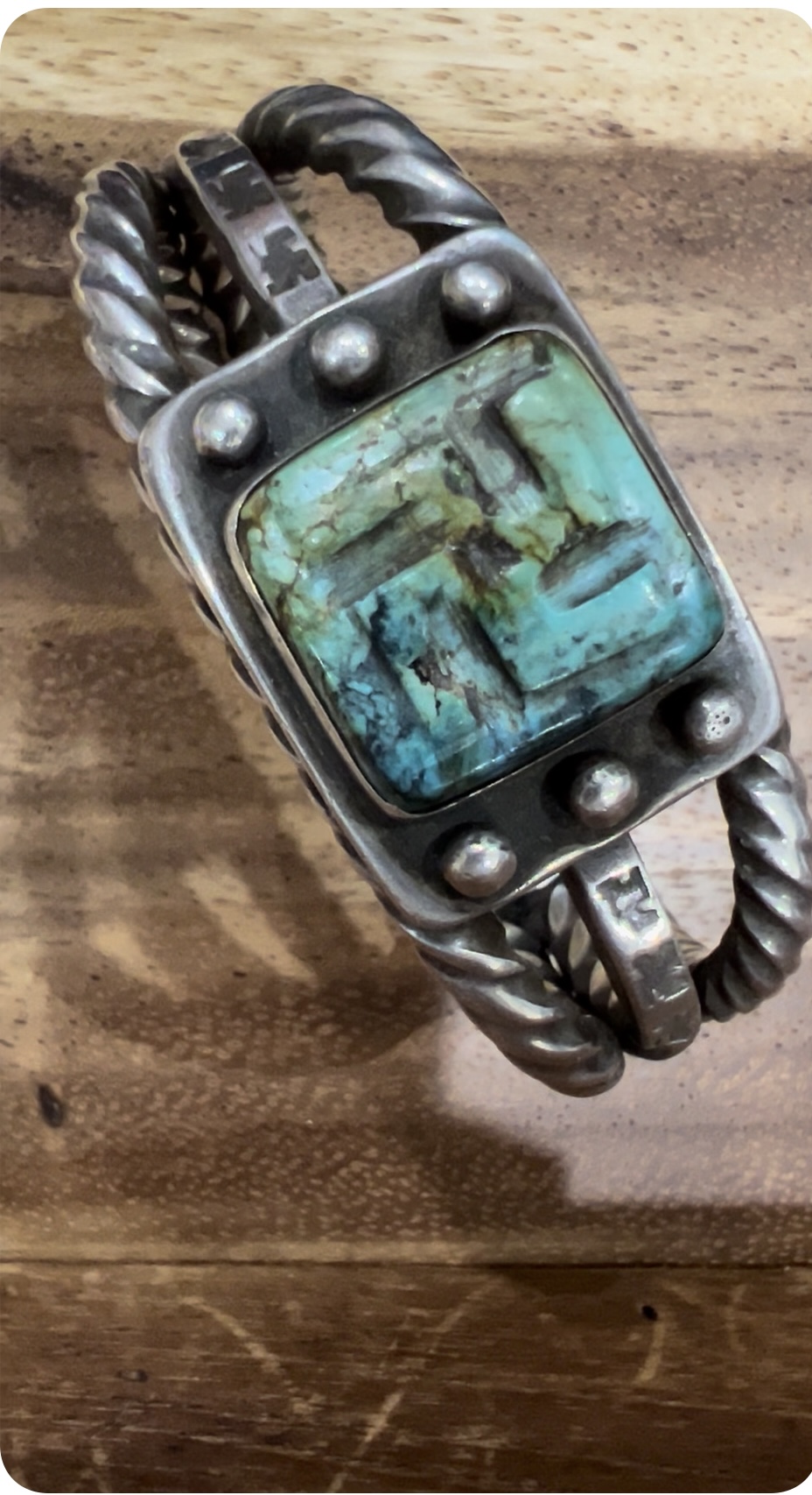 Bought this cuff about 1&1/2 yrs ago because of the carved turquoise. I don’t think I’ve seen Native American with carved turquoise let alone the whirling logs symbol, so I thought it was really neat and different. Of course this leads me to ask, is it really Native American? What kind of turquoise is this? How old is it? The silver is beautiful, heavy and twisted, also stamped with whirling logs. I think it is quite beautiful…I don’t know much about Native American, so looking for some guidance from all you knowledgeable peeps!