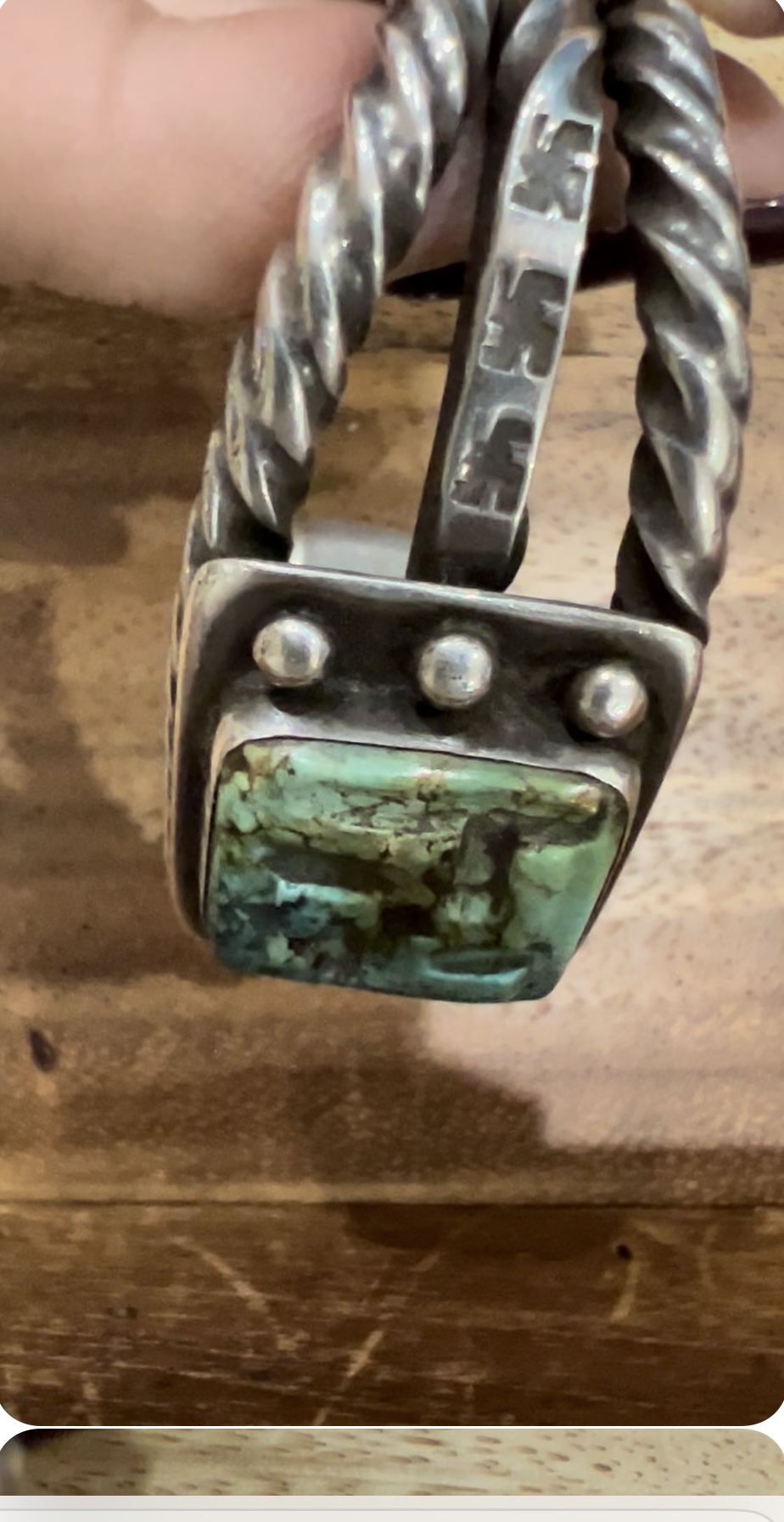 The stone is stabilized, so likely less than 50 years old, (probably 70’s or 80’s) and probably not Native work. Whoever made this wanted to evoke an antique “Native” style but went way overboard with the weight and proportions of the square wire shank relative to the gauge of the backplate for the setting. The notable absence of more refined stamp work, and solitary focus on the whirling log motif reinforces this impression.