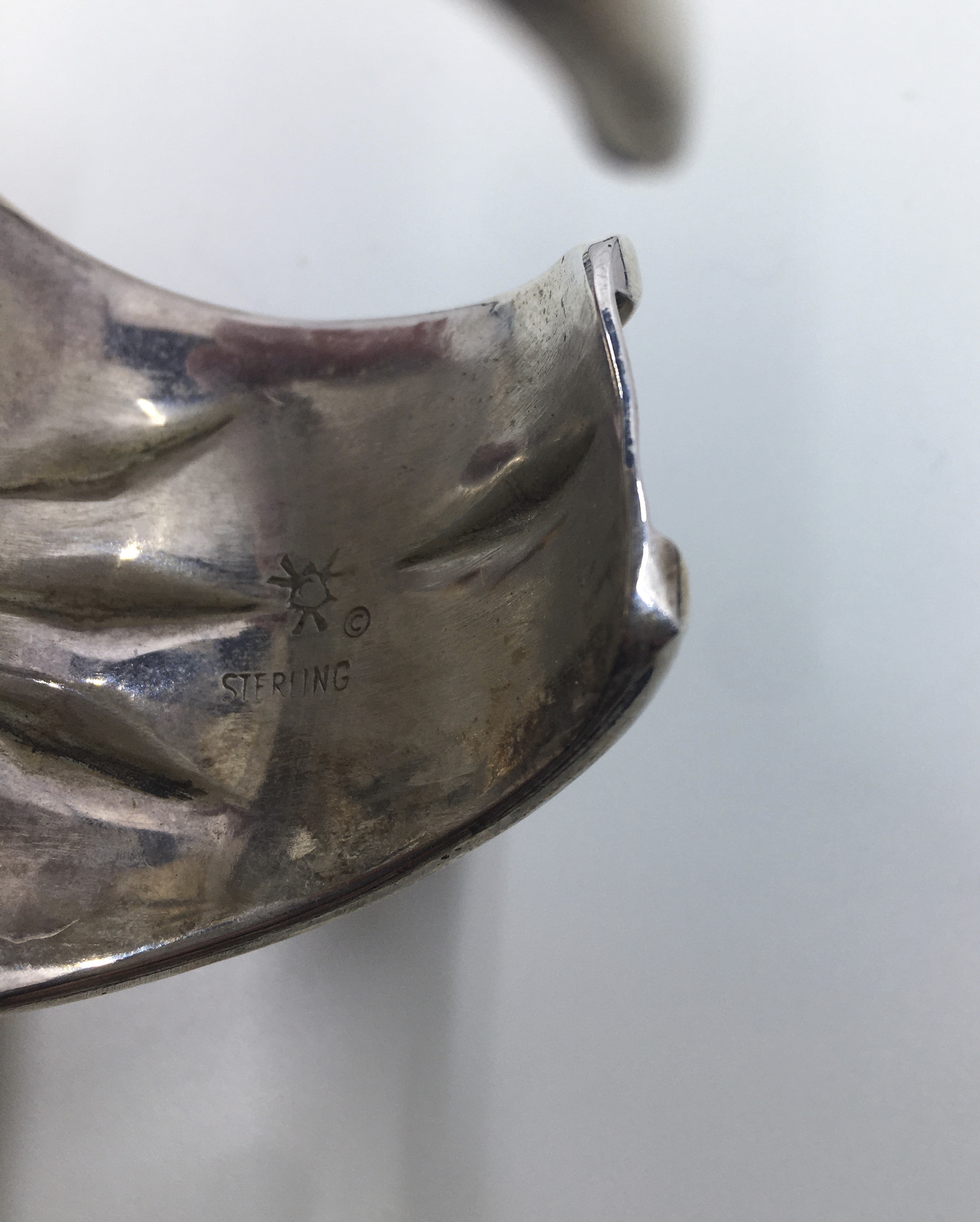 an estate I am working on. It has turquoise + inlay of a raven on one side and overlay wolf on the other. It doesn’t look (to me, a novice at NA jewelry) particularly old but it seems well done. Any idea whose this hallmark this is? I’ve searched for hours.