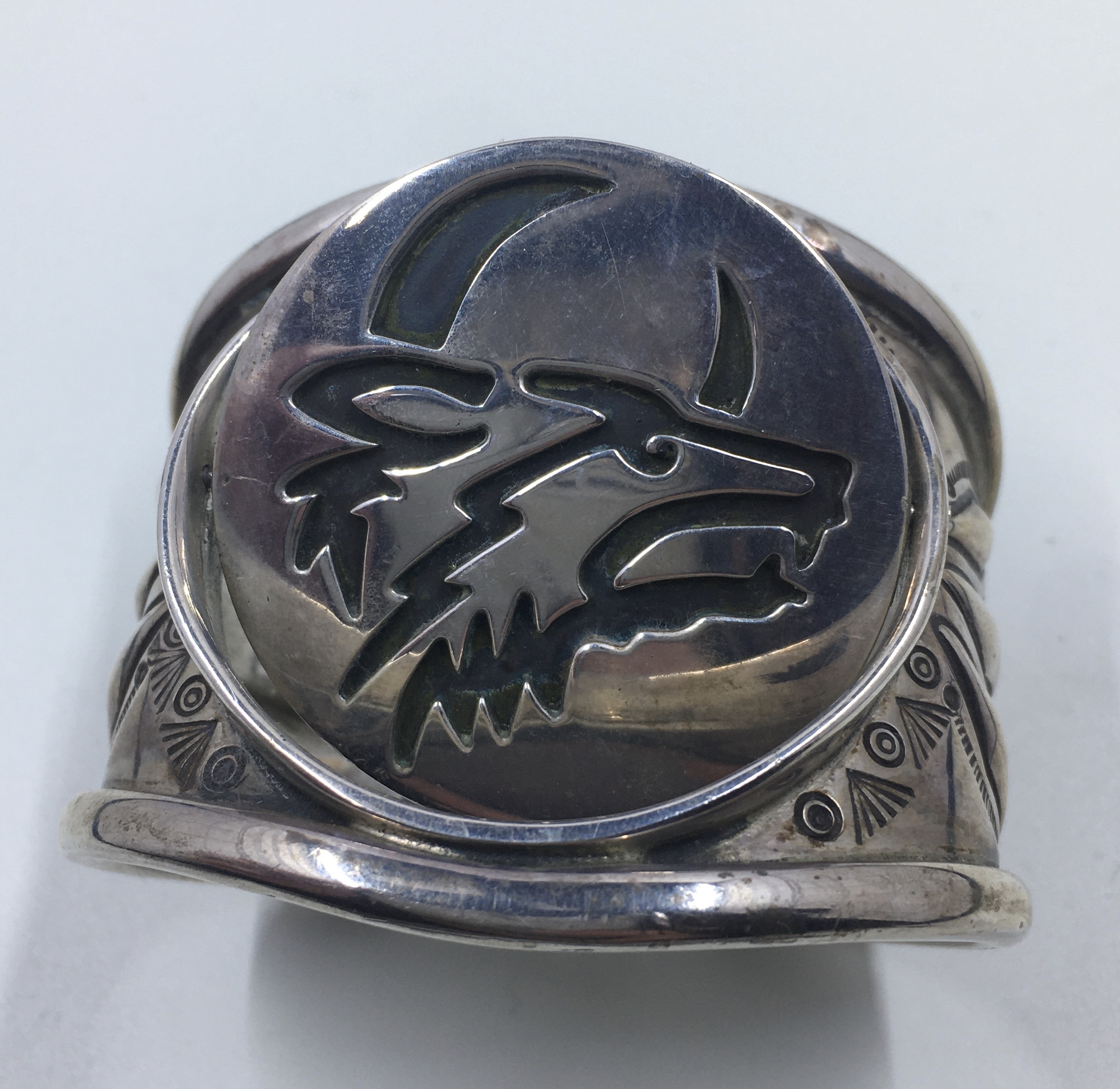 The silver work has a Navajo feel but can’t find any hallmark. Did look up the subject of the cuff and came across this.