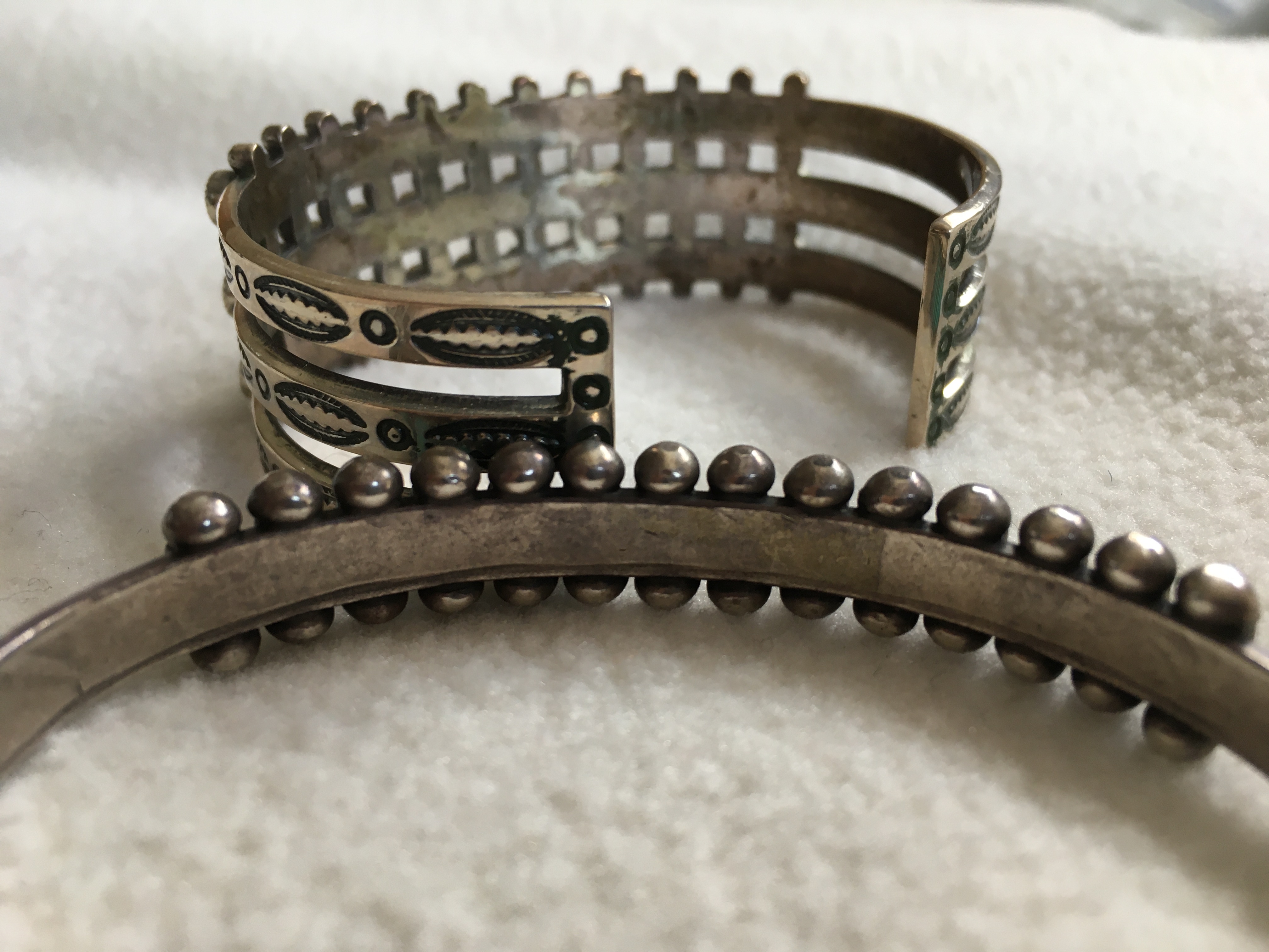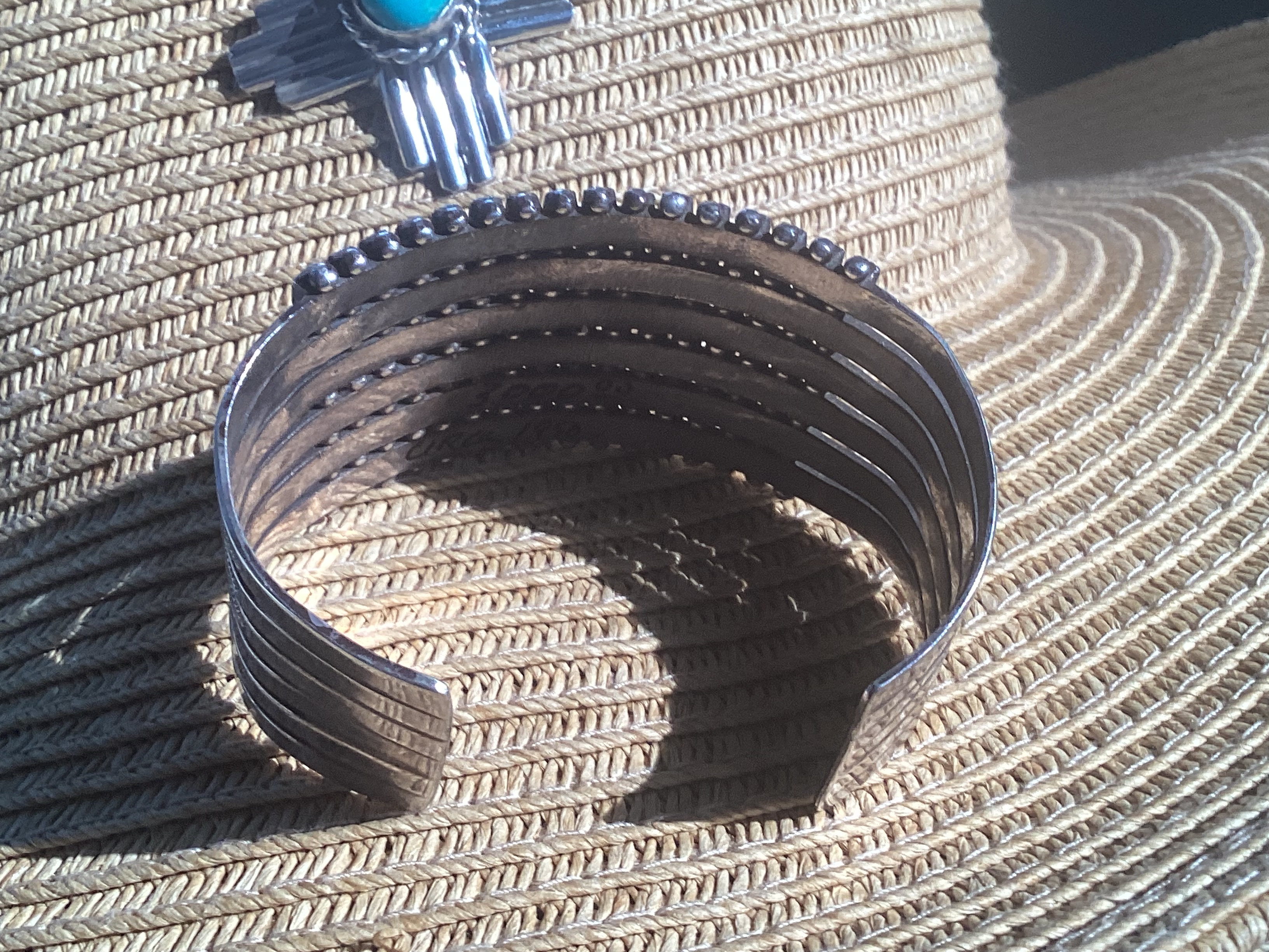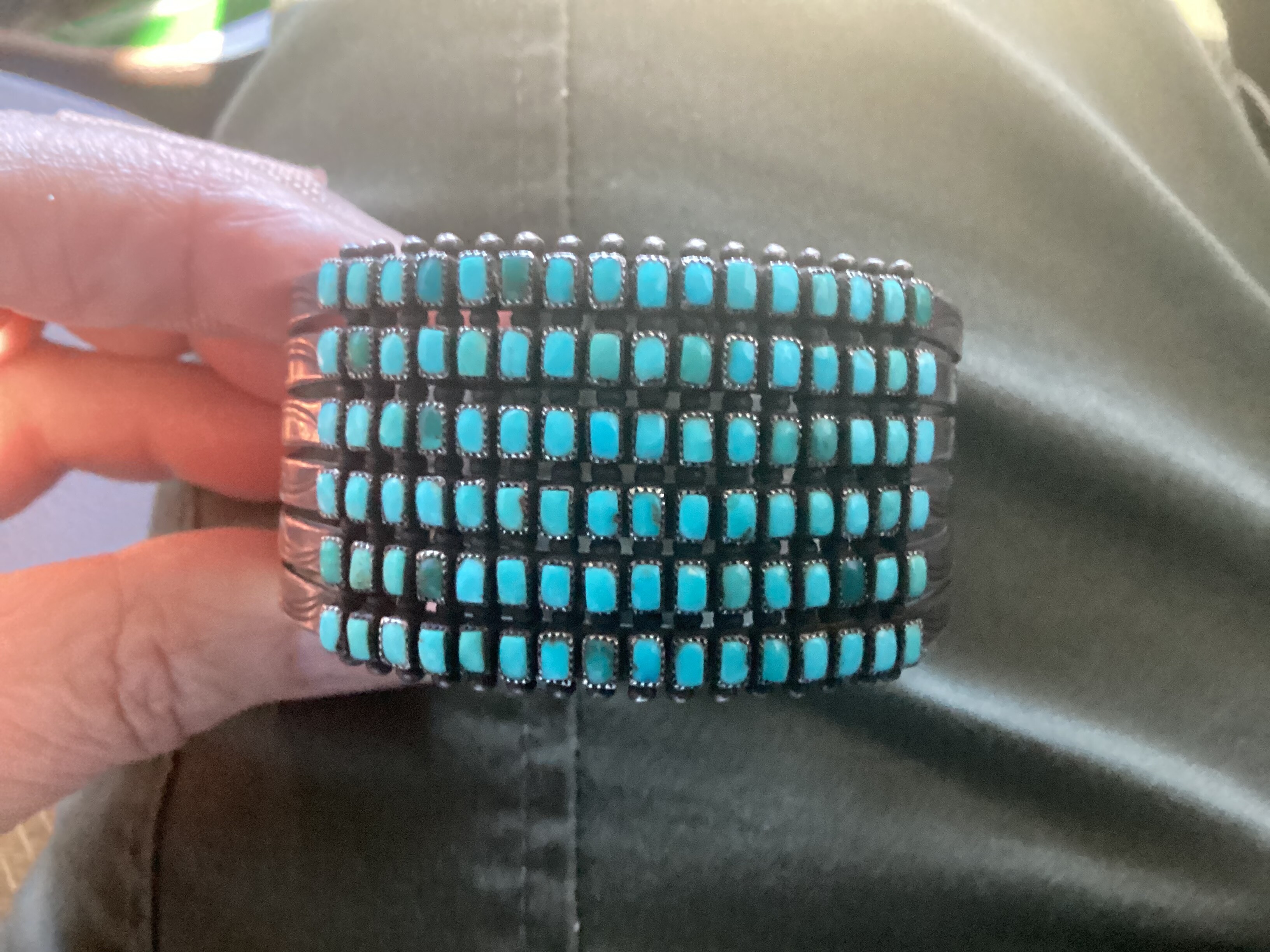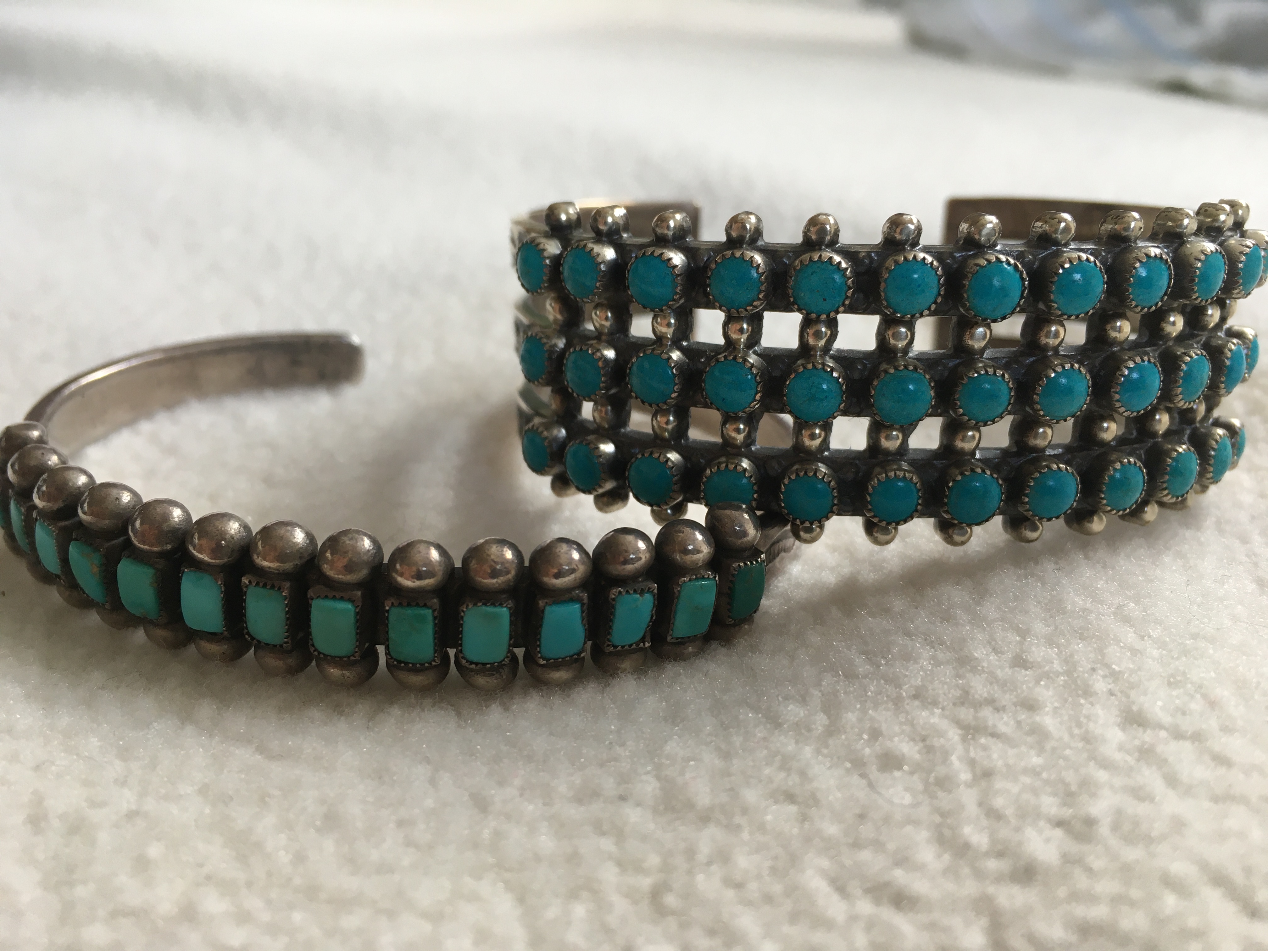 Iām reviewing older posts while riding in a car on our way home from a wonderful trip to New Mexico and Arizona. I apologize for the quality of these photos (taken against my leg & .hatš), I just purchased this great old authentic Zuni 6 row square petite point cuff and thought Iād add it to the mix. It demonstrates the individual tiny silver drops, color variation and hand made bezels pointed out by @OrbitOrange. Before too long Iāll post a better picture of this piece, along with other vintage pieces I picked up. The tiny handmade sawtooth bezels on these great old pieces just blows my mind!