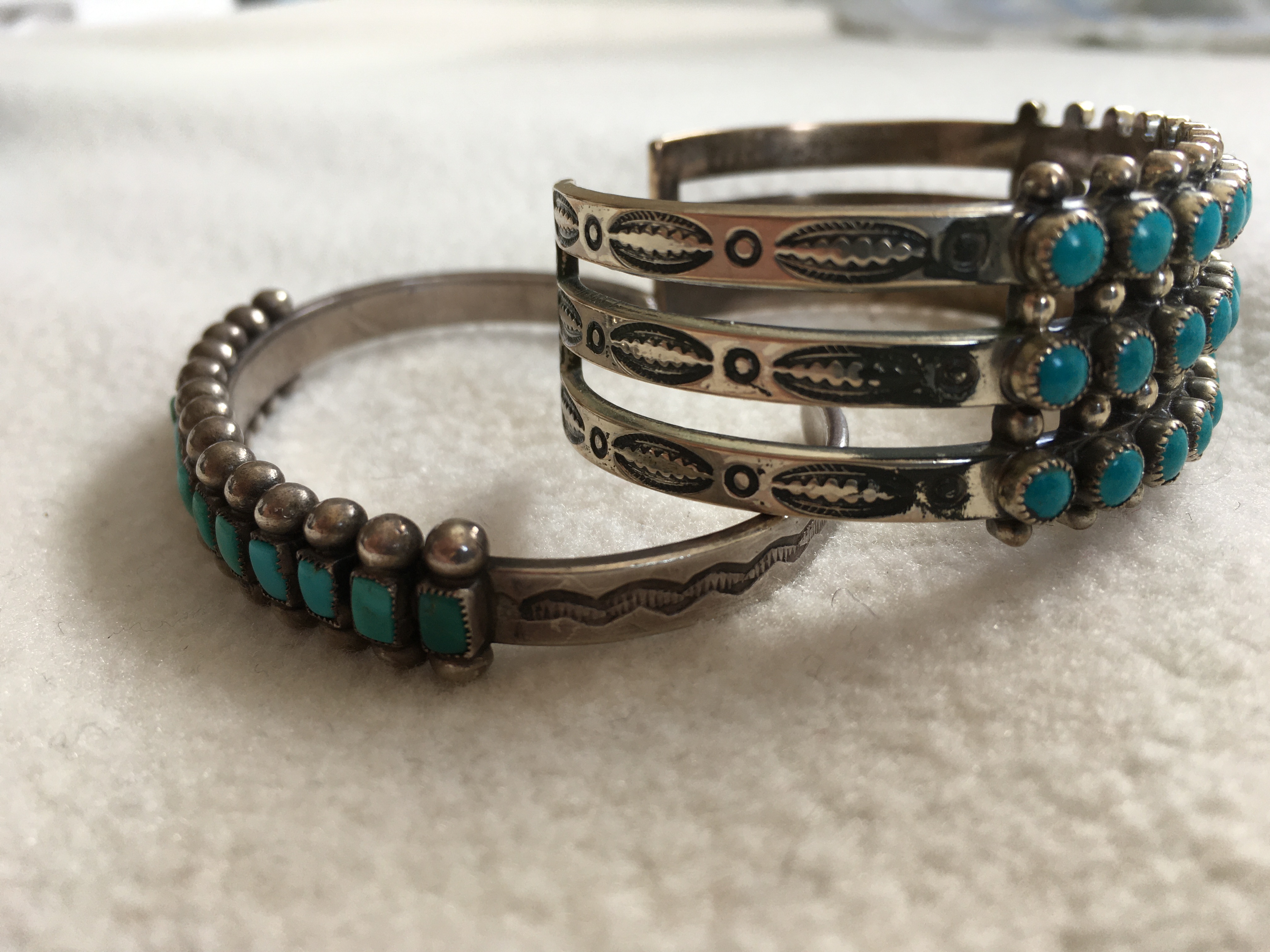 This style of bracelet can be commonly found as it was a very popular style. While there are some beautiful examples that are handmade by native artists with natural turquoise, they were more commonly machine manufactured for the tourist trade, marketed to tourists that didnāt know the difference or didnāt care. Thatās what we have here. When you look closely at the construction, you can see that it was all cast as a single piece. The āstampingā was cast as part of the design and doesnāt show the variation of hand stamping. In addition these very commonly used a compressed composite stone instead of genuine turquoise, composed of either turquoise powder (waste from cutting stones) or dyed powder from another stone, compressed and glued together. That āturquoiseā has a completely uniform and slightly grainy appearance without any matrix at all. Although these are not the greatest pictures of the turquoise in this cuff, it looks to be made with composite stones. If I were you I would pass on this cuff at that price.
