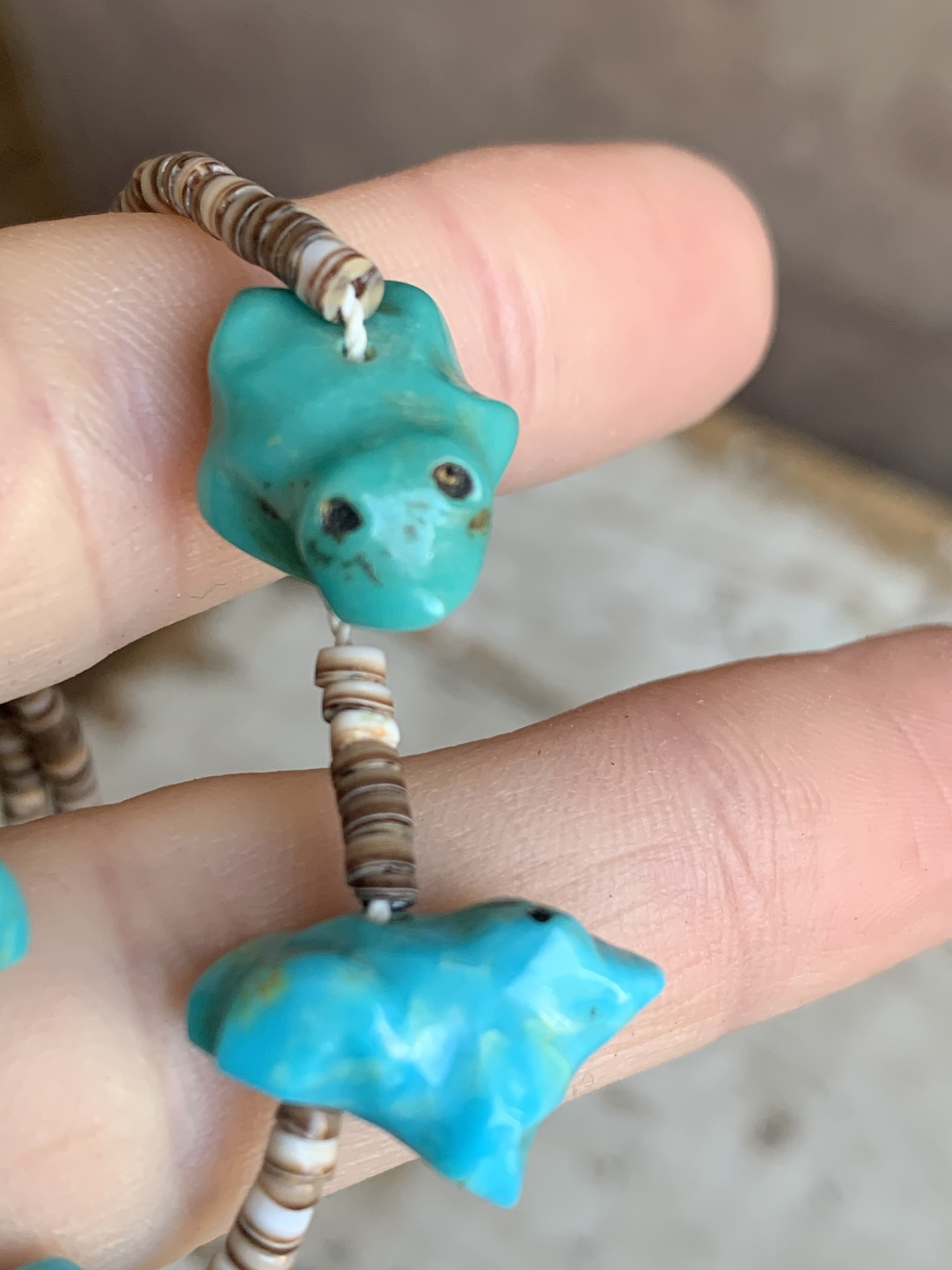 The other concerns: I am unaware of a metal hang tag style for her hallmark. This was a Quandelacy family thing, but I haven’t seen it for her. And her hallmark style looks different in a fetish necklace that’s credibly by her, with a stamped hallmark on a cone. I can’t vouch for this other listing, but it seems close to right.