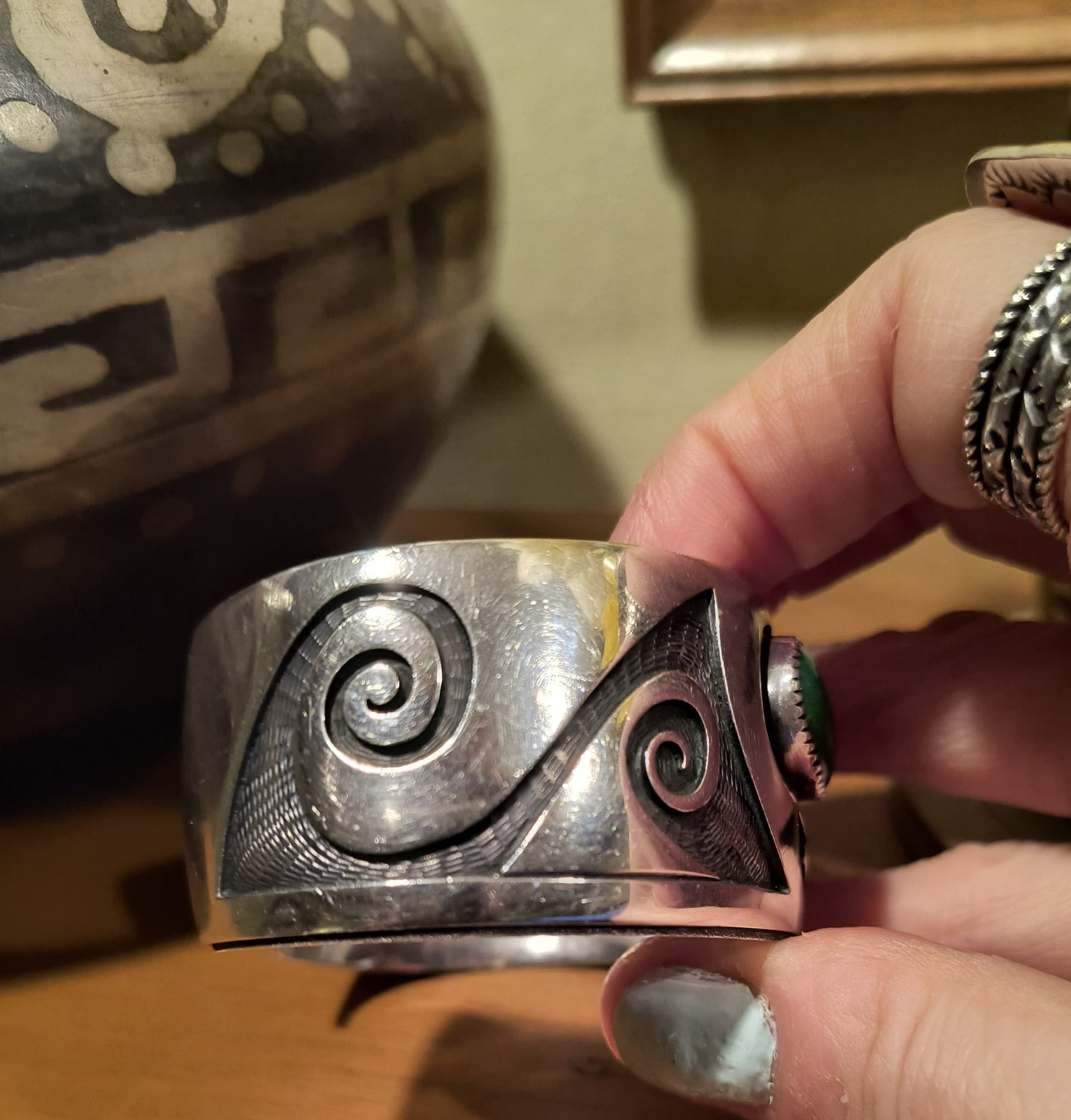 Thank you! I prefer it also (the Apache dancer cuffs are not quite my style). But check out this short video; He talks about his craft, and shows some other items he has made. He said he’s been making jewelry for about 40 years (in his words, 40 yrs of practice), and over 20 yrs ago he went back home to the Verde Valley from the Hopi Mesas. I bought my cuff around '95. Interesting to see his style changes.