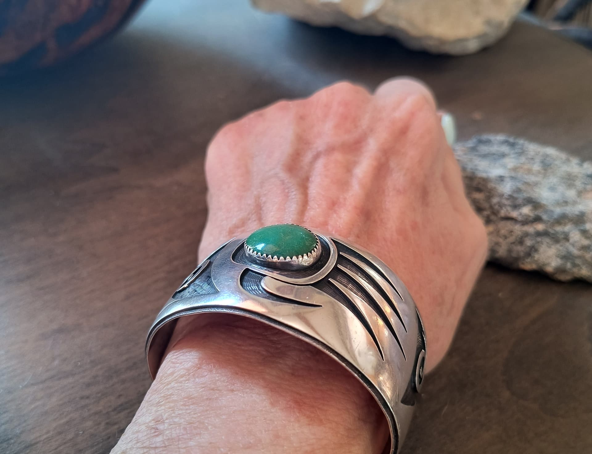 Fabulous half-Hopi cuff😉! I think the dark green turquoise color change is perfect for this cuff. And personally, I’m much more attracted to your cuff than the other examples of Jerry’s work that you posted.
