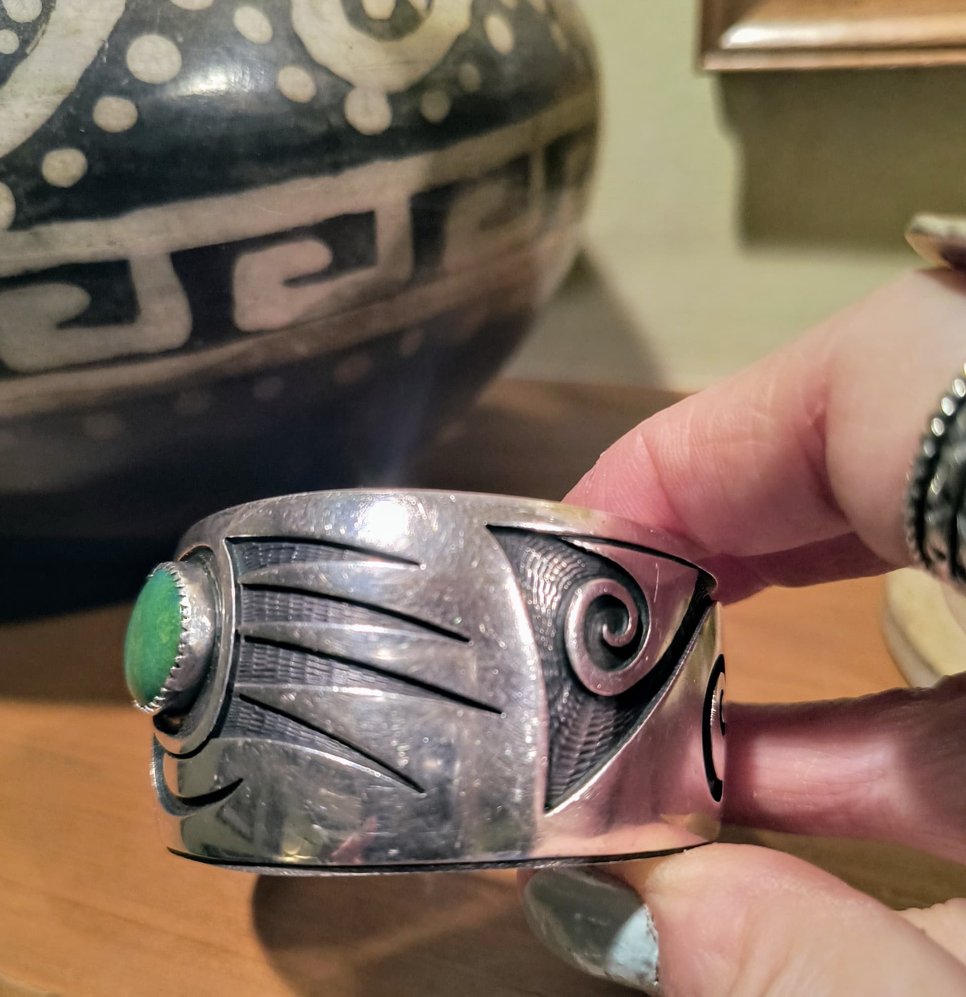 I’m posting this as a lesson in learning that things are not always exactly as they seem. Also, the discussion we had recently about stones turning color made me remember it. I bought this cuff in the mid 90’s at my favorite now closed (of course) store/pawn shop in Flag. The owner said he very seldom had Hopi jewelry brought in for pawn, and he really liked this one partly because it had a stone (more unusual). The turquoise isn’t high grade, but is natural (it has totally changed color - was blue and is now on its way to becoming greasy green). The hallmark is a hook for a bear strap, the mark for Jerry Honwytewa Whagado (in my Hopi Silver book).