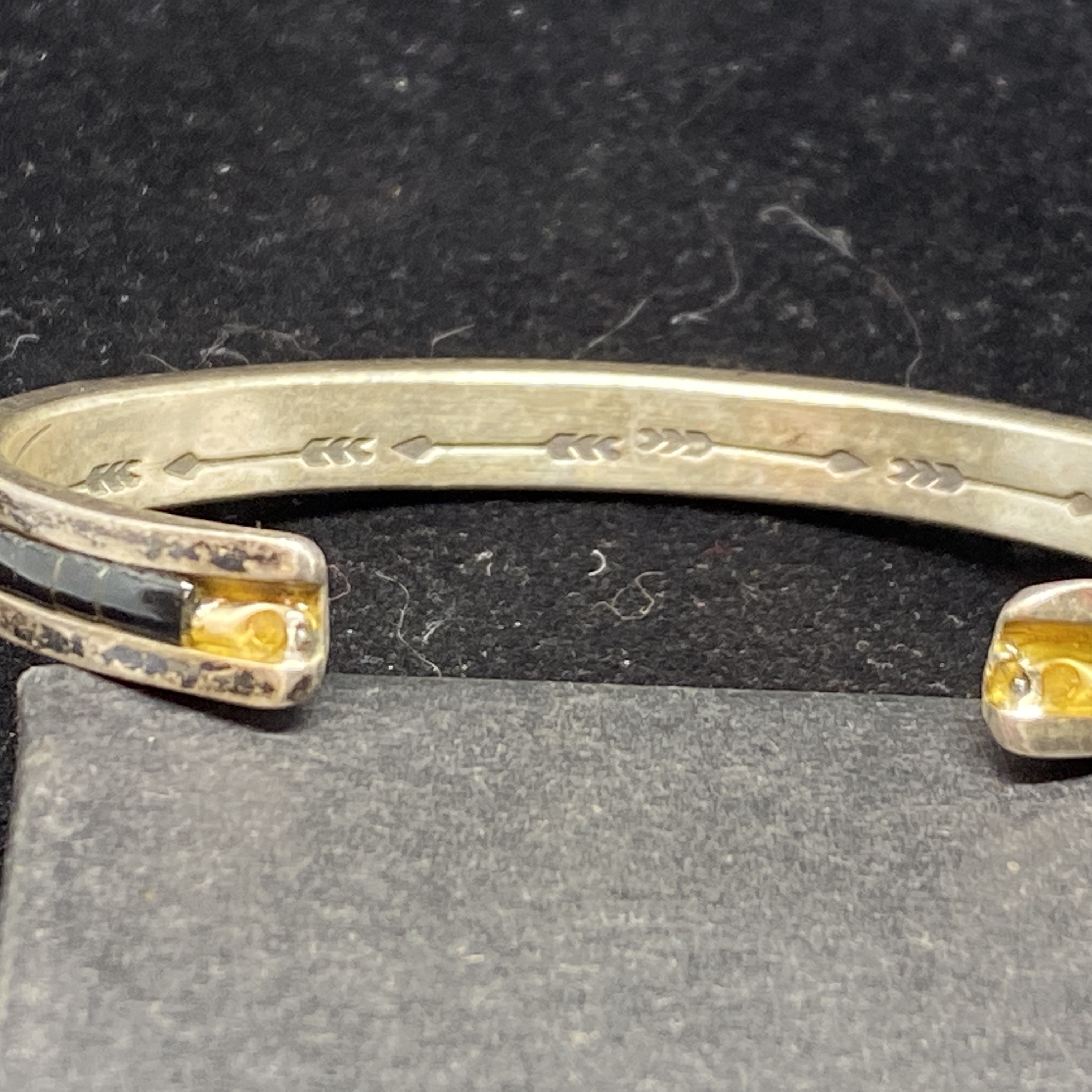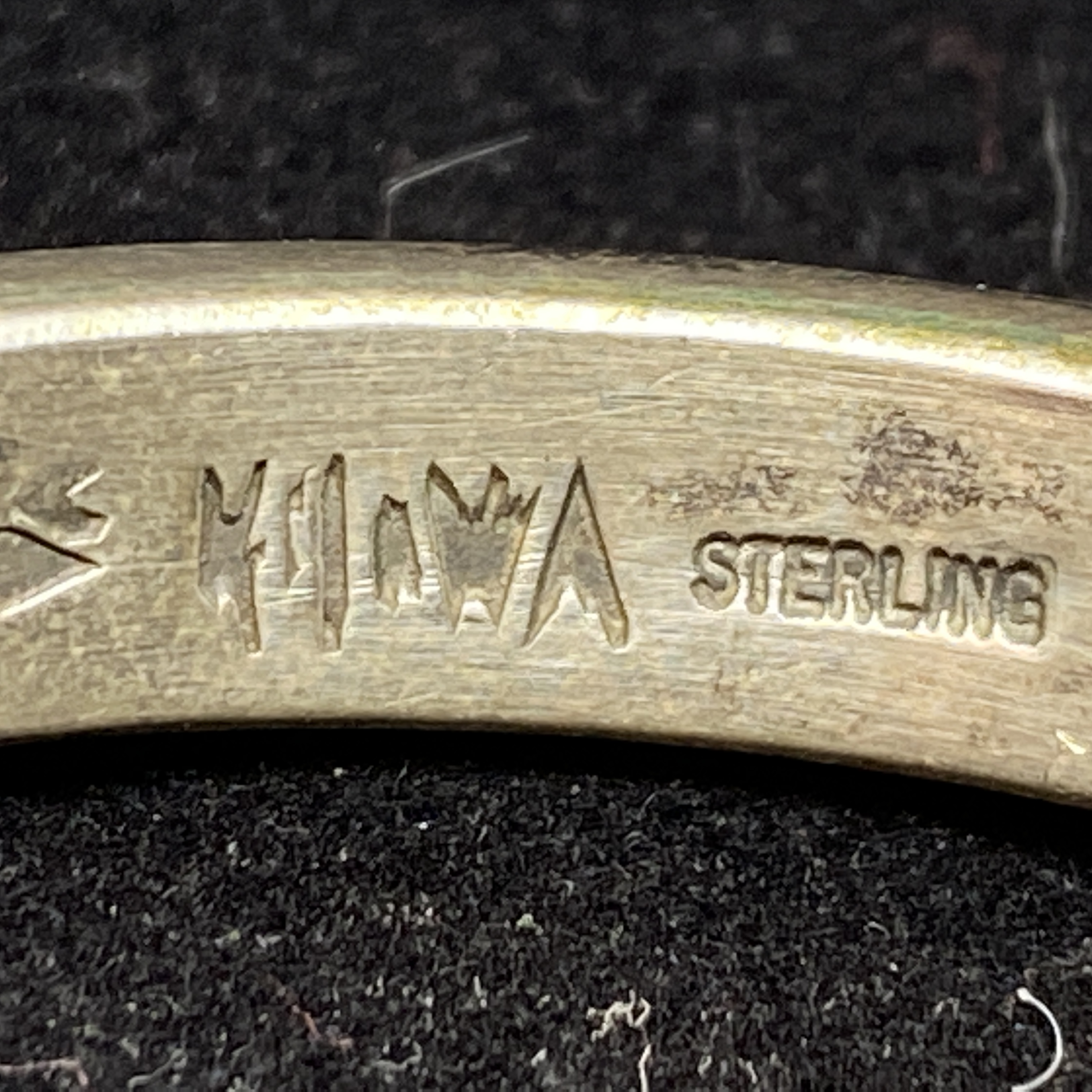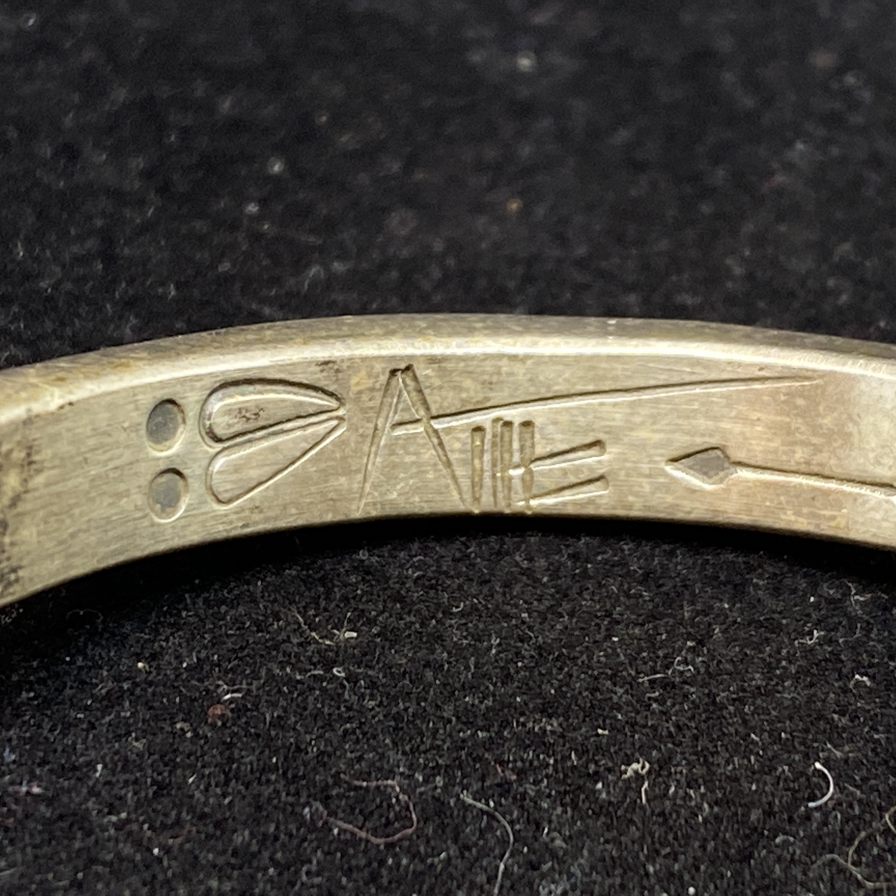 I couldn’t figure out what the letters were next to the sterling stamp. They do look similar in style to some of the Hopi hallmarks in my book, but not the same. I’m wondering if it could be one of the other Pueblo tribes. I’ve seen some Laguna signatures somewhere that looked a little like that, however I don’t have any books with those hallmarks. I have a cuff from a Santa Domingo Native American, and the inside of the cuff reminds me of what you have. But his Hallmark is completely different.