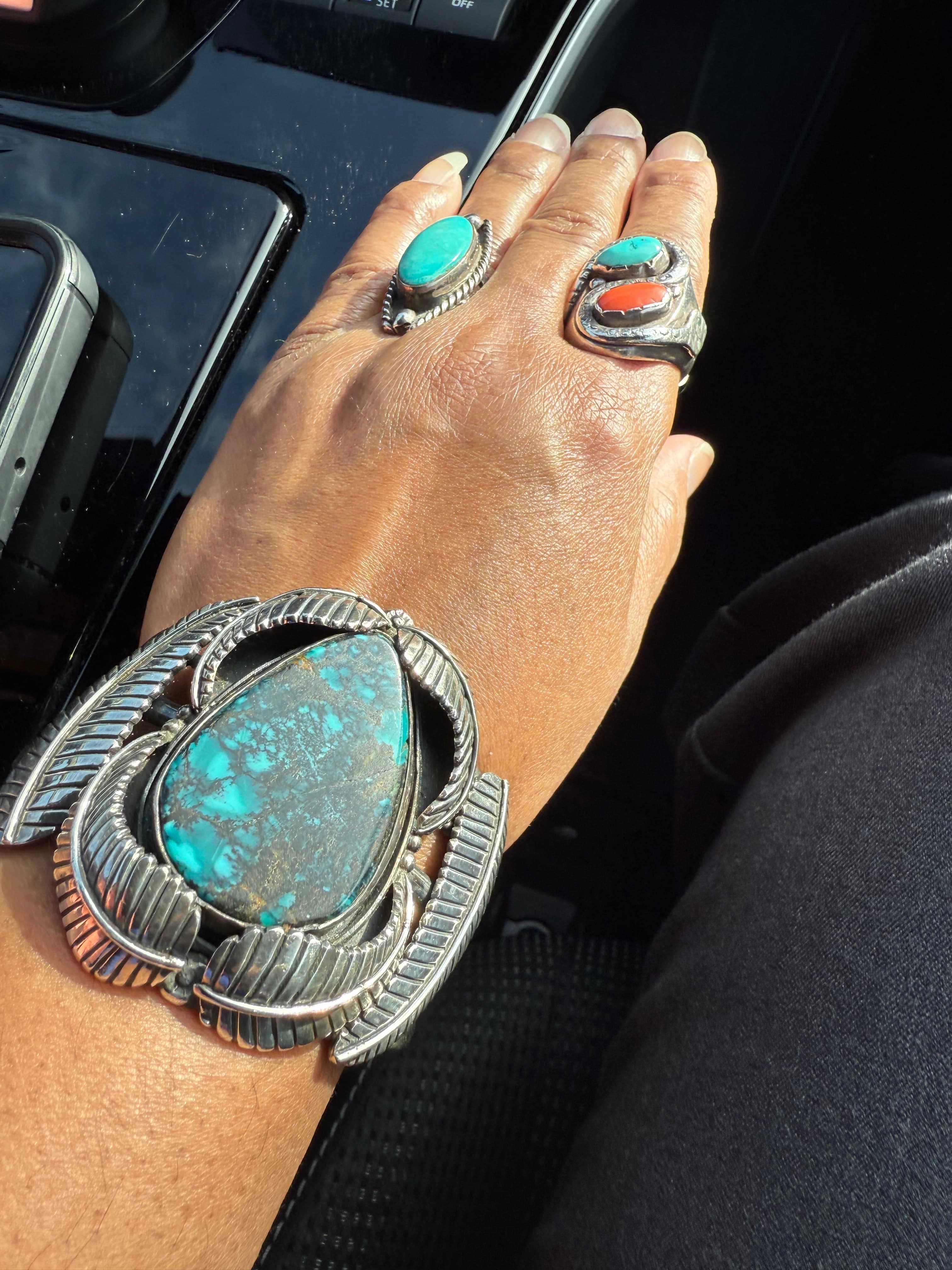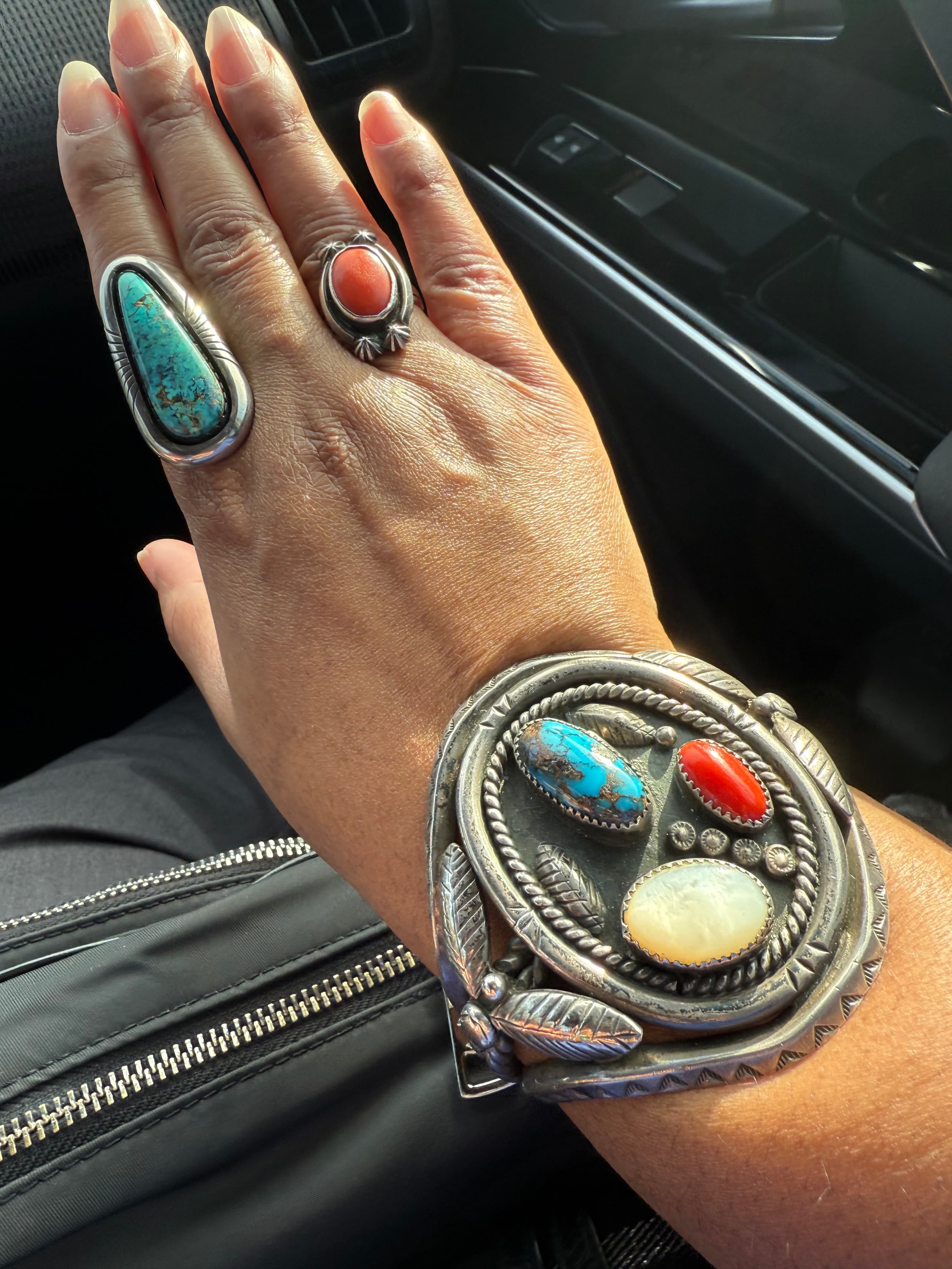 Those cuffs are KILLER, but I really love your rings. The turquoise and the coral on you right hand are wonderful, very chic.
