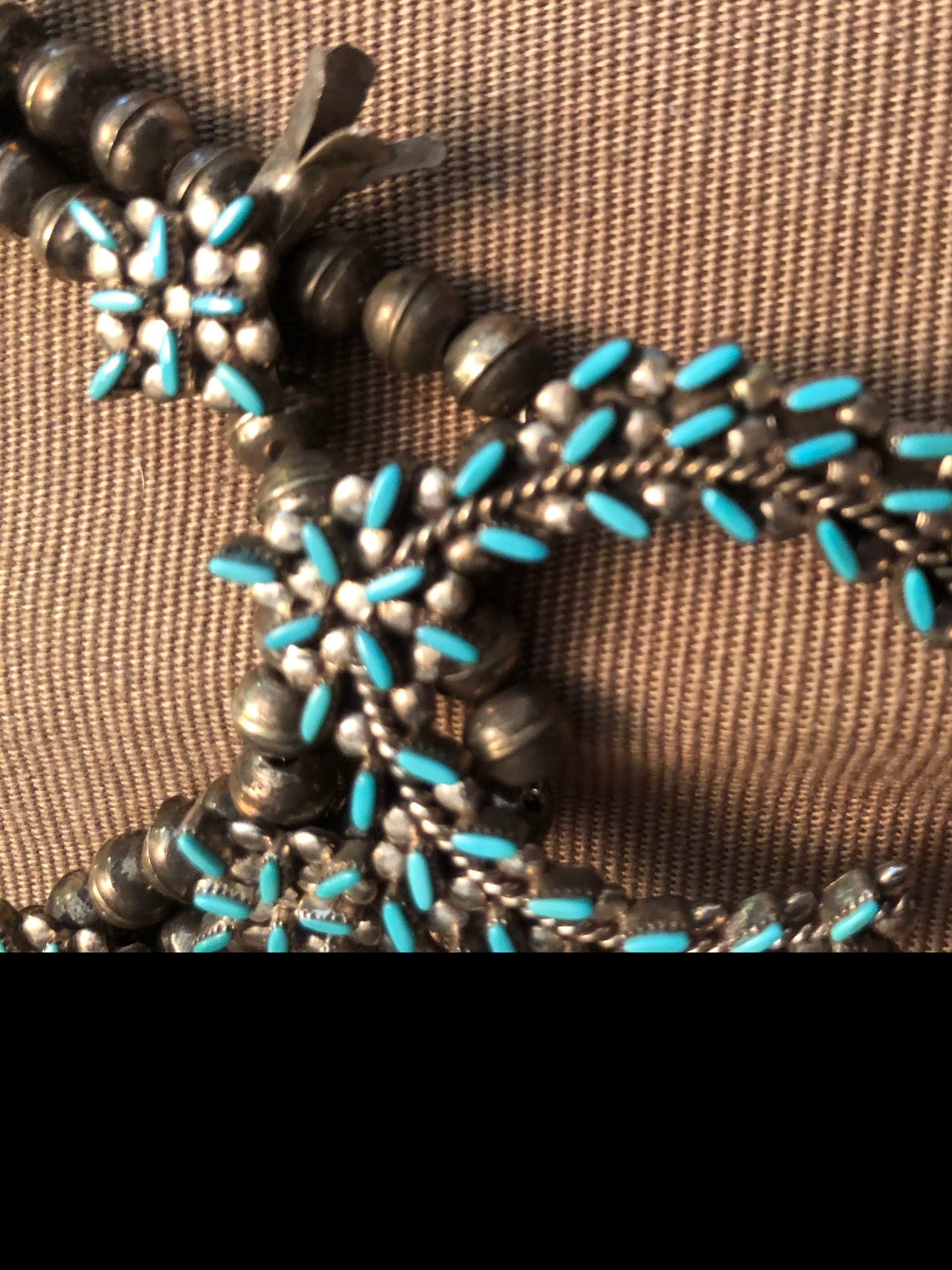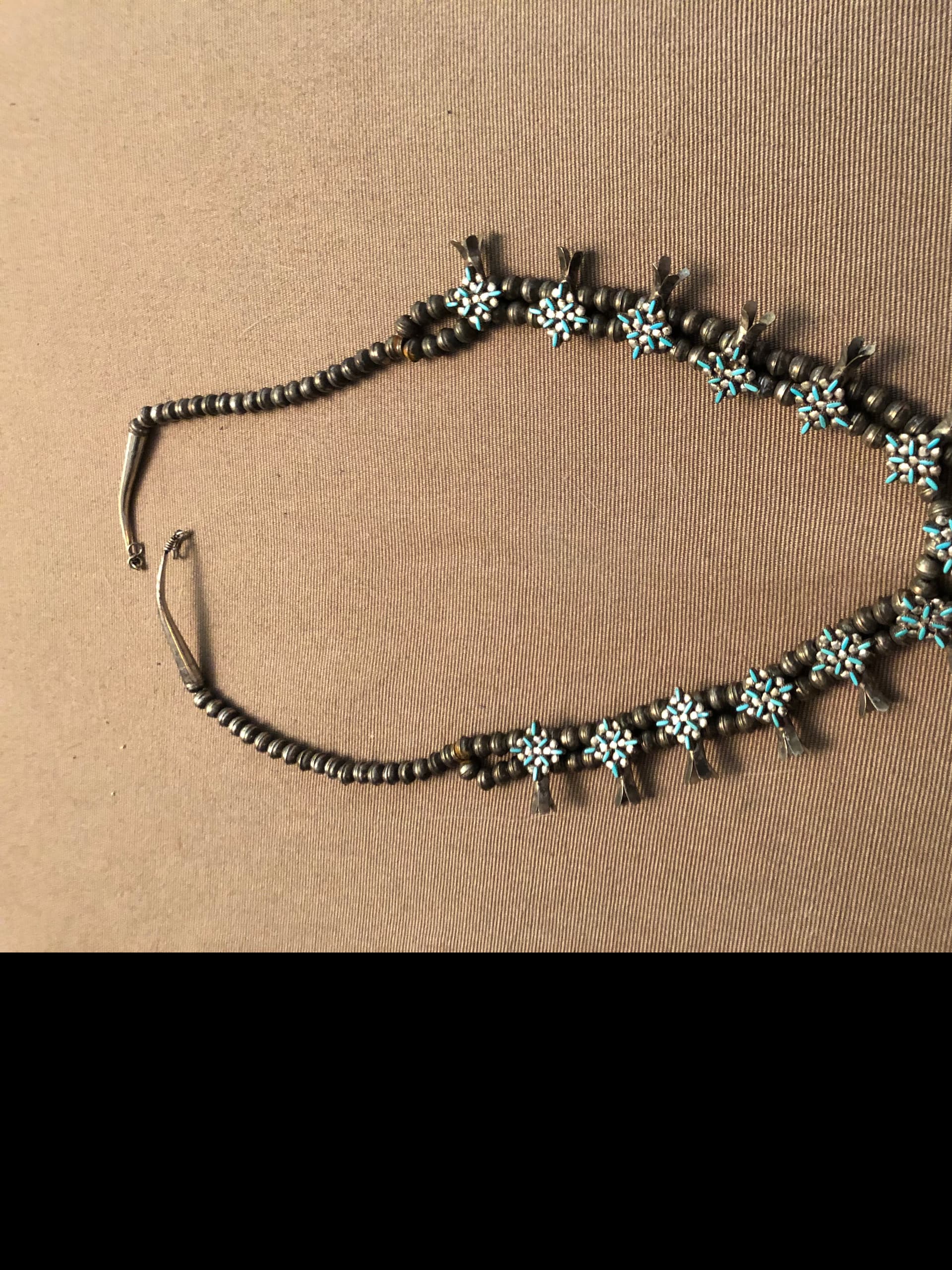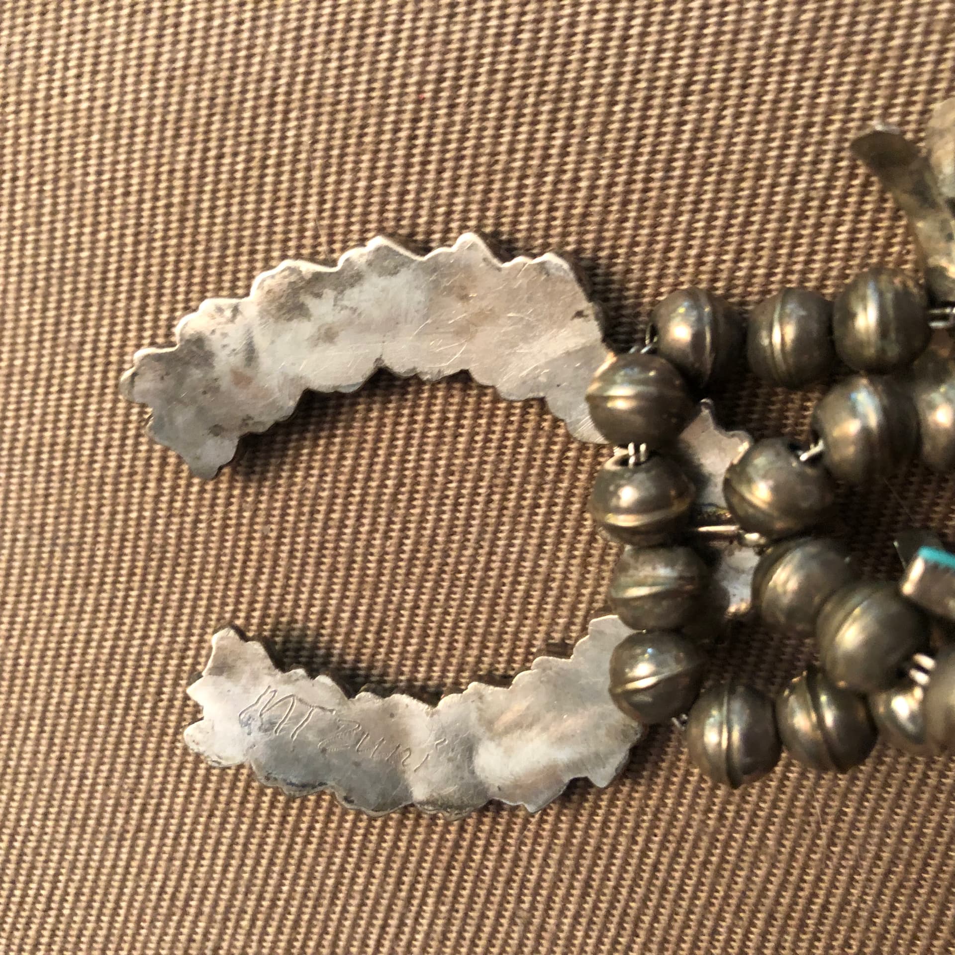 I live in Switzerland and just bought this necklace. Seems the needs are platted but other pieces are silver. The stones are set with prongs. It’s signed (?) MT Zuni on the back. I join some pictures and thank you for your help. Pascale