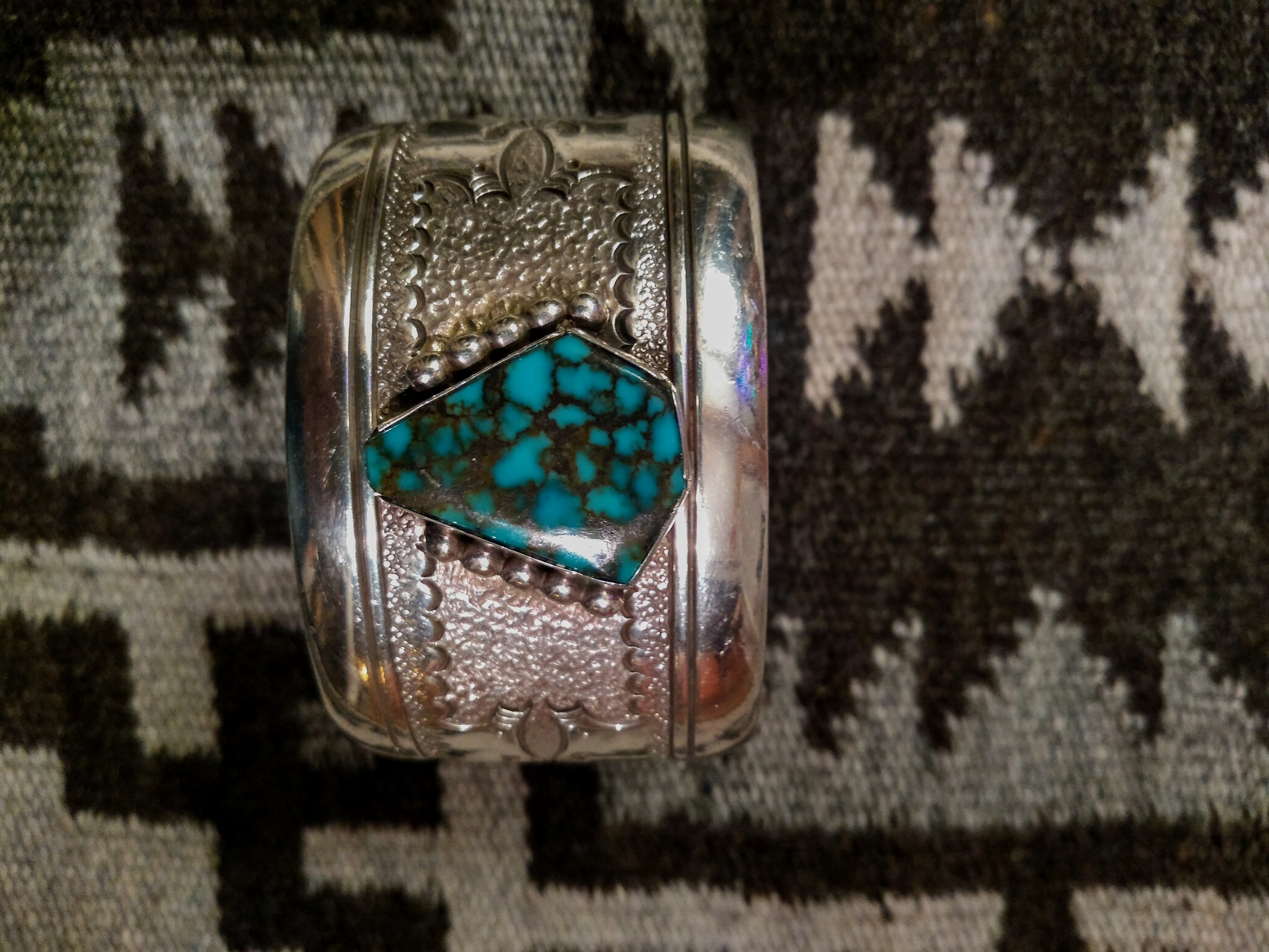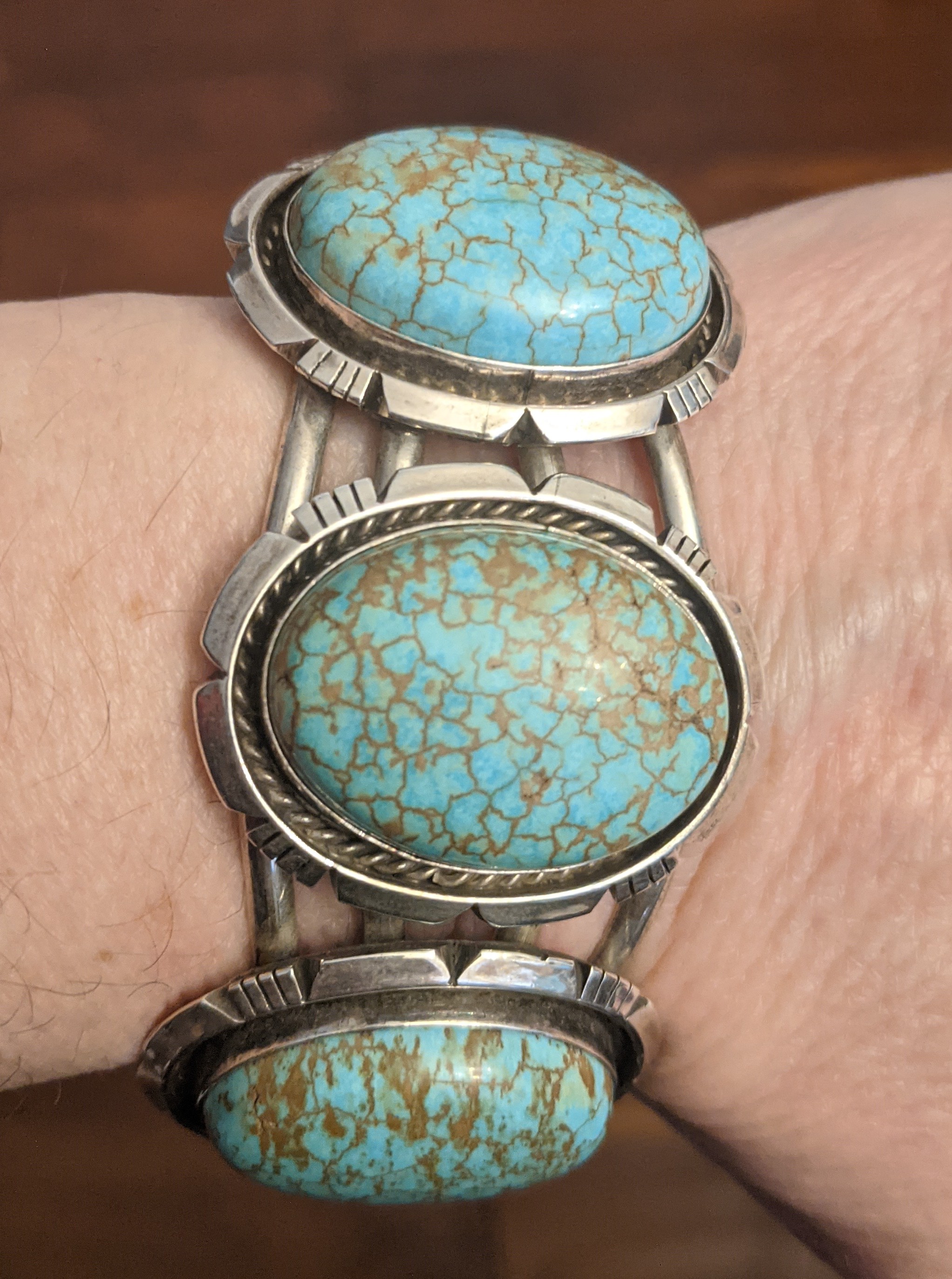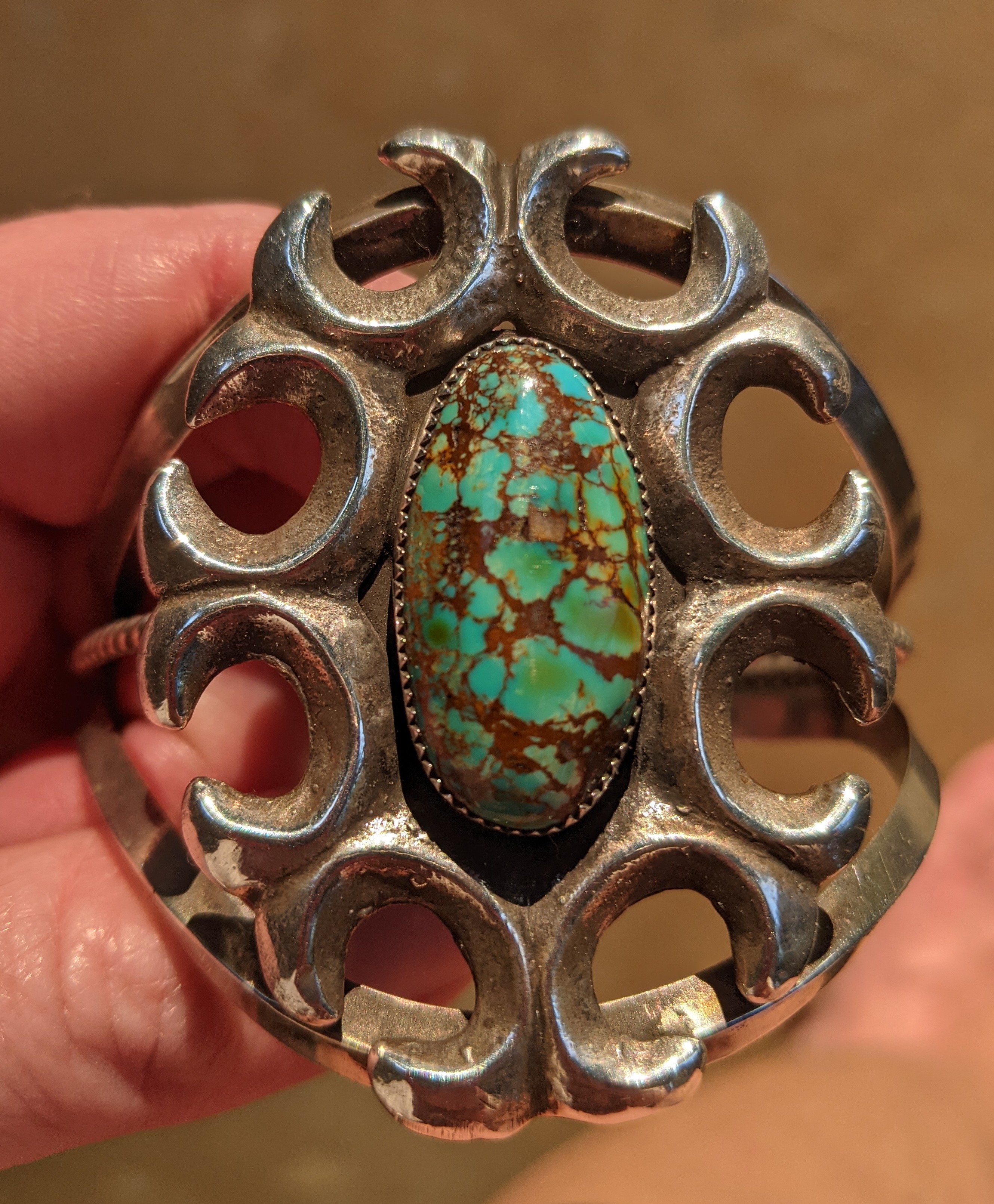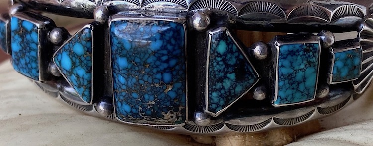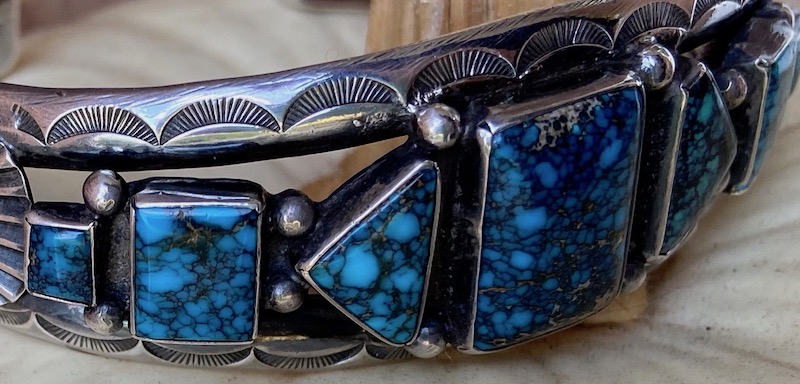 Here’s a pawn cuff I bought at Shush Yaz in Gallup years ago. Didn’t know the turquoise then, but another shop owner in Sedona later said it might be Stormy Mountain; I have no idea.