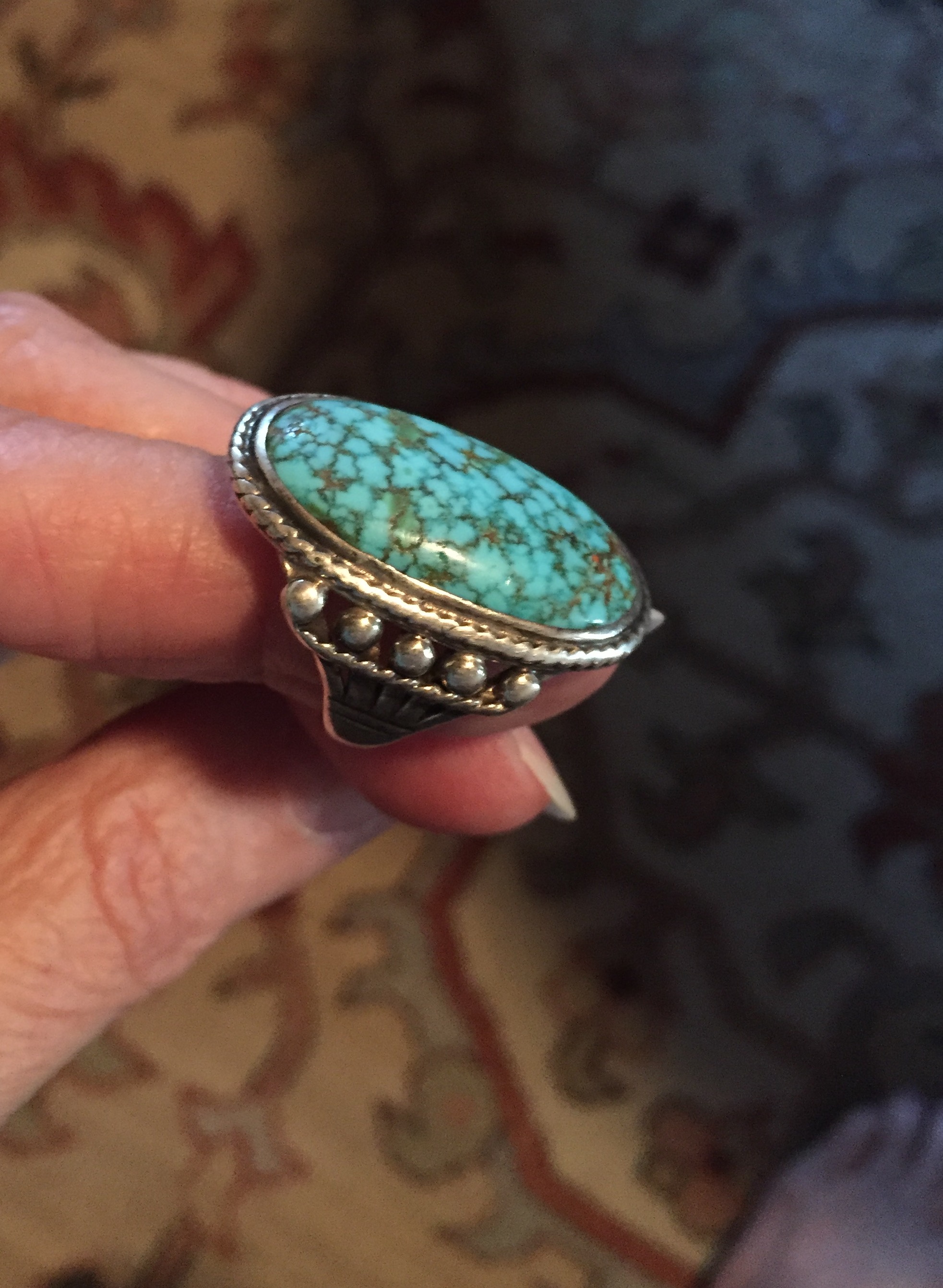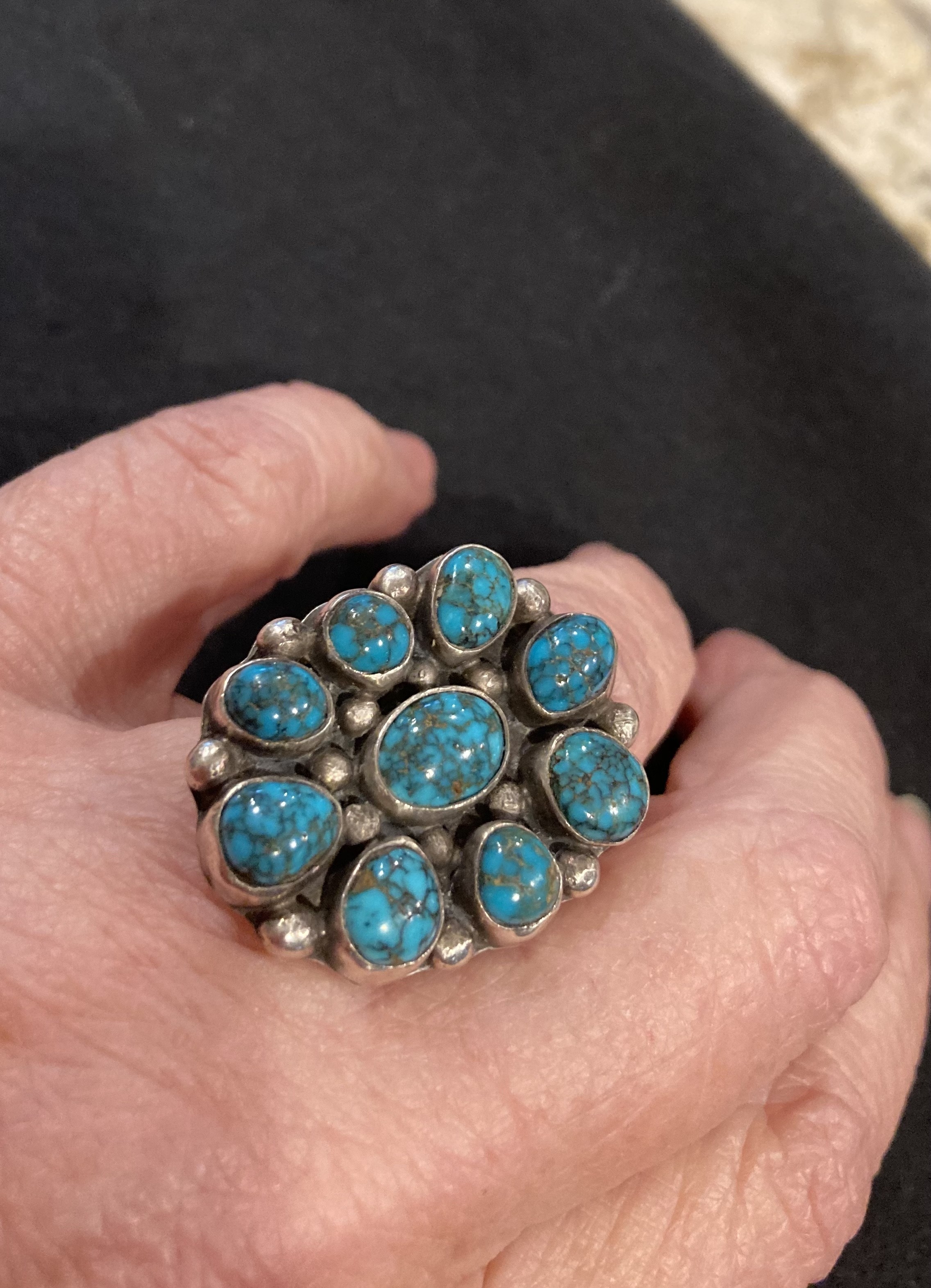 Wonderful cluster ring. According to Gene Waddell, this is Lone Mountain turquoise: