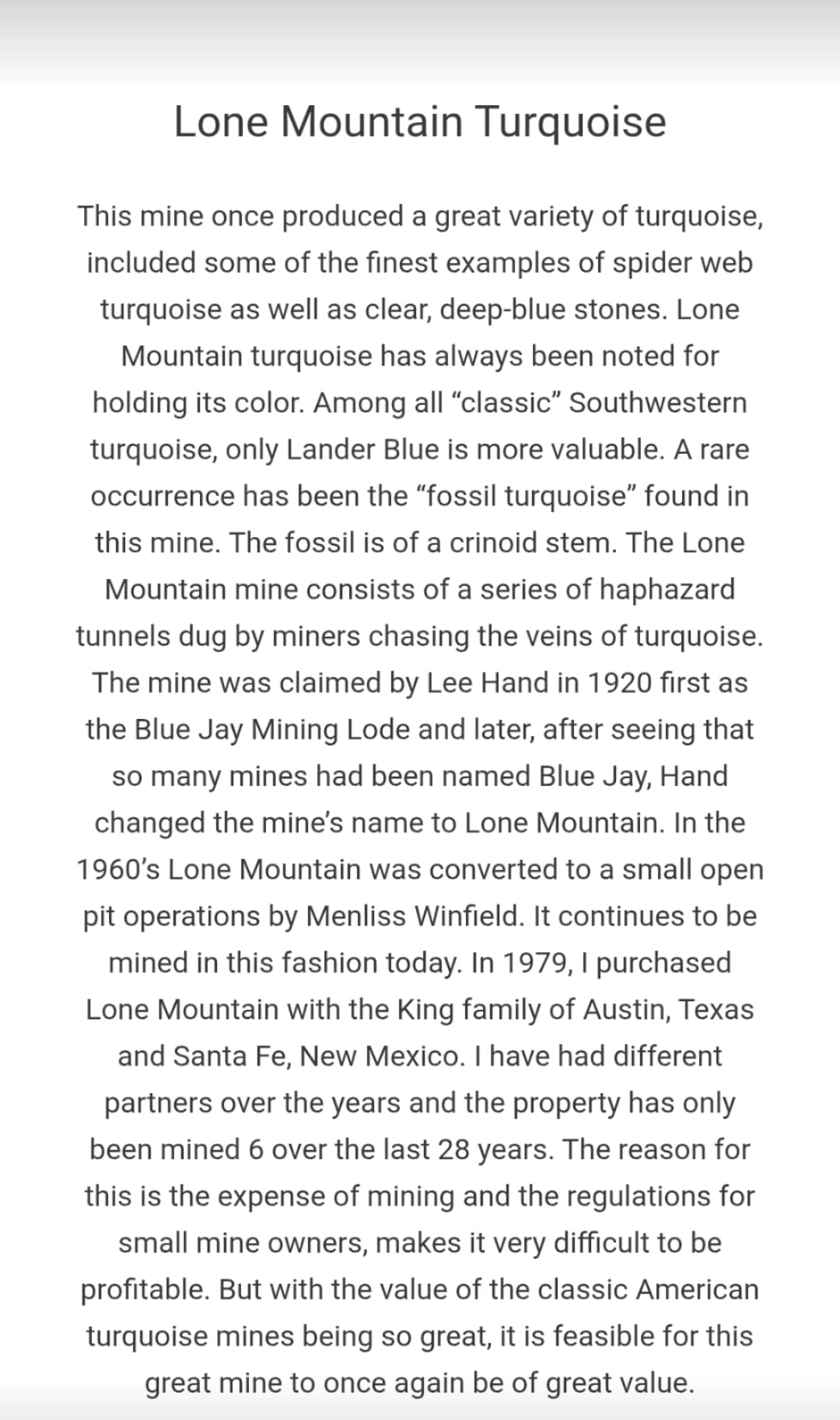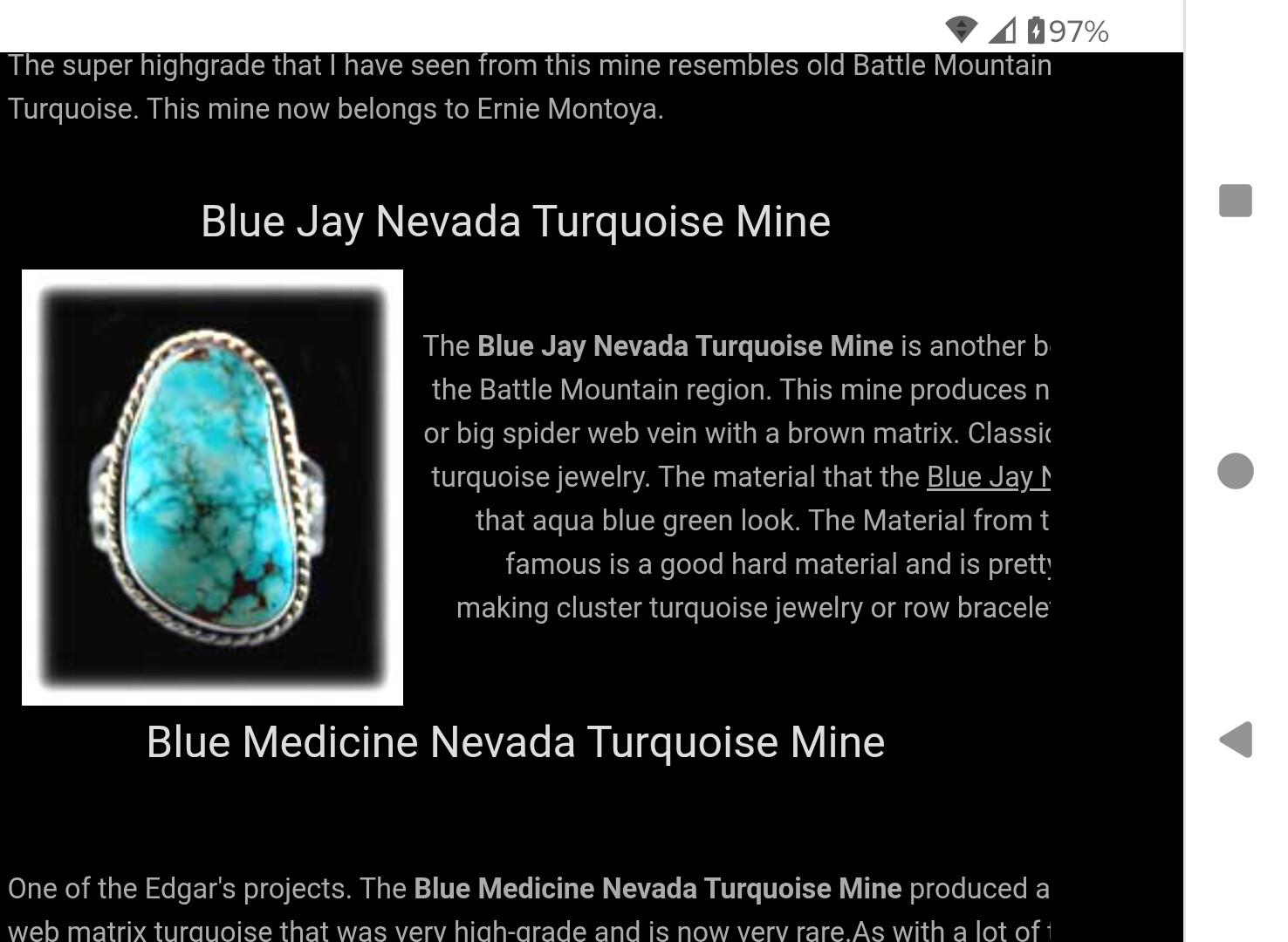 The Blue Jay Turquoise is interesting. I found a couple places (including the Perry Null site) that said the Lone Mountain mine was originally called the Blue Jay Mining Lode, but later changed (this screenshot is from the Pueblo Direct site).