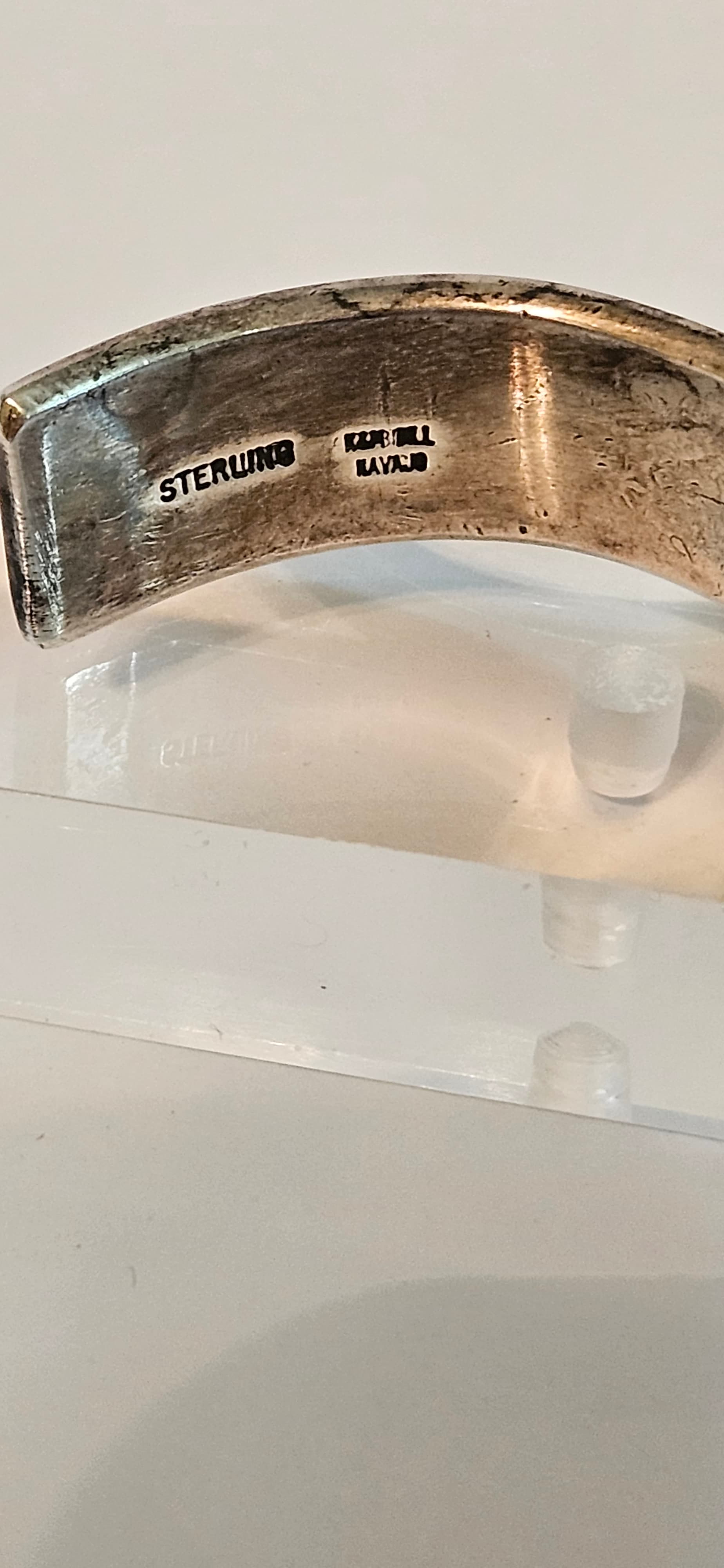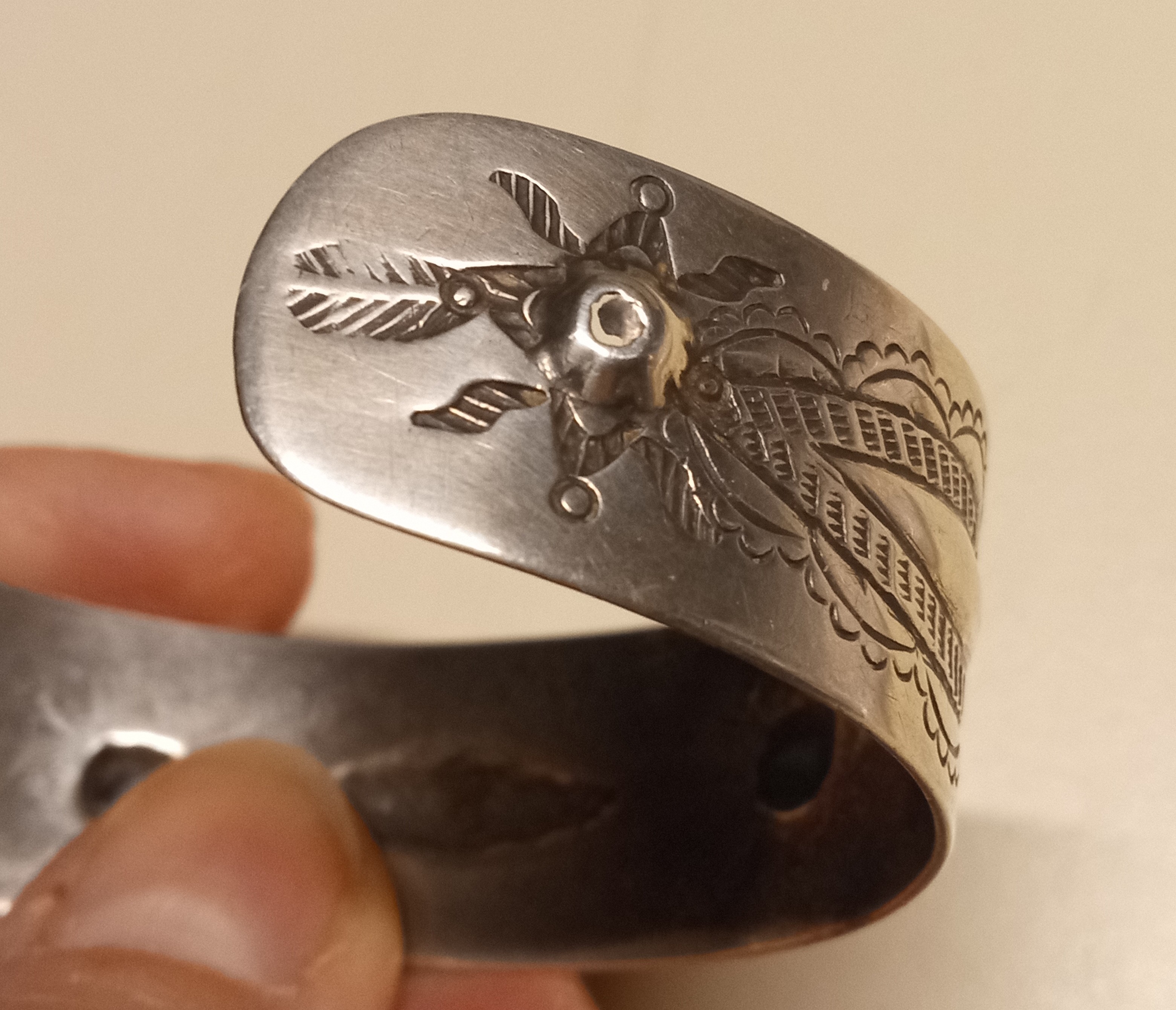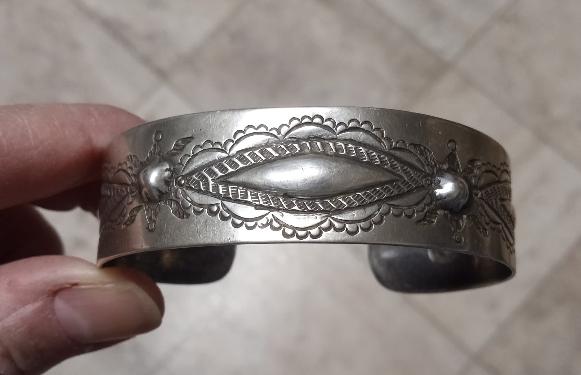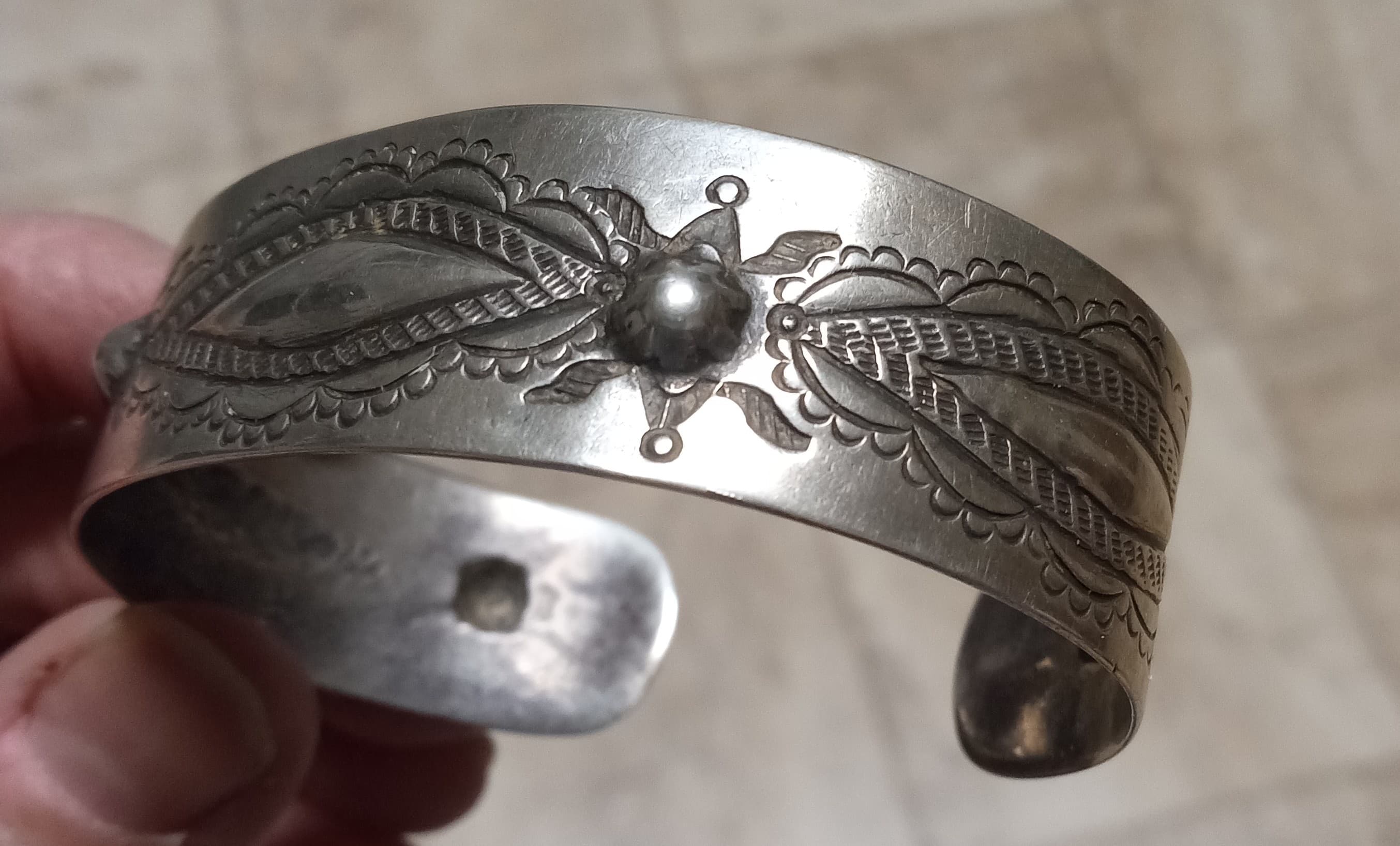 The repousse bracelet was found in his mother’s things after she died. We don’t know anything about it. She was from Isleta Pueblo. She had a mixed assortment of Native jewelry, lots of different styles, but nothing really great. No marks at all.