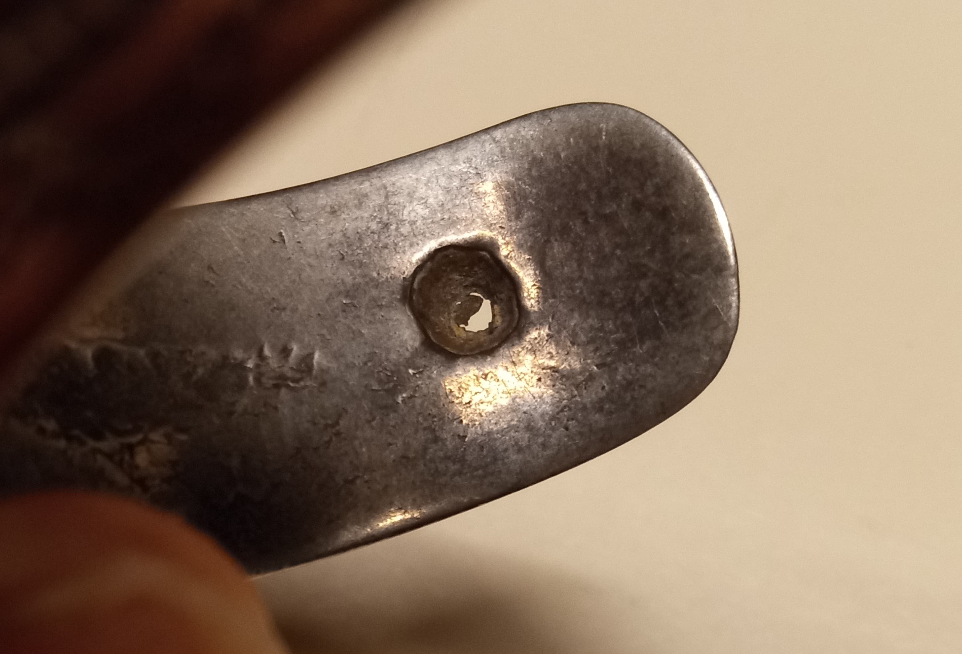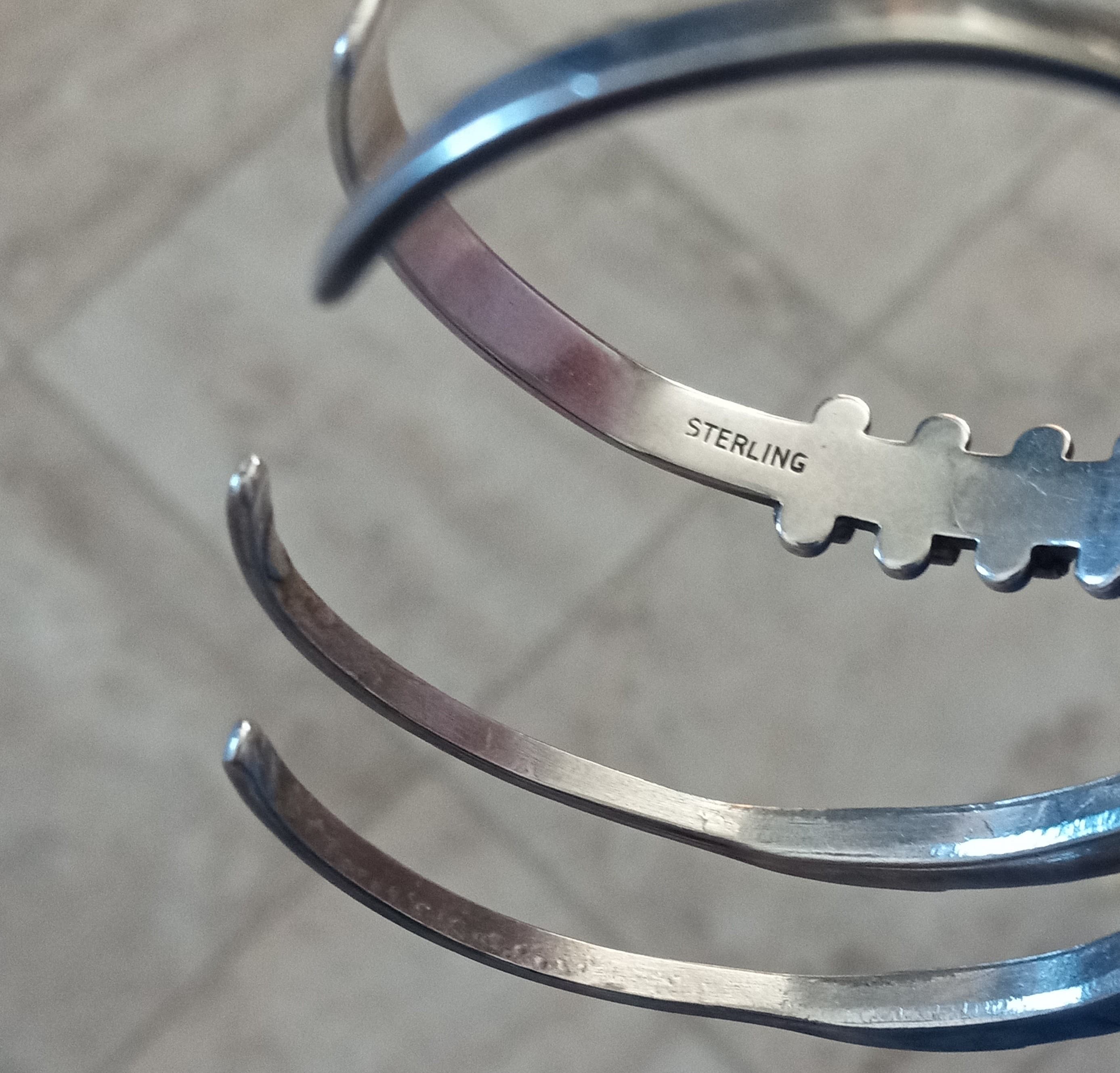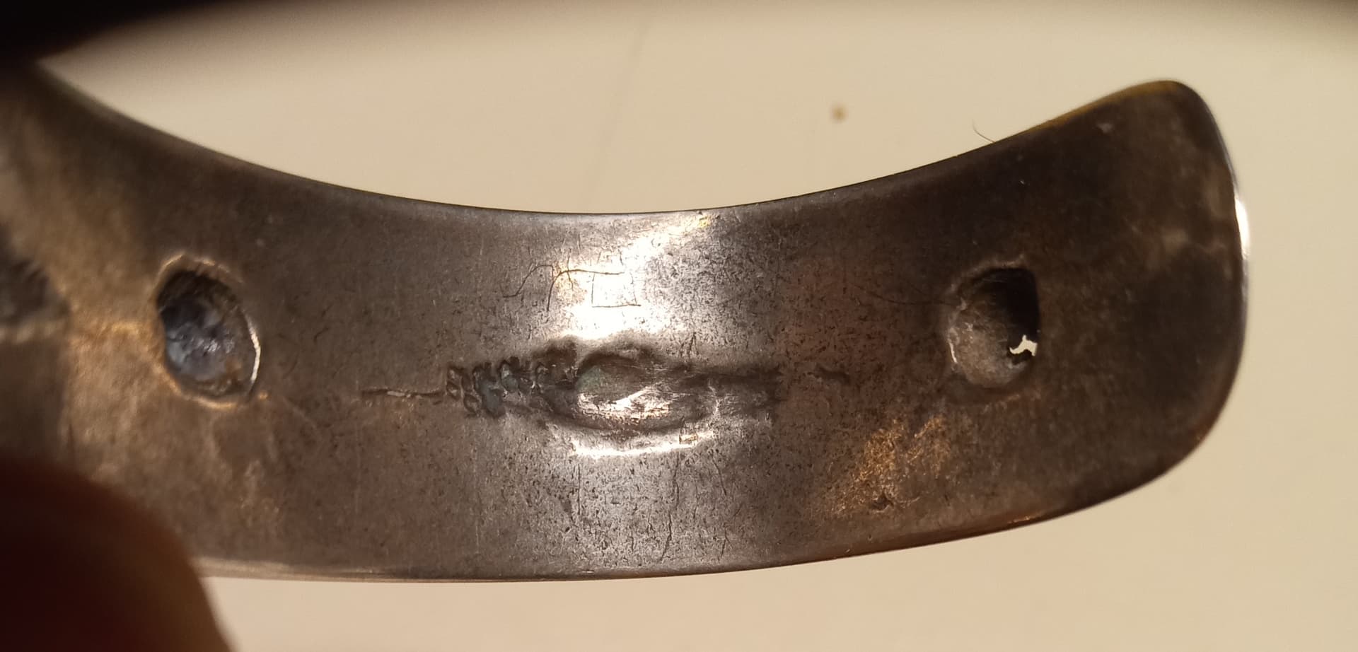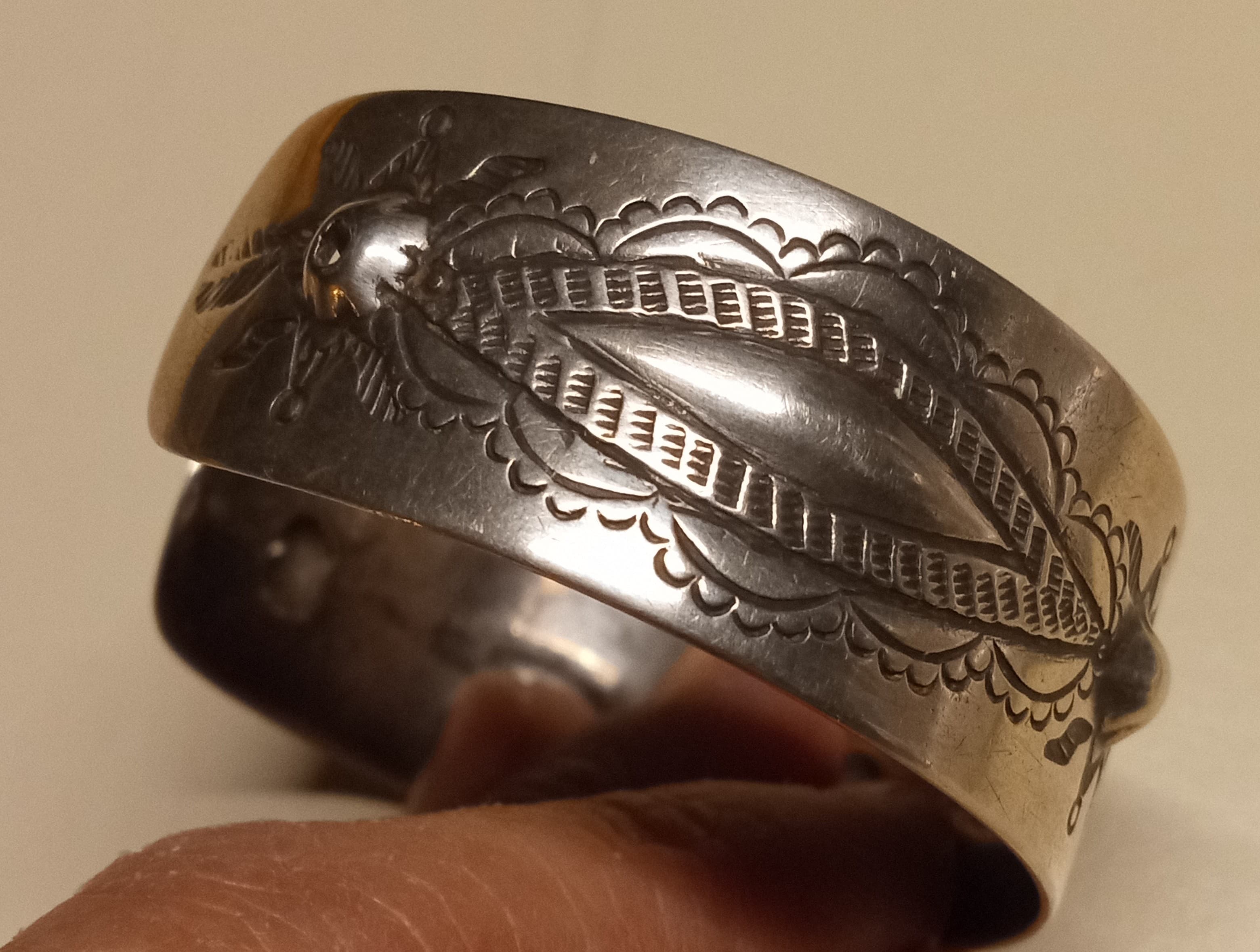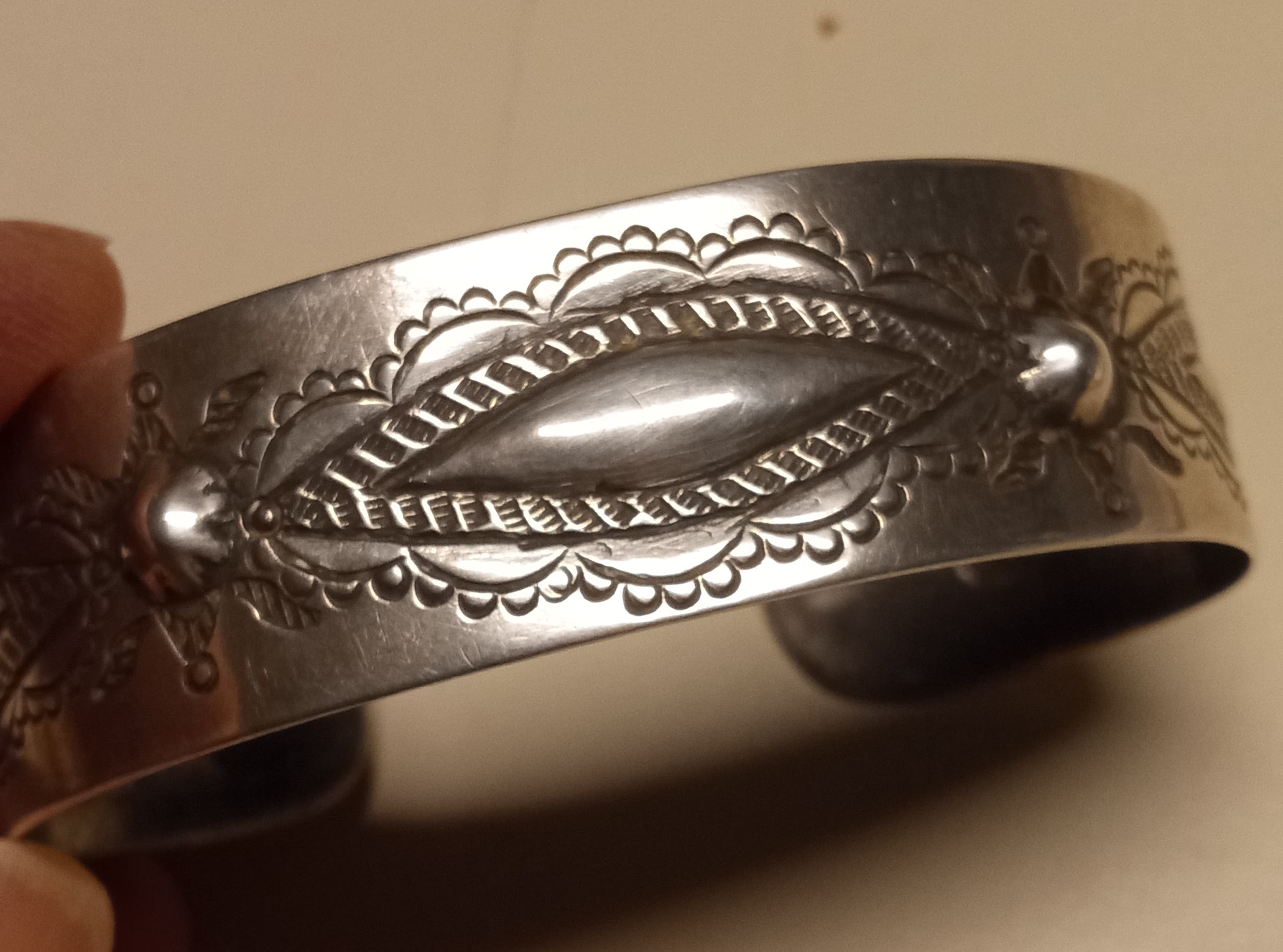 Can you share a pic of the inside surface of the shank of the vintage silver with repousse cuff? It’s got a great look to it and could be an early one, esp. if the silver is right and the repousse is hand worked. Would also like to know its gram weight.