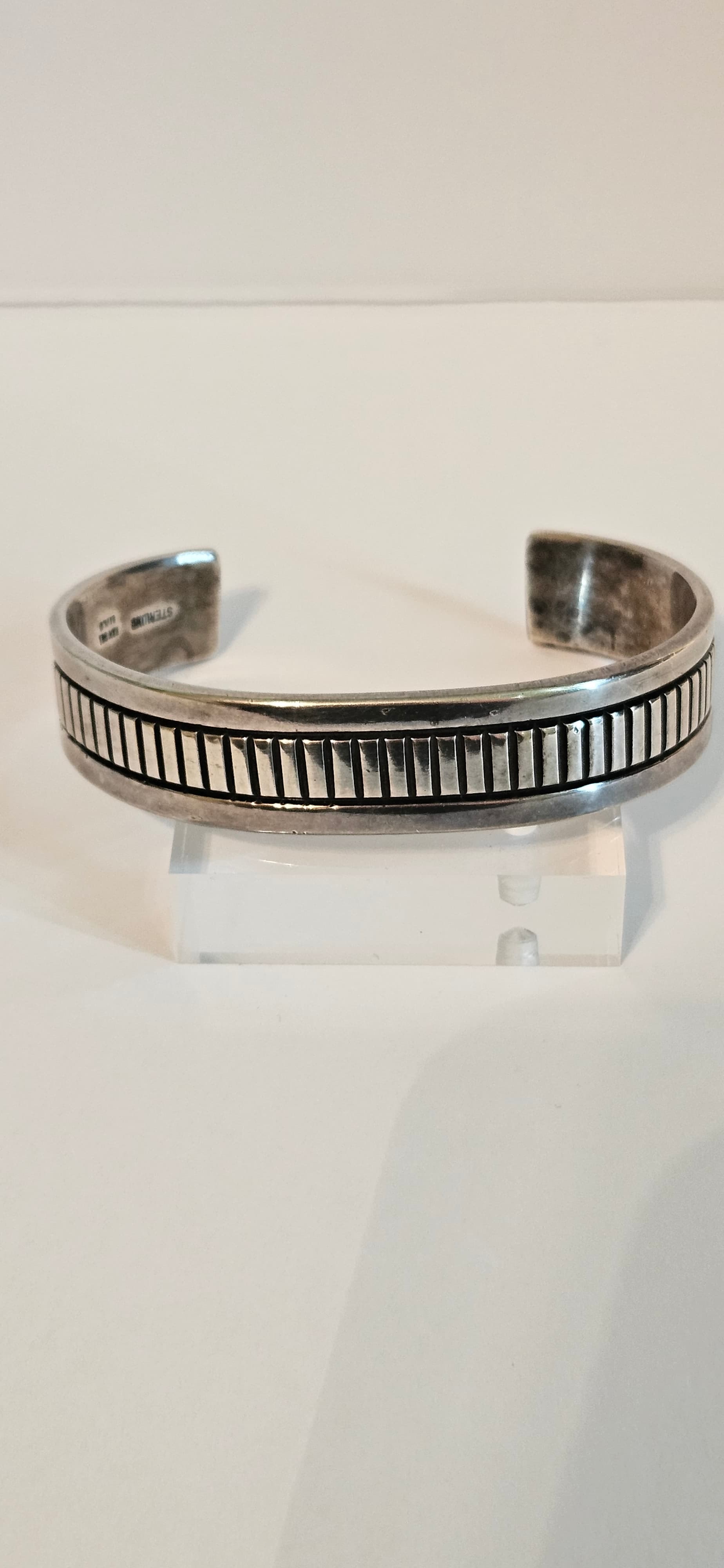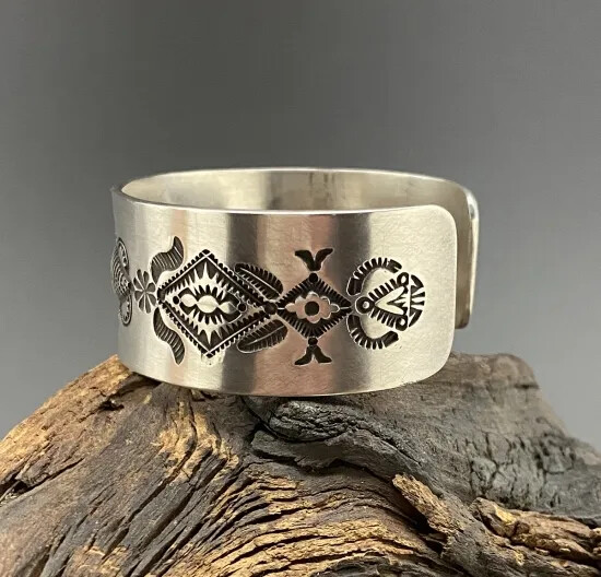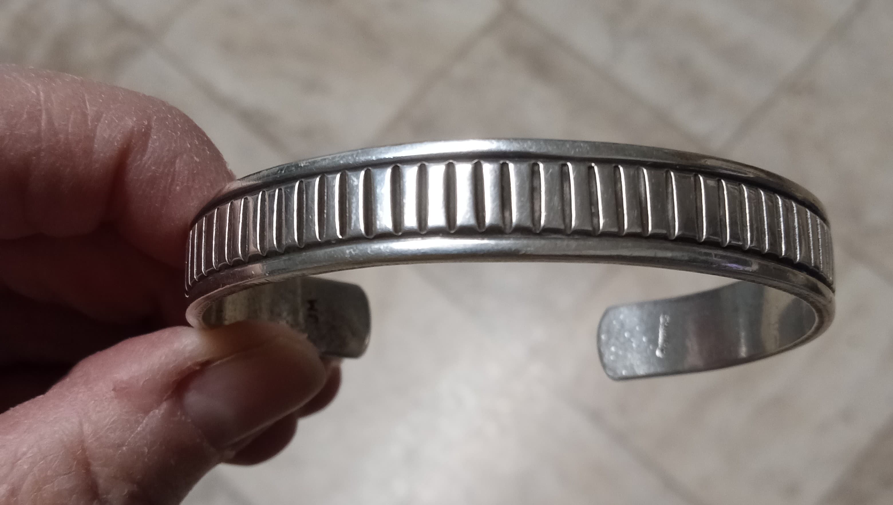 The straight line stamping in Stracci’s other bracelet has been a traditional technique in Navajo, and other ethnic silver work for centuries. We have used it in the shop ourselves since the 80s in different variations and sizes. When Bruce uses these patterns, he typically eyeballs the stamping, and they’re typically much tighter with less spacing between the stamps, so I don’t think the silversmith is necessarily related to Bruce in any way. I will remark that the spacing is very precise and straight, so whoever made it likely used a divider, and ruler first to mark off stamping segments. Very nice work.