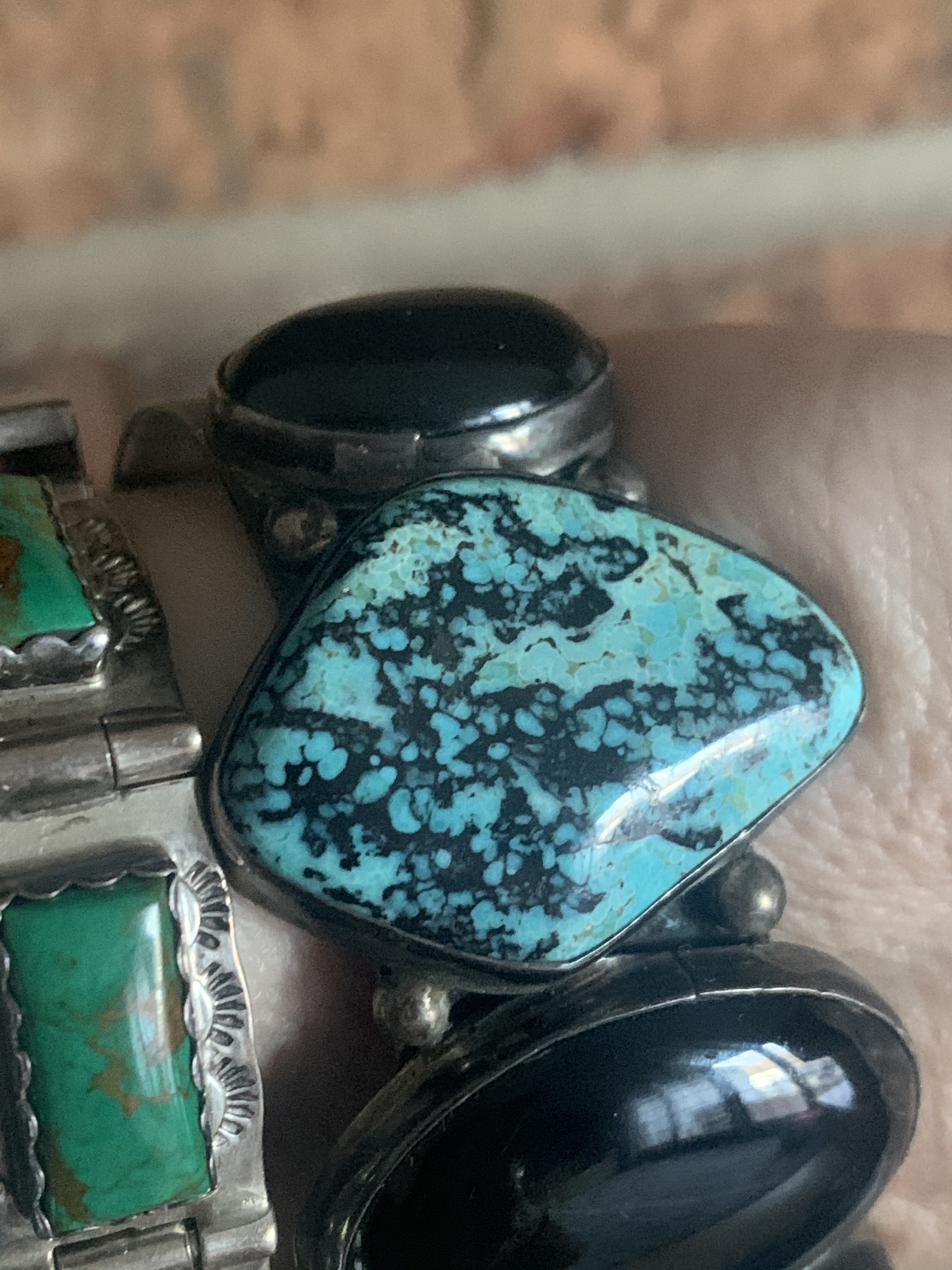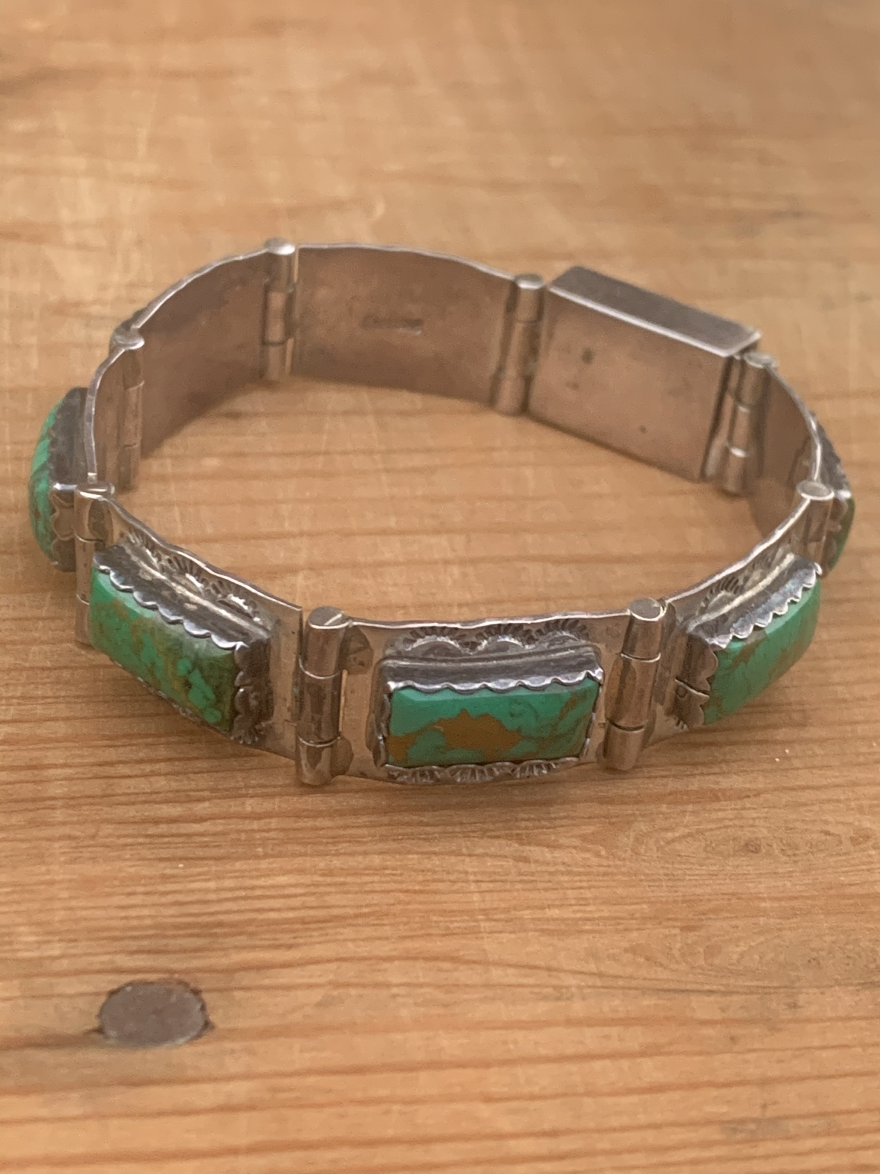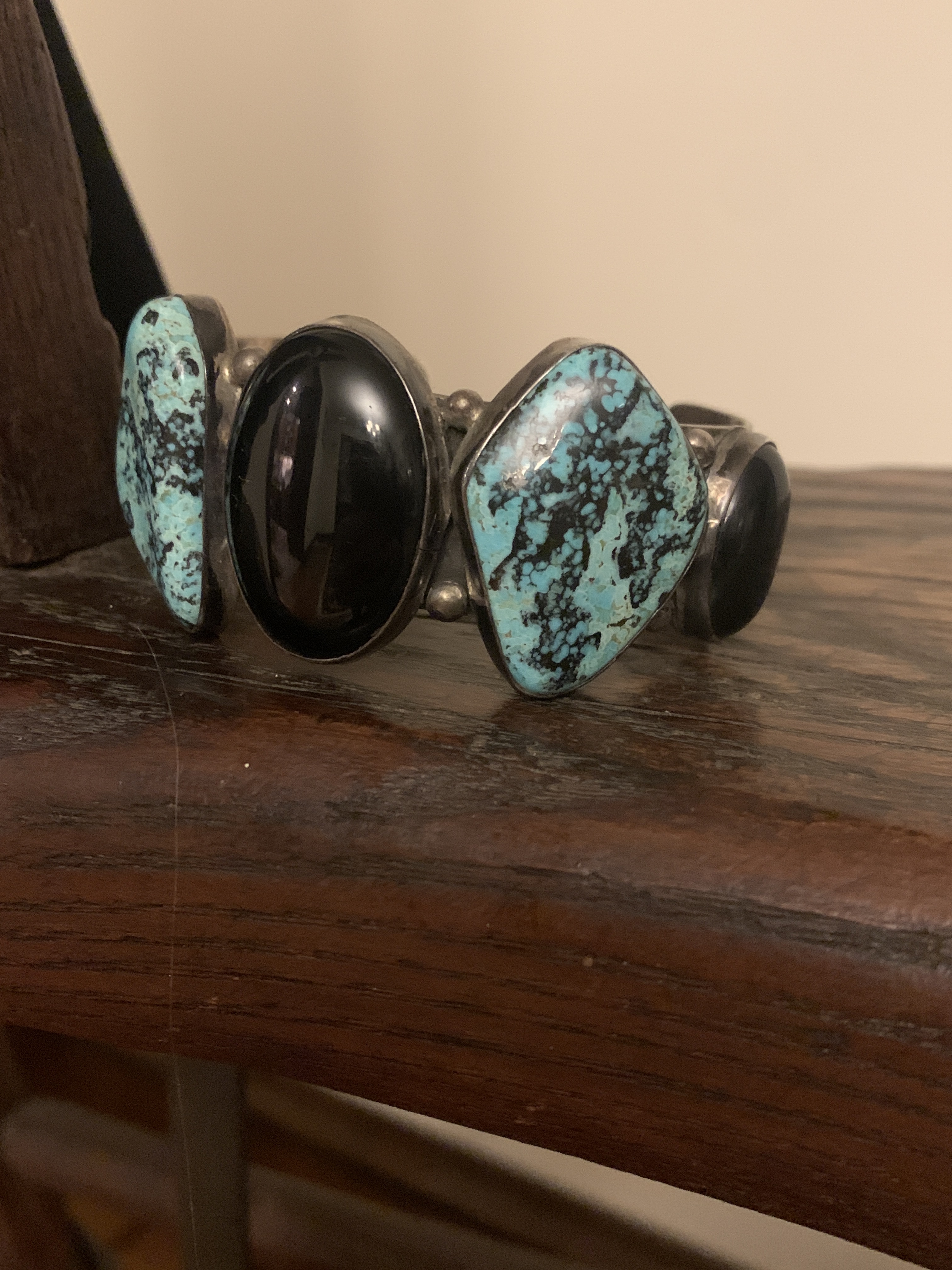 Yeah I am stumped on the Turquoise. It really looks like it has been dyed or something. The smooth bezel and the simple construction is very reminiscent of Taxco. Maybe Jason will weigh in on the Turquoise. Pretty though!