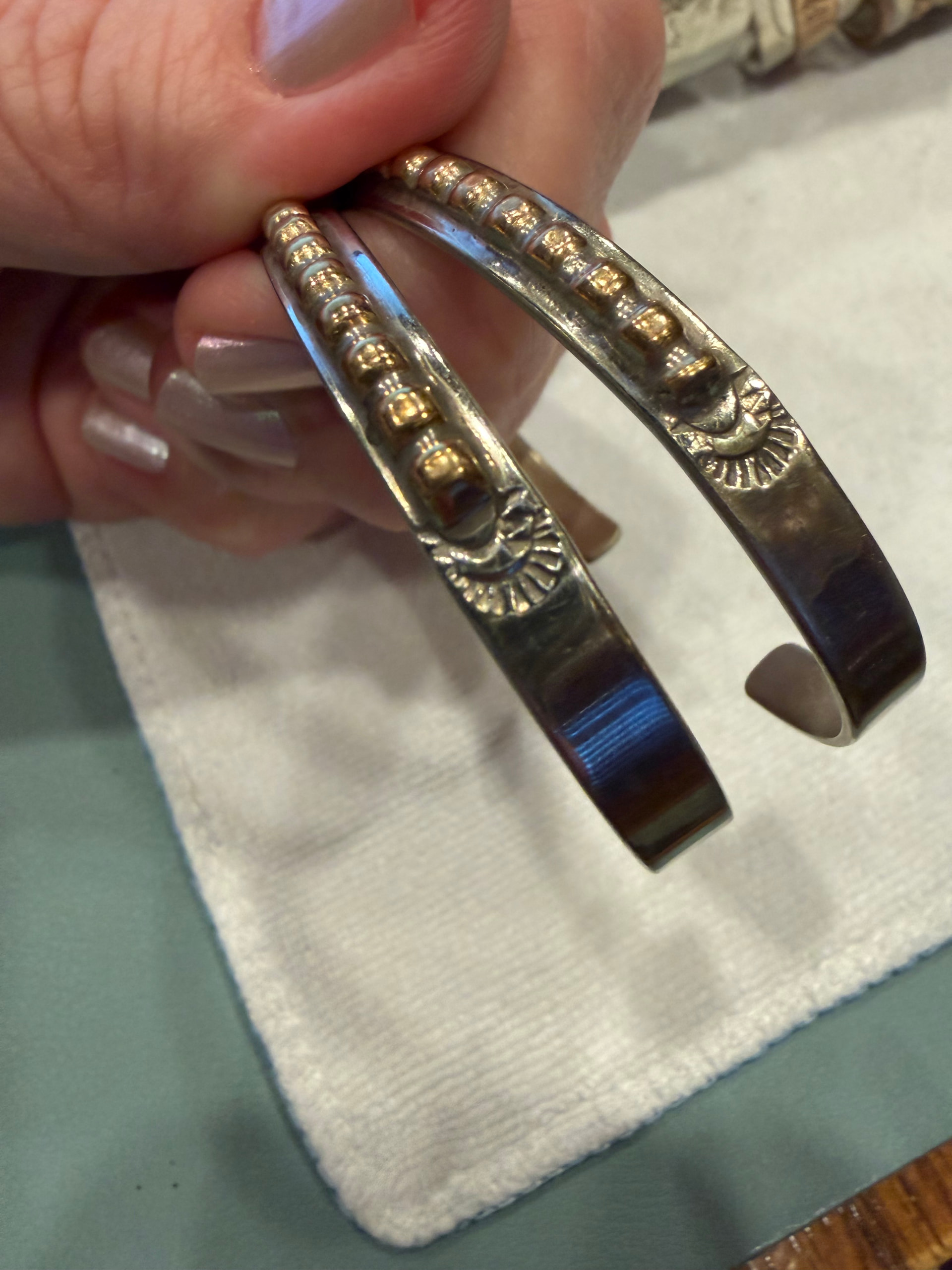 Hello and welcome. It would be helpful to see separate photos front and back for each piece (in natural lighting ideally), with clear images of any stamps/hallmarks. Can you tell us where they came from, how they were described and sold, and if they were stated to be Native American made?