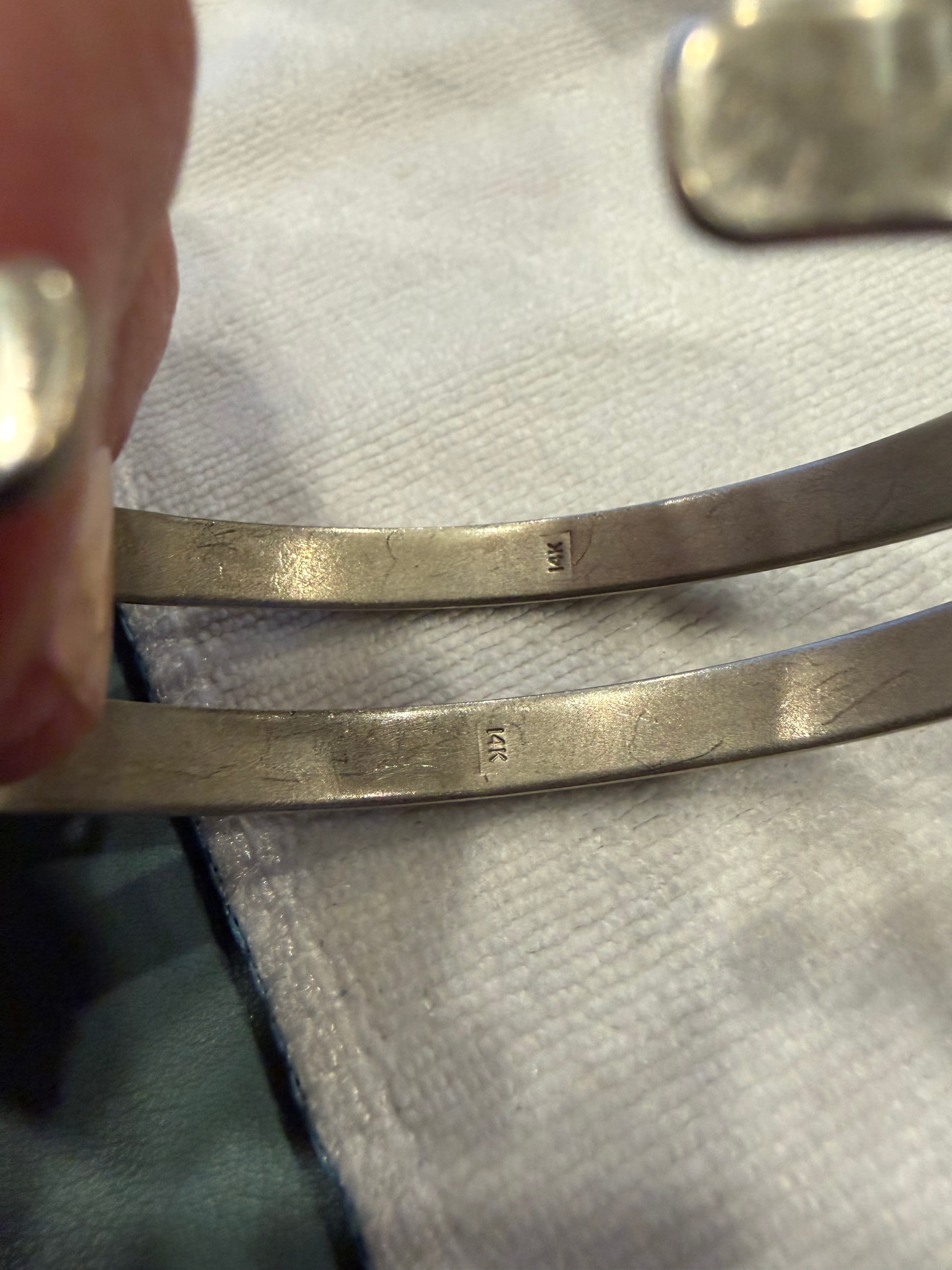 Thank you.. This reinforces my impression. Everything about these, from the color of the metal, to the gauges used, to the workmanship indicates to me that the yellow metal used is unlikely to be solid 14K, and is likely 1/20 12K gold filled material, or something else.