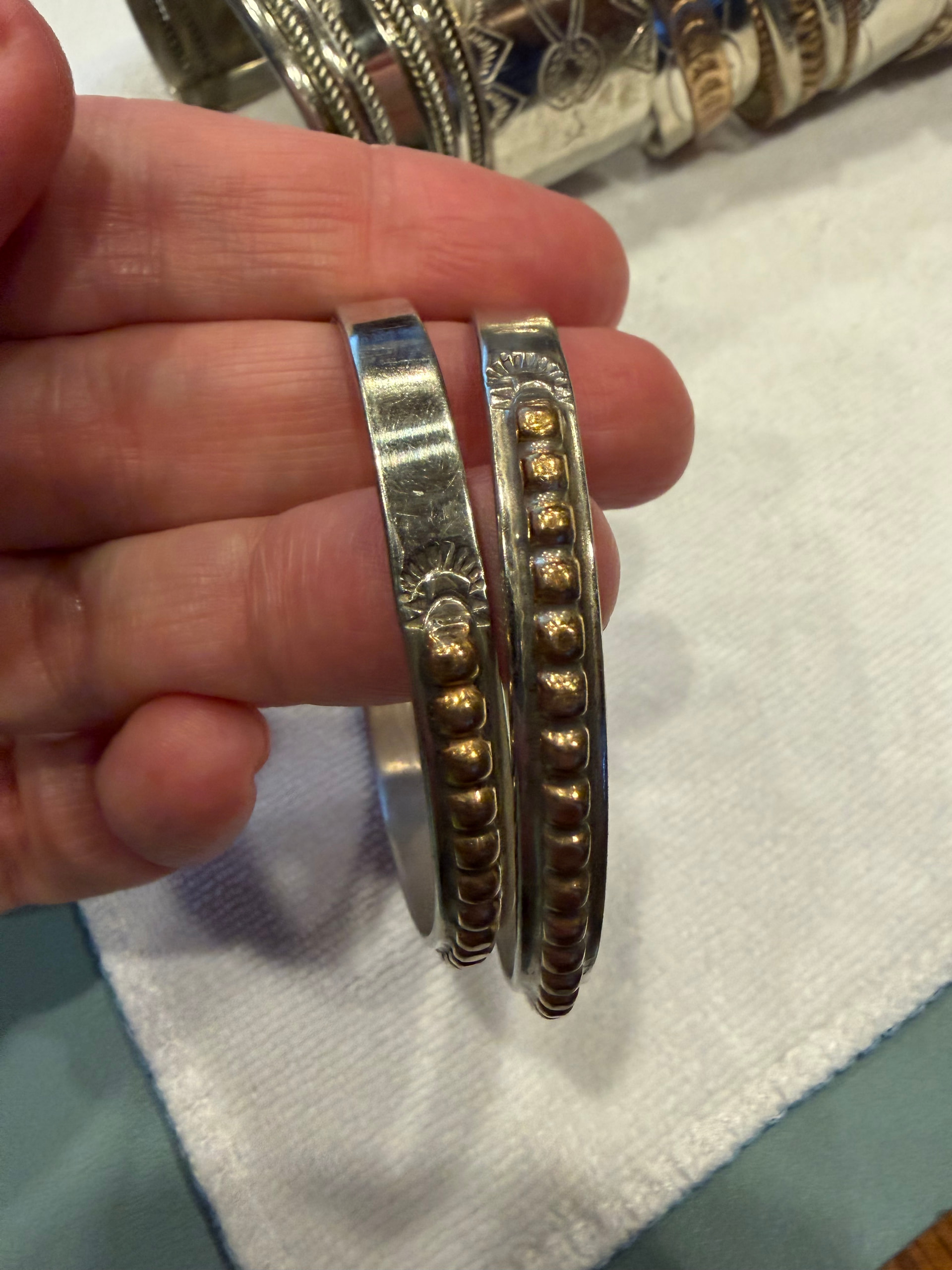 This is my first post. I would love to know more information about these bracelets. They are beautiful and I would like to understand their meaning as well as their origins, if possible. Several are hallmarked and most are stamped STERLING and the gold ones have 14K on them. I can post more pics if anyone is interested.