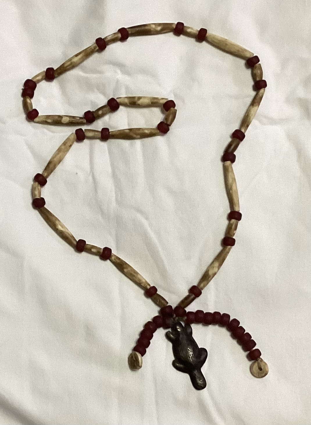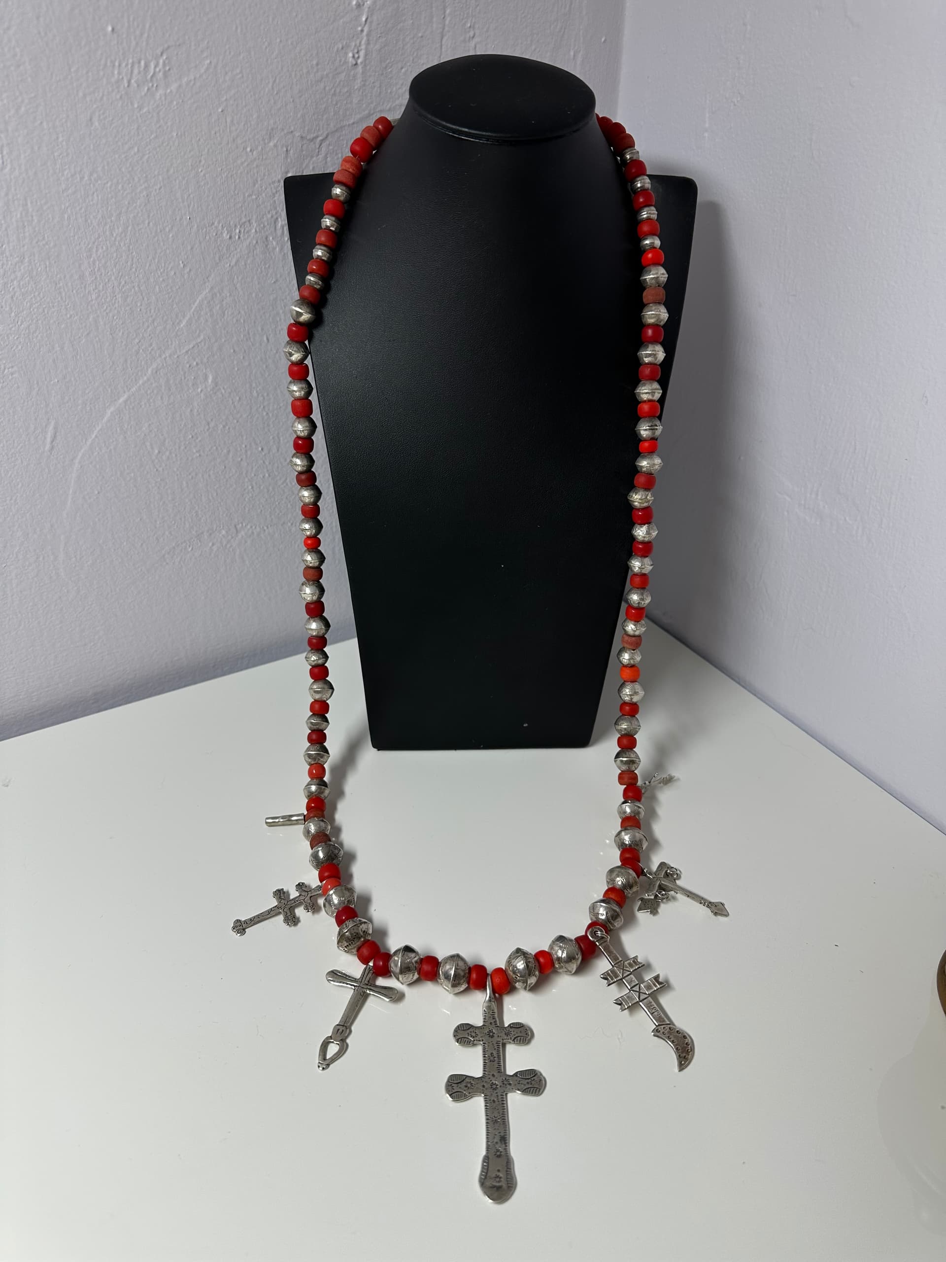 Your necklace resembles the Hudson Bay fur trade silver. You often see trade silver strung on red glass beads. Your crosses look modern when you compare them to originals. And the silversmiths usually put their mark on it. Your conjoined HB does not resemble the old mark. The silver beads look hand made from the photos. Any other hallmarks on the crosses?