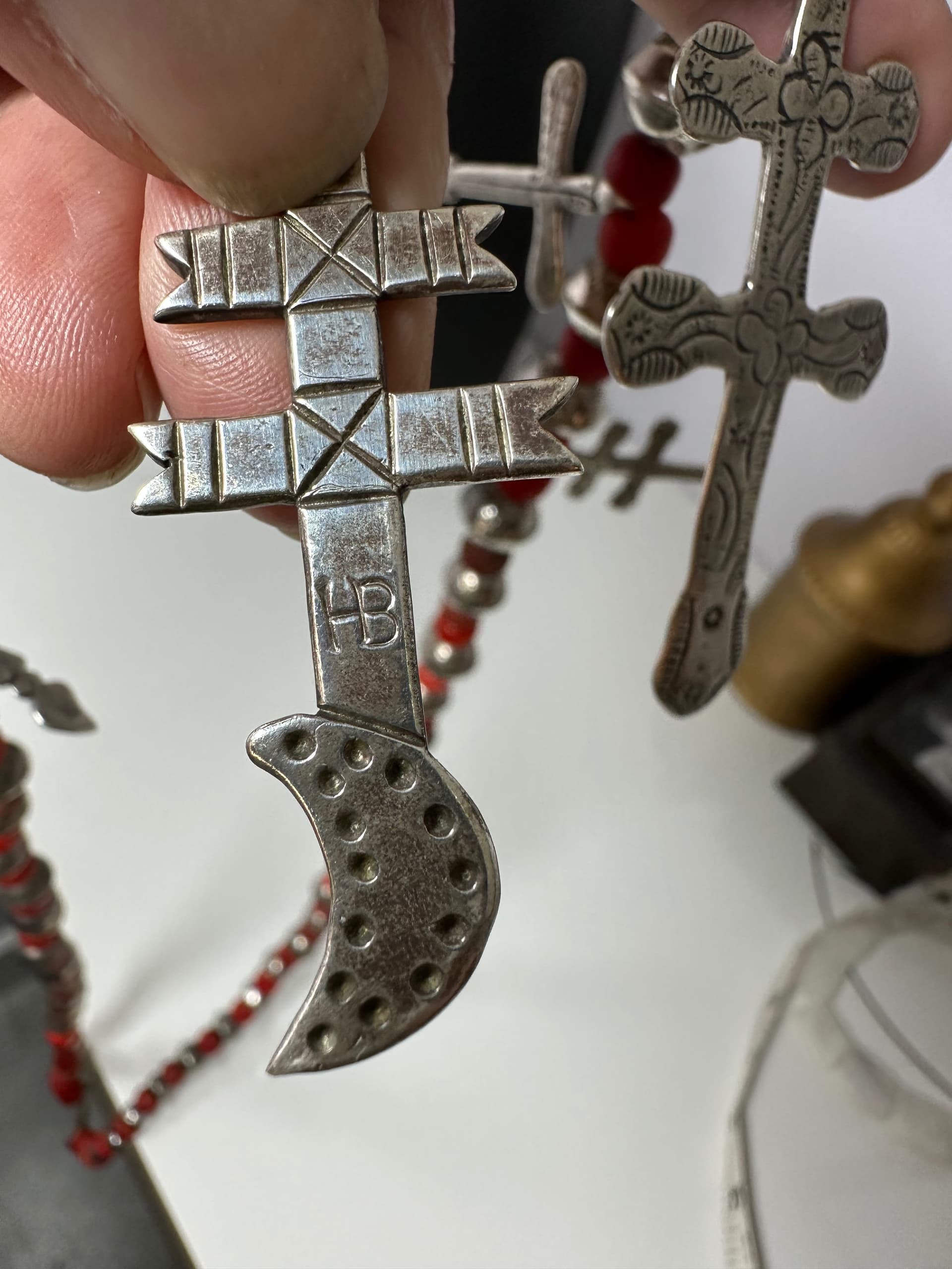Thanks for your reply. The beads are handmade, the cross stamping is worn down as are the stamping on the beads. Double checked again, I missed the stamping and sterling stamp when I pulled it out of the bag of necklaces. When I saw the Milagro leg/knee I immediately thought it was Mexican. And yes, they still do not look as old as the crosses in some of the photos I pulled up. I’ll check out Hudson Bay. HB. Again, thanks for the info.