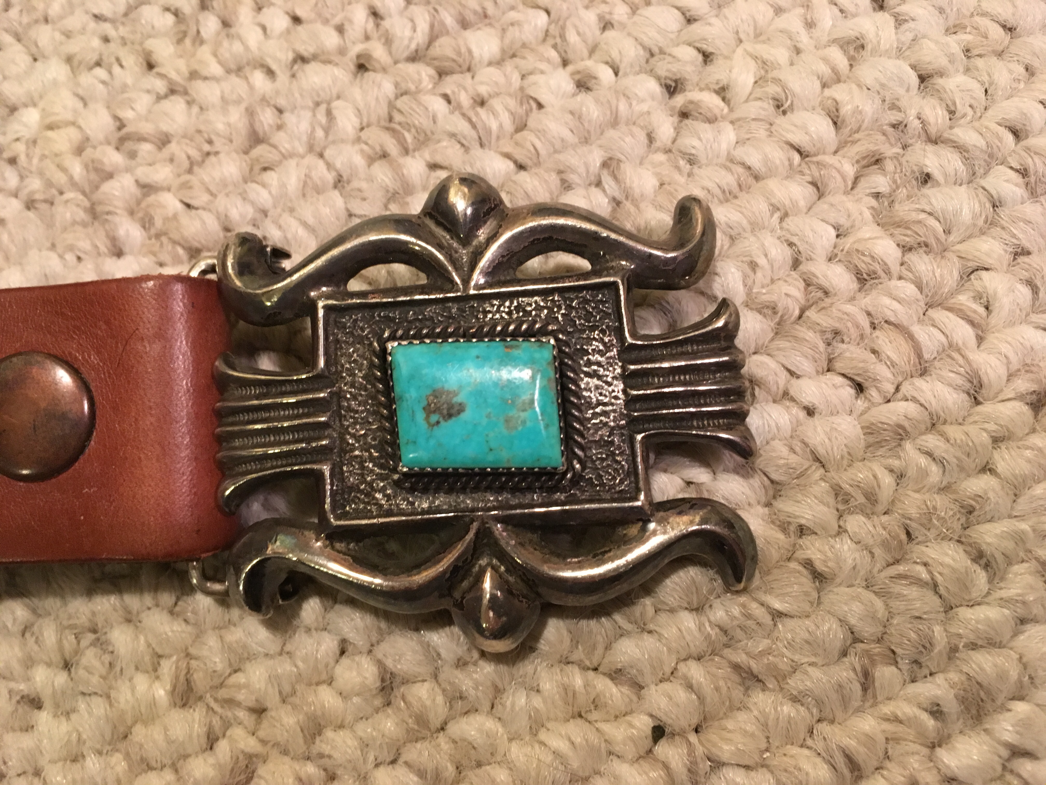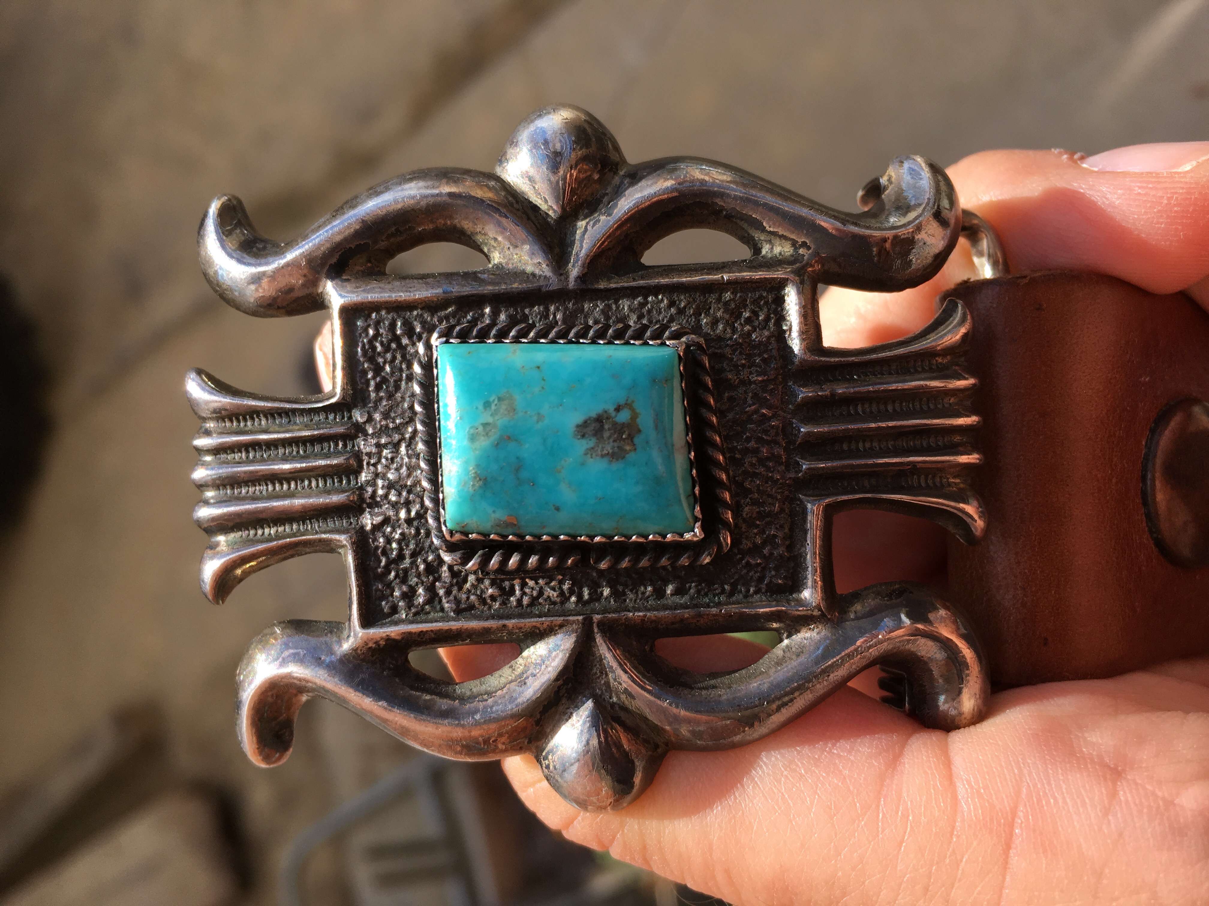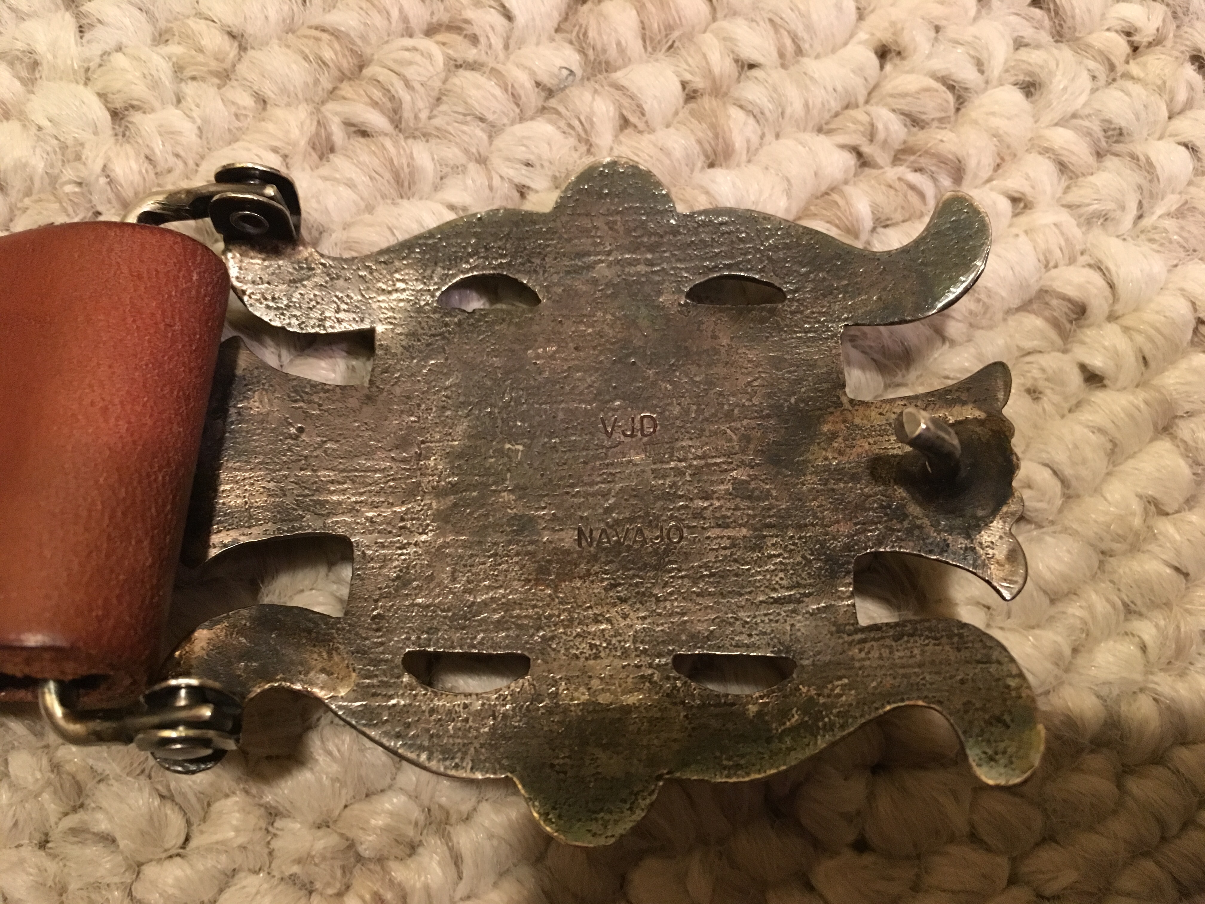 Anyone have any idea of the maker or age of this buckle? Or turquoise type? The back is stamped VJD Navajo. I couldn’t find it in Hougarts.