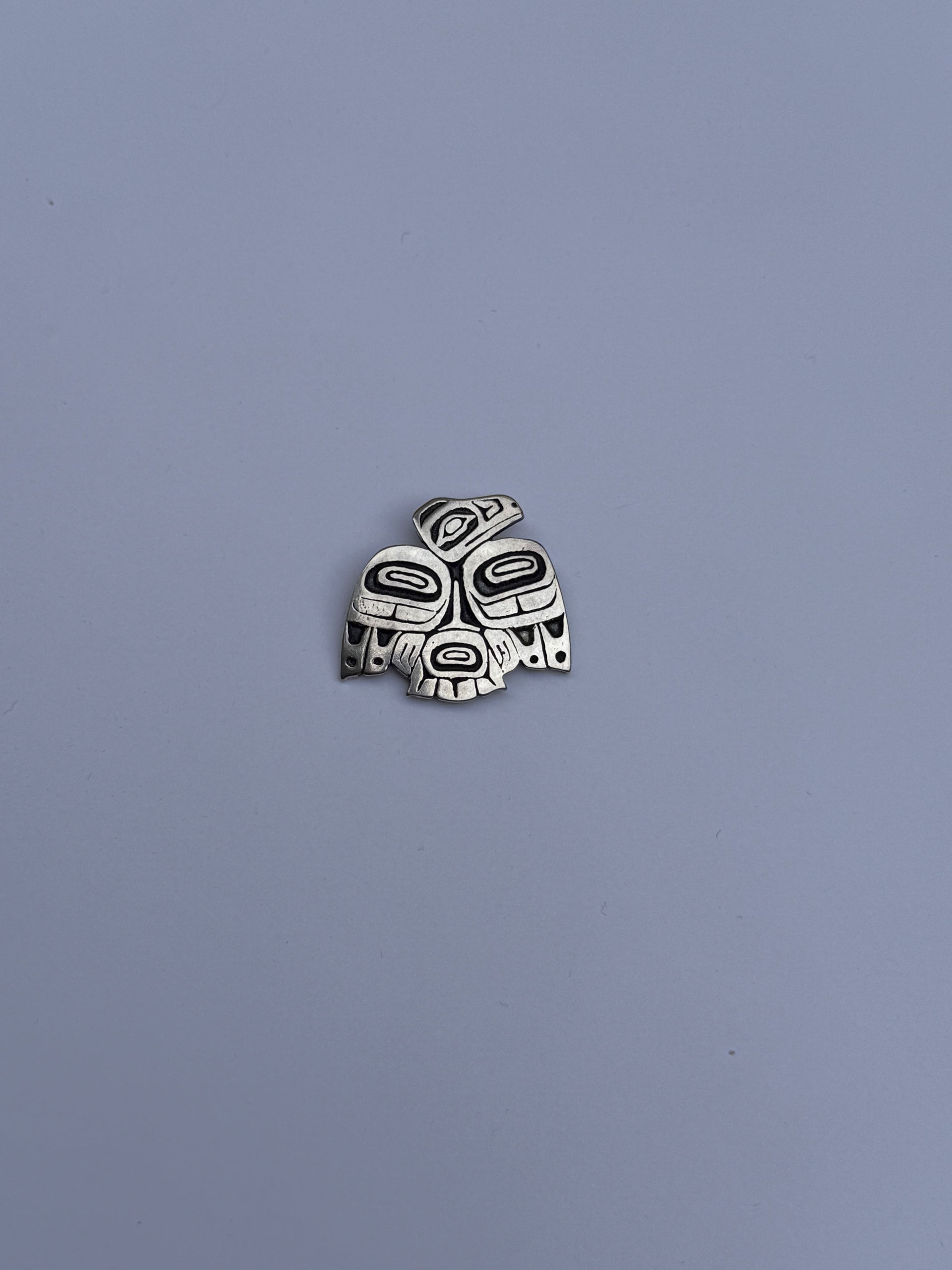 Your pendant is exactly this; You have a flattened eagle head with an ovoid eye and split “ U “ design beak, ( I say Eagle because of the subtle ear structures atop the head and sharpness of the talons below), followed by two ovoid devices which represent the shoulder joints of the wings, then split “ U “ wing feathers, another ovoid device representing the Eagle’s belly or its pygostyle, then two sharpened talons and finally tail feathers.