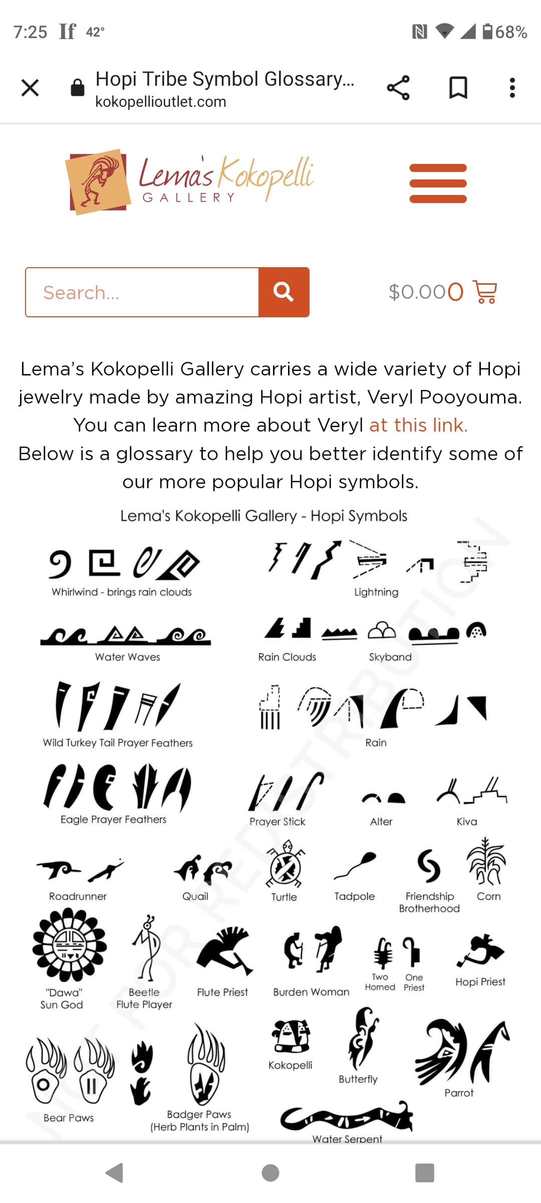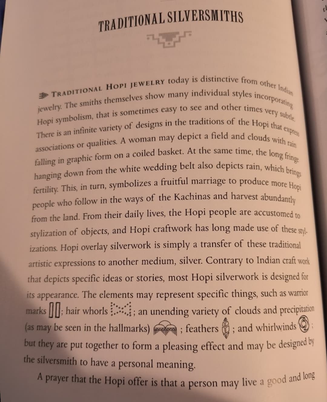 I snapped a couples pics of some info in a book I have on Hopi silversmithing (sorry so small). My book does not have a list of the common symbols, but I thought this is interesting.