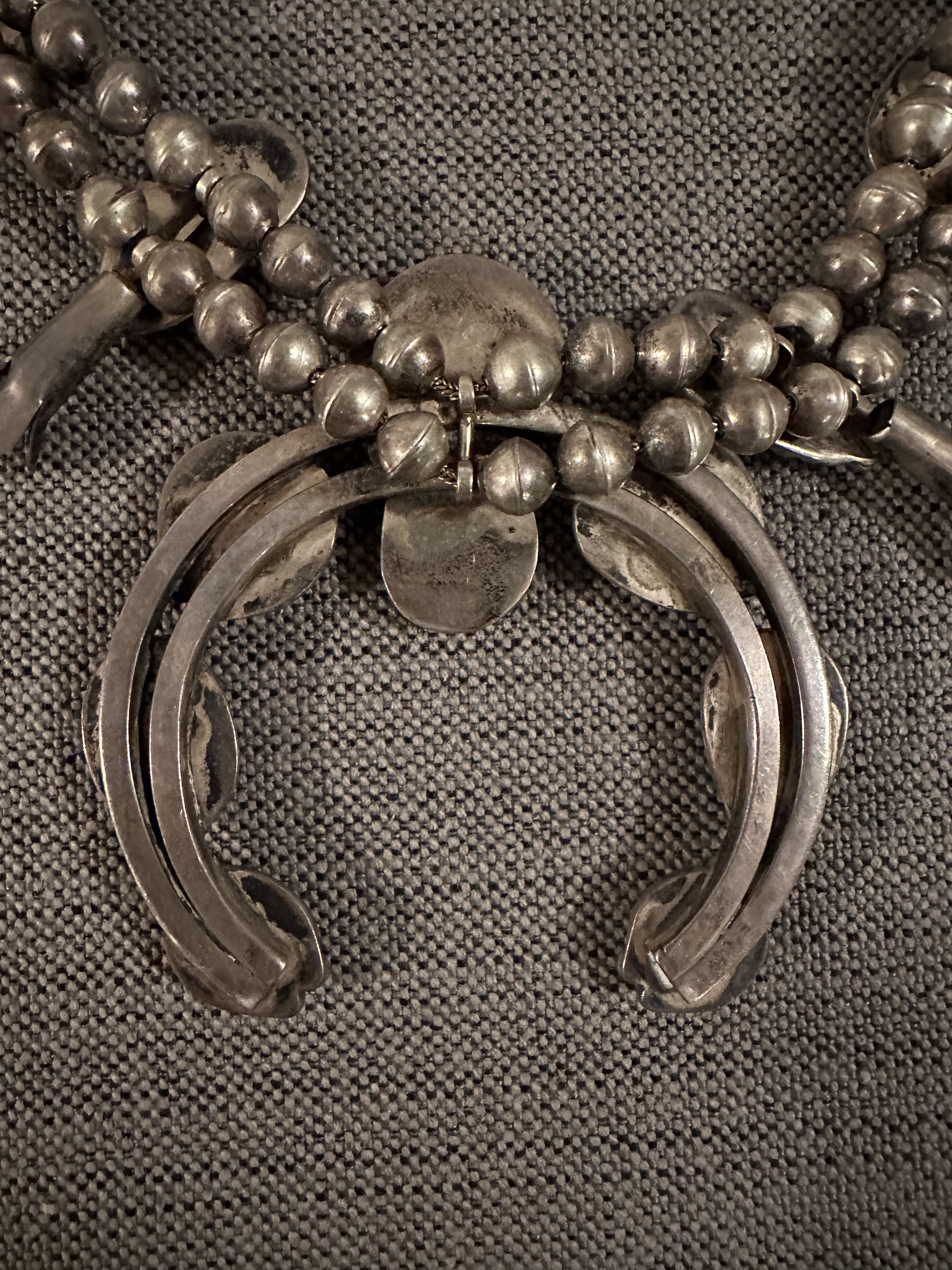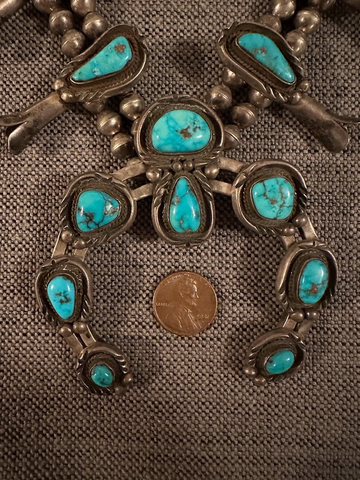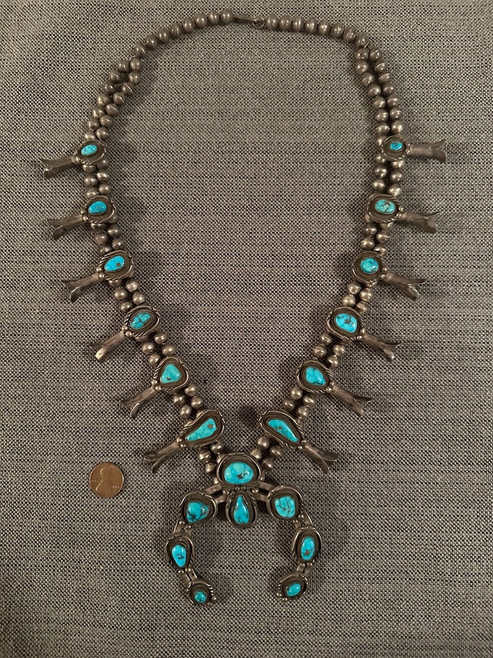 Hi all- My grandfather purchased this squash bloom necklace on a trip to Northern New Mexico/Arizona in the 1960s. I can find no maker’s mark on the necklace. It is relatively heavy but it is not magnetic. It looks like there is pyrite in the turquoise.