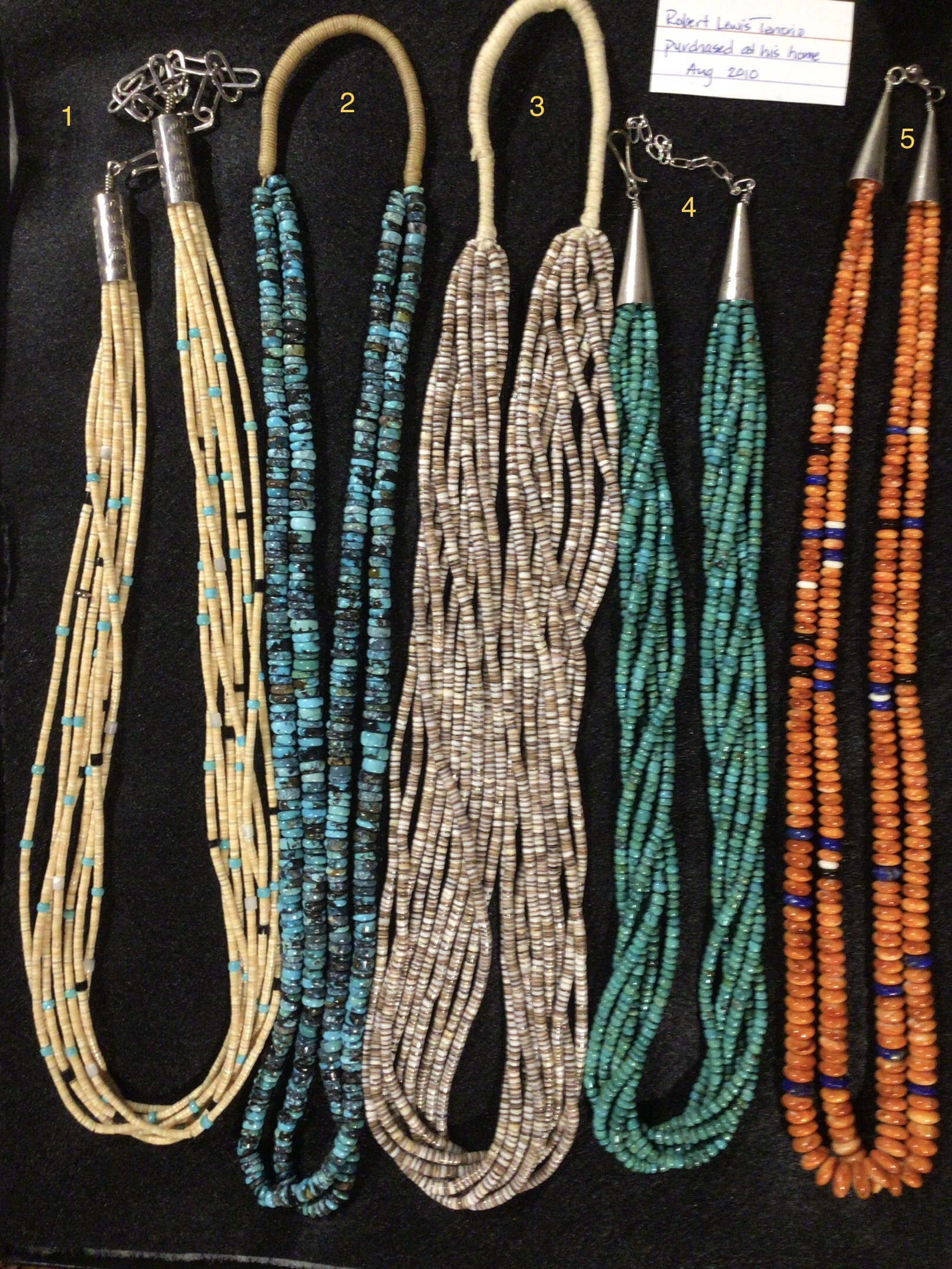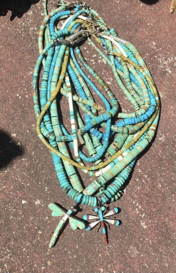 These really don’t look like Tony Aguilar’s work. It is hard to say where they are from as so many of these style of necklaces were made for the tourist trade, not all of them came from the Santo Domingo pueblo.