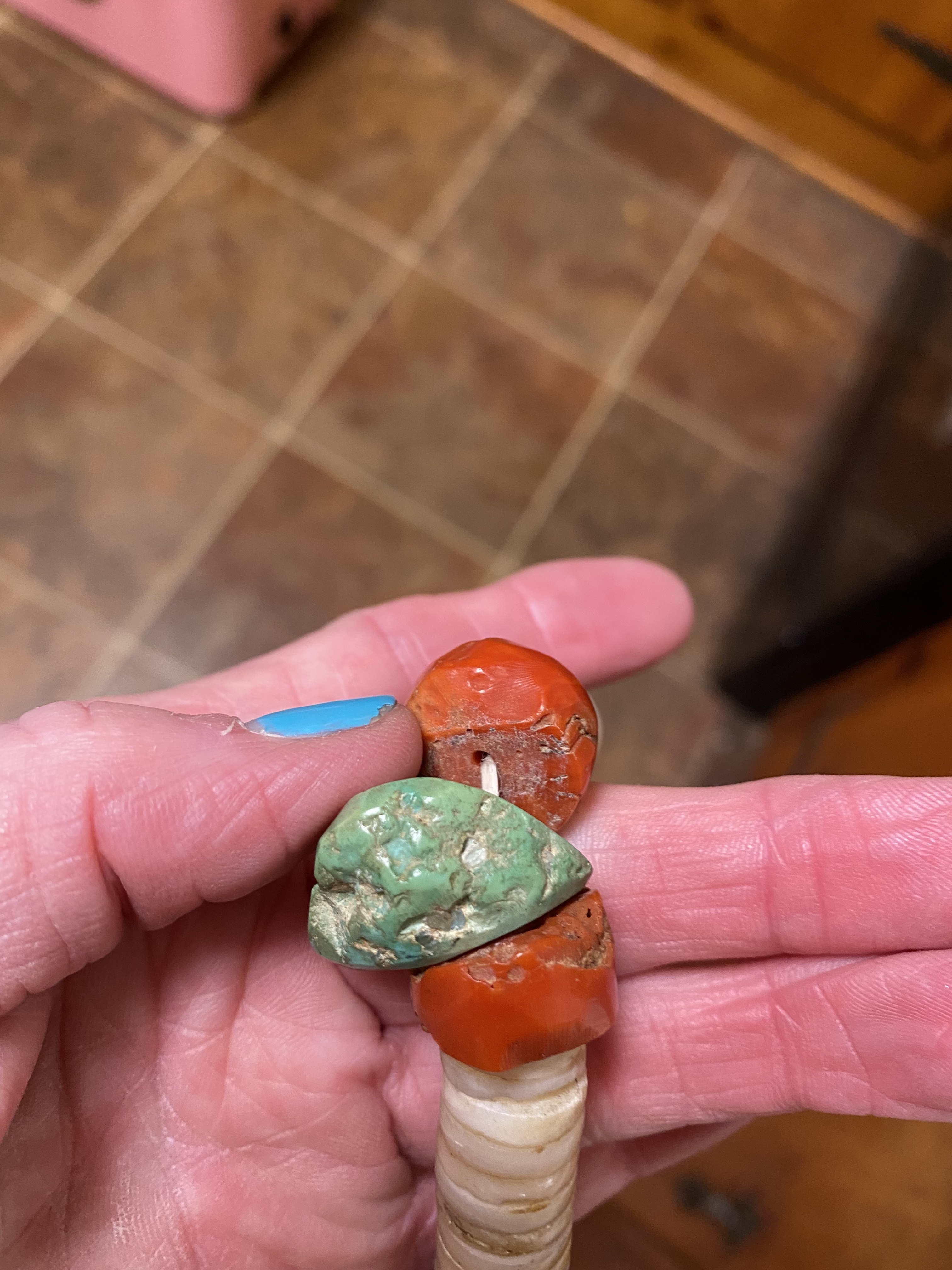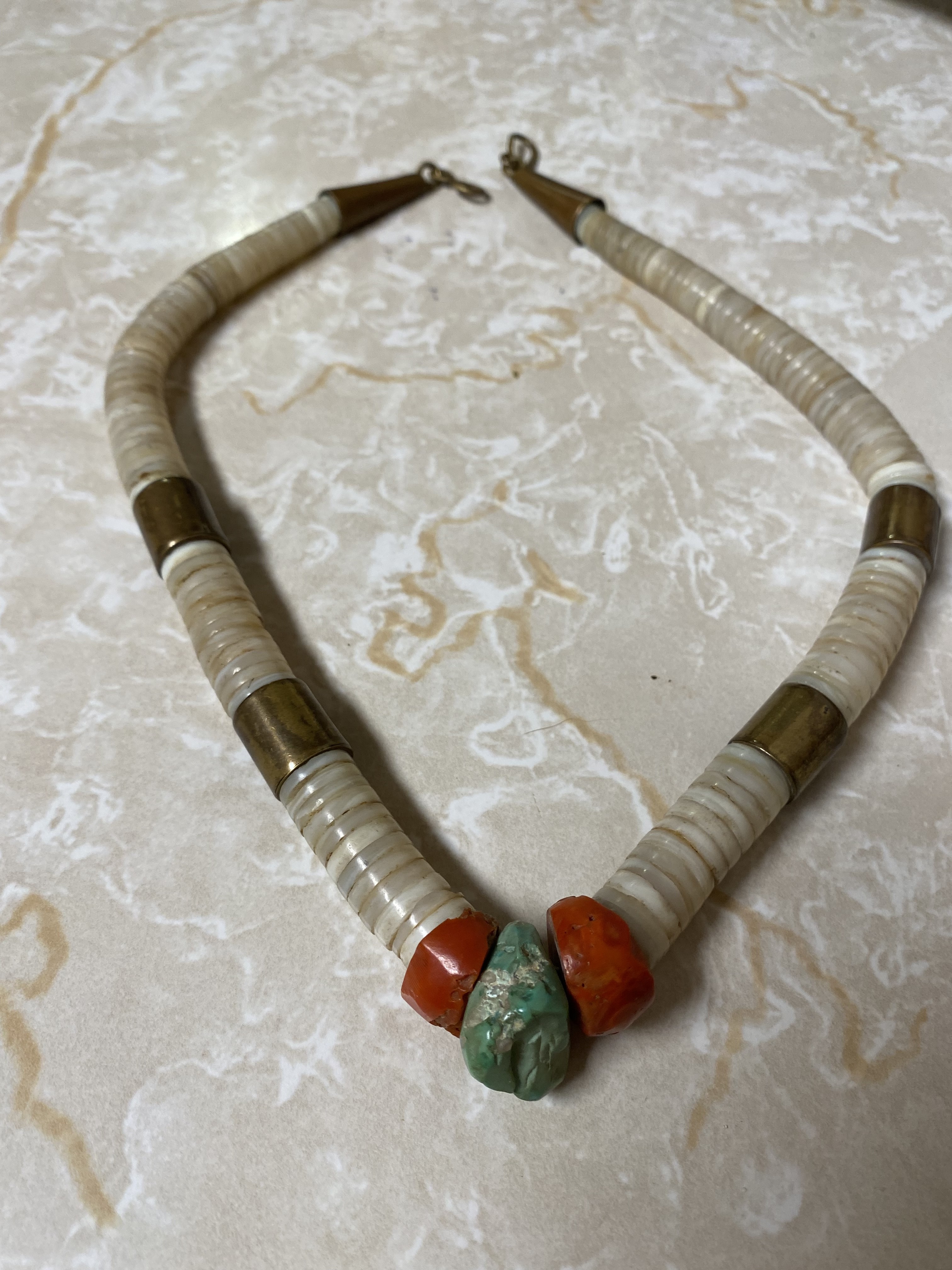 I’m wondering about these Santo Domingo Necklaces! This first one has brass beads and clam shells,W/two large coral beads and one turquoise bead for a center! Im wondering if it may be Tony Aguilar!