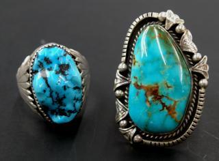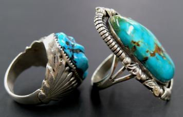 The Zuni piece has a cast shank with a silver leaf design on the sides, plus the stone is cut by the artist, not something you find in local supply stores, but still difficult to determine, luckily this one is hallmarked by Robert & Bernice Leekya. Typical Navajo style split ring shank.