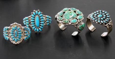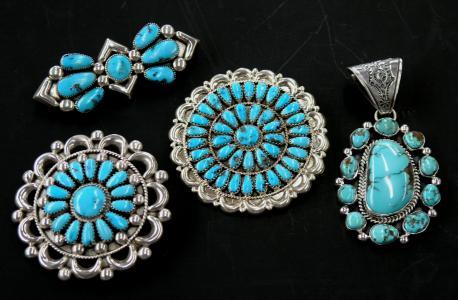 Zuni & Navajo cluster work. The heavier silver is a sign that it is Navajo made. However the two cluster pieces on the left represent a Navajo & Zuni artist.