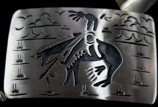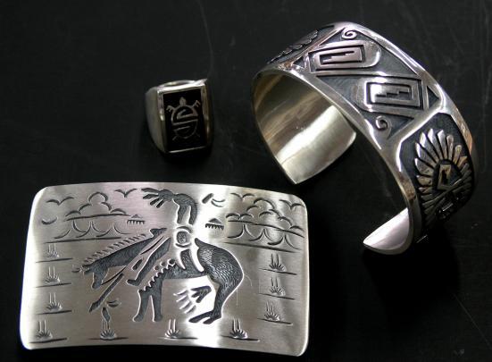 Hopi and Navajo all silver pieces. The buckle is Navajo made, notice the design, the End of the Trail, just don’t see that often if ever depicted in Hopi silver. Plus, notice the shine, the Navajo piece has a satin finish, the two Hopi an nice high shine.