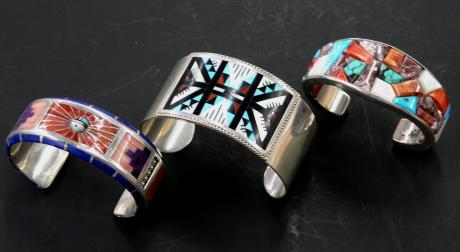 Navajo artists make inlay jewelry, too. However, it usually looks a little different, like on heavier silver or a rough cobble stone style of inlay. The center piece is Zuni, the other two are Navajo made.